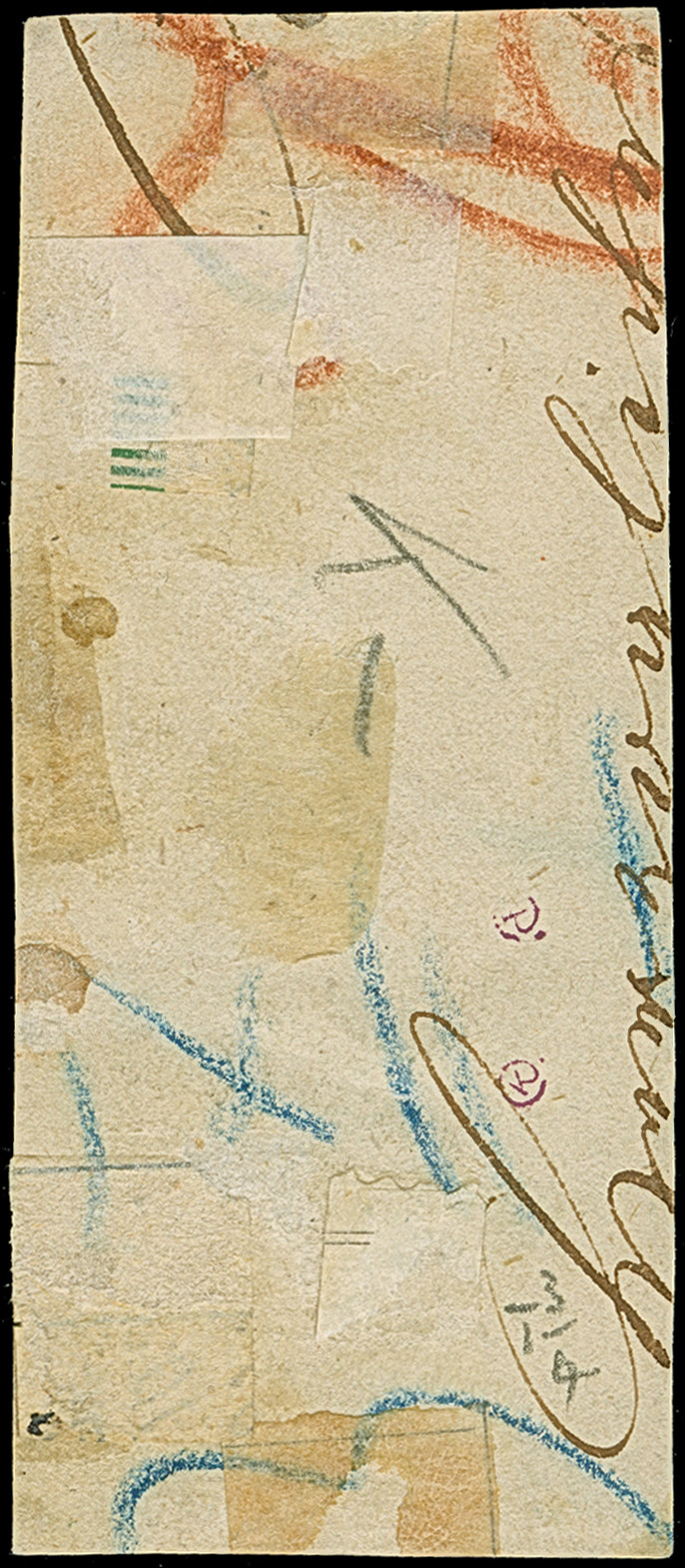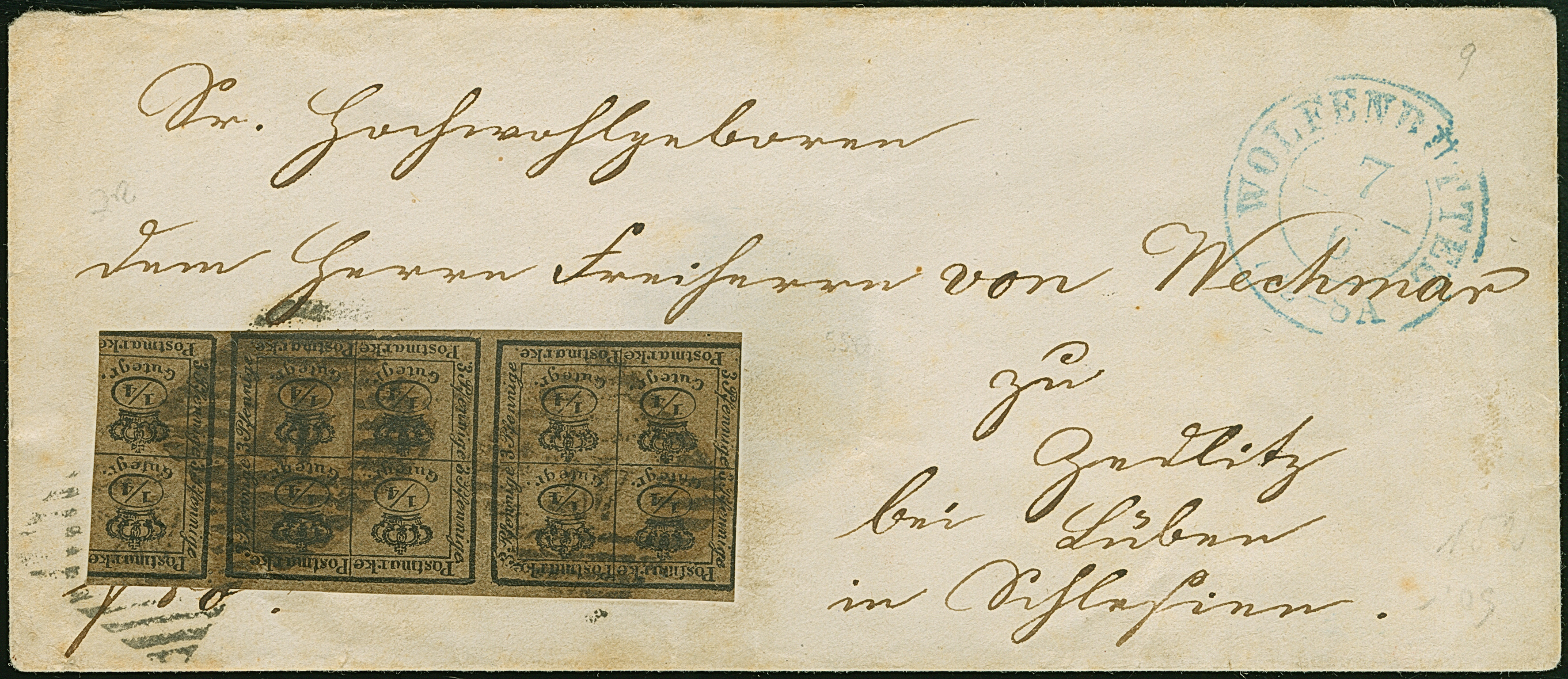 10/4 Ggr. auf graubraun im waagerechten Streifen, links und rechts unten leicht berührt, mit Nr. "47" und nebengesetztem blauen DKr. "WOLFENBÜTTEL 7/6" auf kleinem Briefkuvert nach Schlesien. Eine seltene Frankatur. Fotoattest Lange BPP (2004)