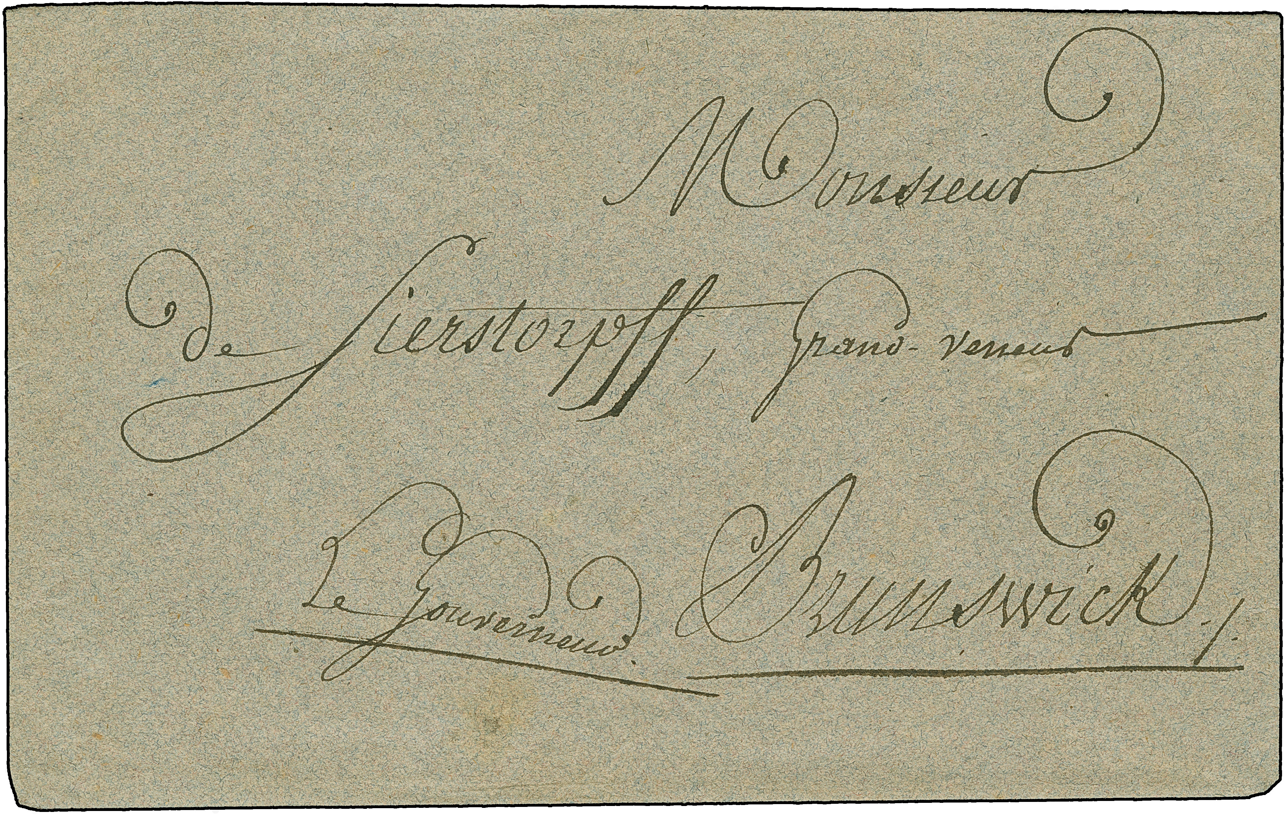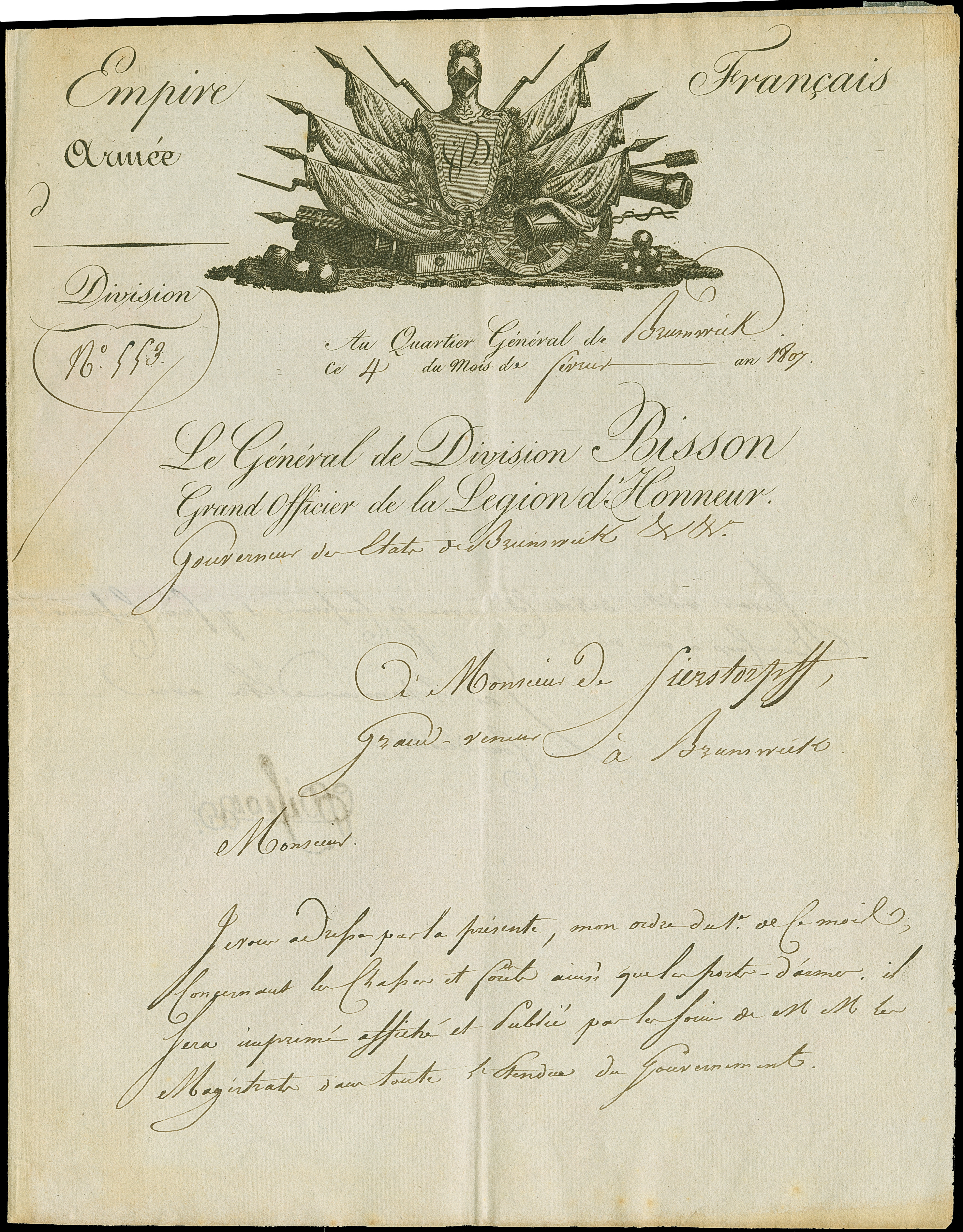 1807, kompletter Faltbrief mit dekorativem Briefkopf des Generalsquartiers und eigenhändiger Unterschrift des Militärgouverneurs Divisionsgeneral Baptiste Pierre Bisson , mit zugehörigem Briefkuvert an den Oberjägermeister Freiherr von Sierstorpff, ebenfalls in Braunschweig.