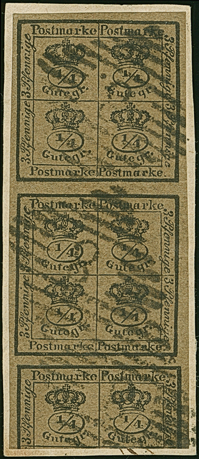 10/4 Ggr. auf graubraun als senkrechte Einheit, farbfrisch und allseits breitrandig, mit sauberer Nr. "8" BRAUNSCHWEIG auf Briefstück. Tadellos.