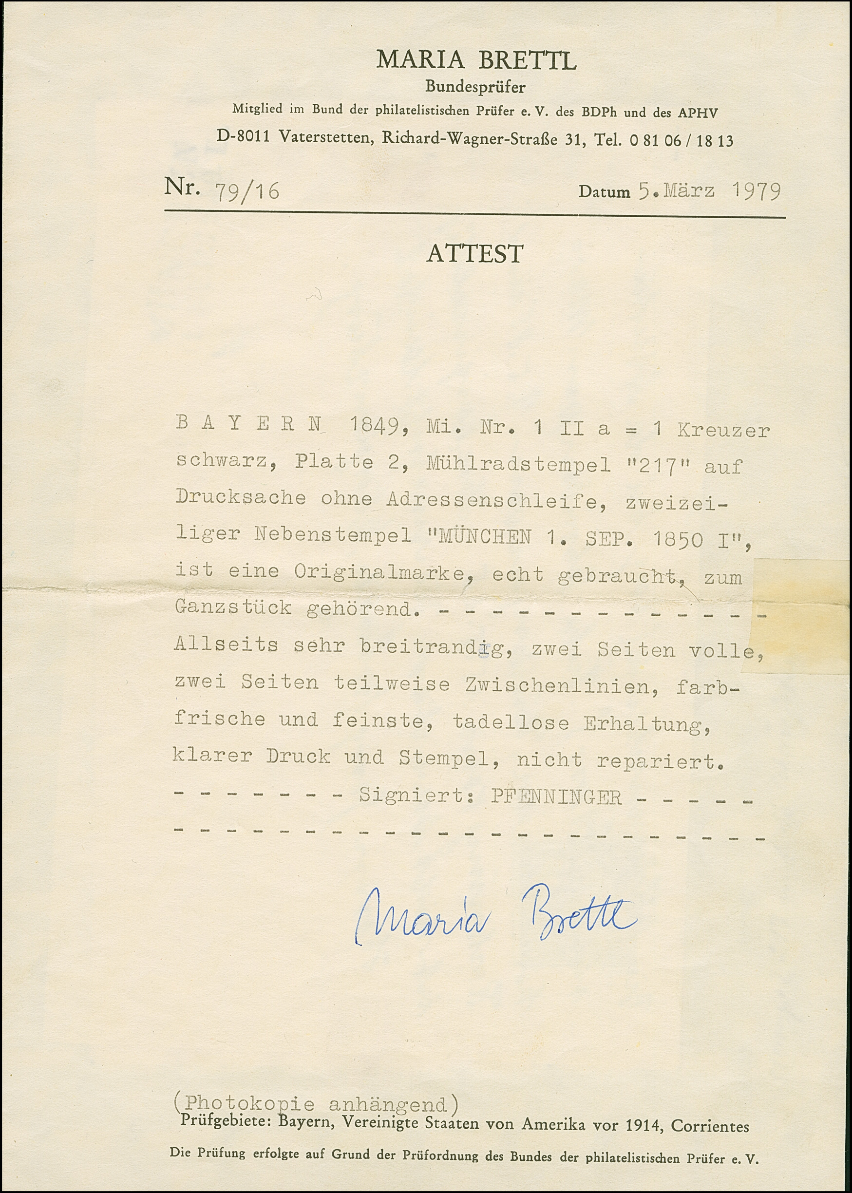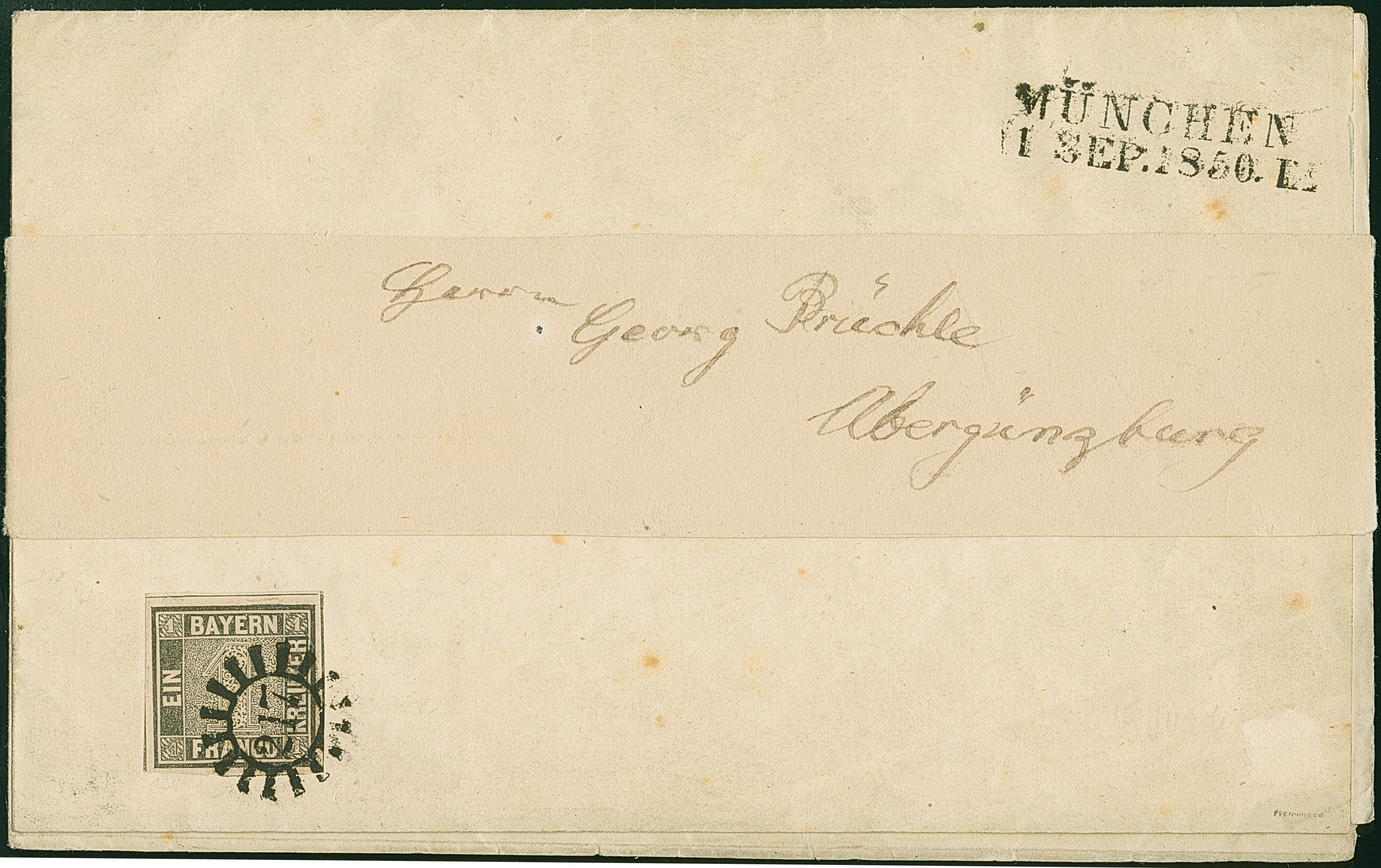 1 Kr. schwarz, Platte II, farbfrisch und allseits breitrandig, teils mit Zwischenlinien, mit sauber aufgesetztem gMR "217" und nebengesetztem L2 "MÜNCHEN 1 SEP. 1850" auf äußerem Drucksachen-Bogen mit nachempfundener Adressschleife. Schöne Erhaltung. Marke tadellos. Signiert Pfenninger und Attest Brettl BPP (1979)