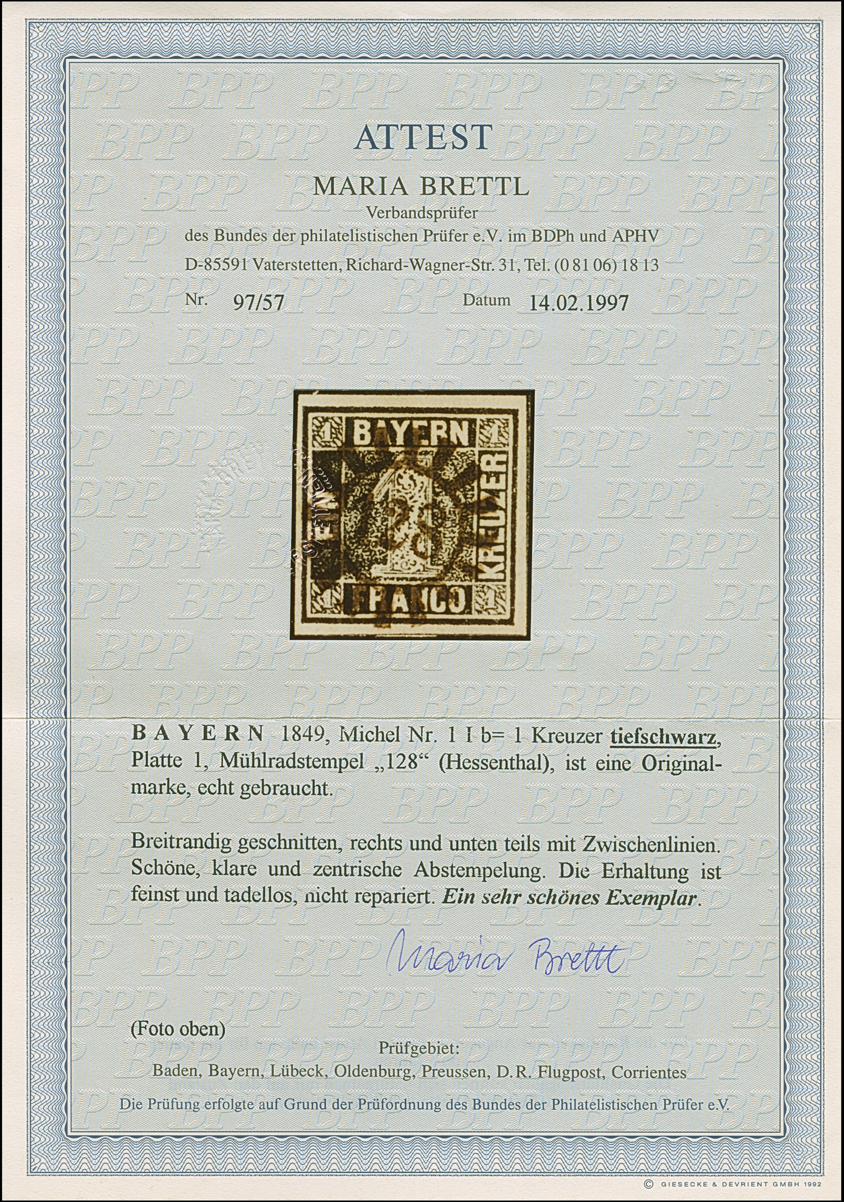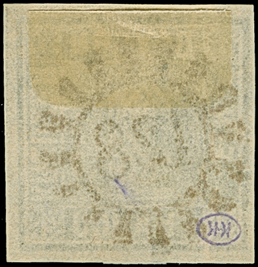 1849, 1 Kr. tiefschwarz, Platte 1, farbfrisch und breitrandig mit Teil der Schnittlinien rechts und unten, sauber mit gMR. “128” (Hessenthal) entwertet und in tadelloser Erhaltung. Bei Helbig-Vogel sind drei lose Marken der Mi.-Nr. 1 mit diesem Stempel registriert. Ein sehr schönes Exemplar mit auf dieser Marke seltenem Nummernstempel, Fotoattest Brettl BPP (1997)