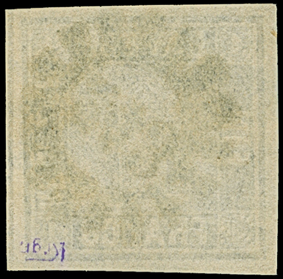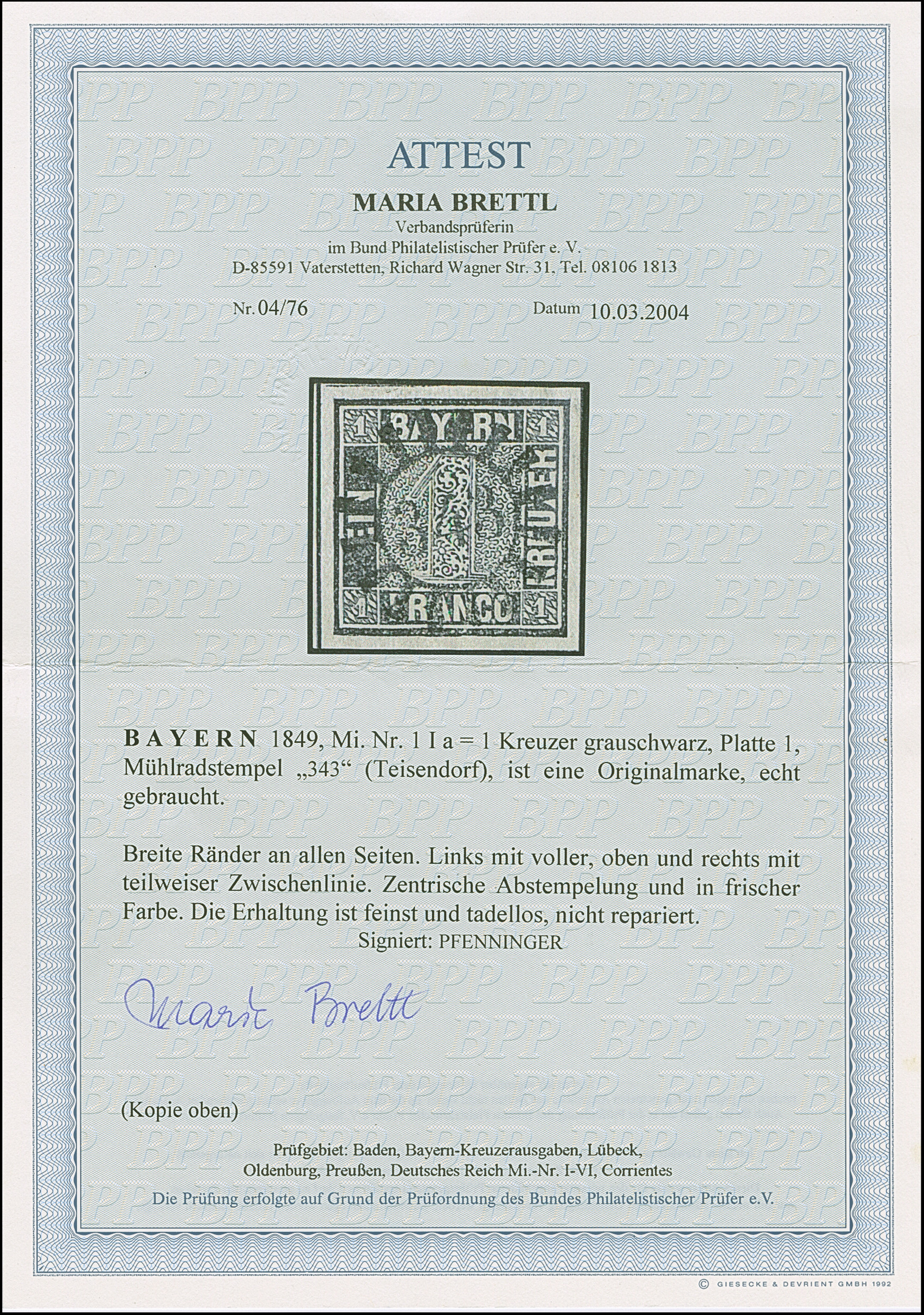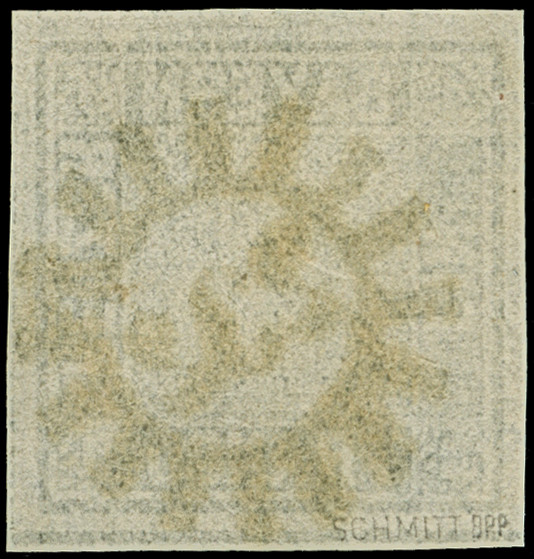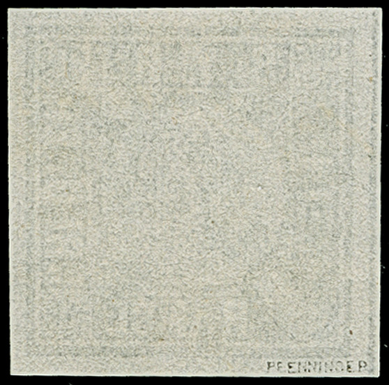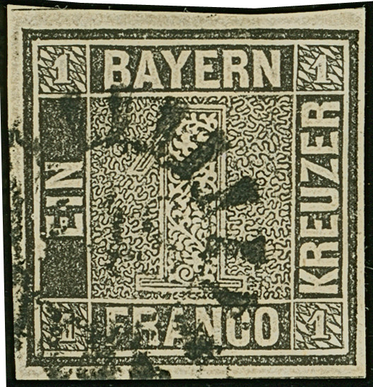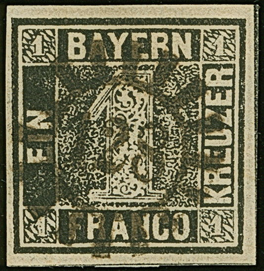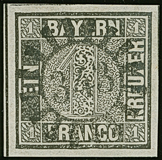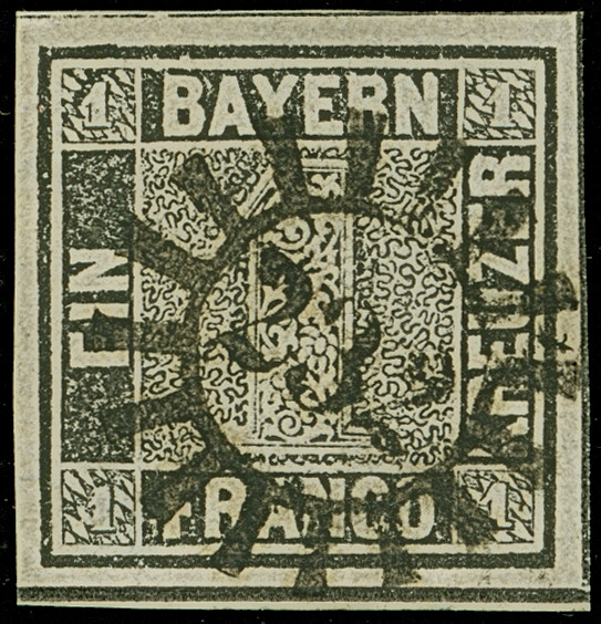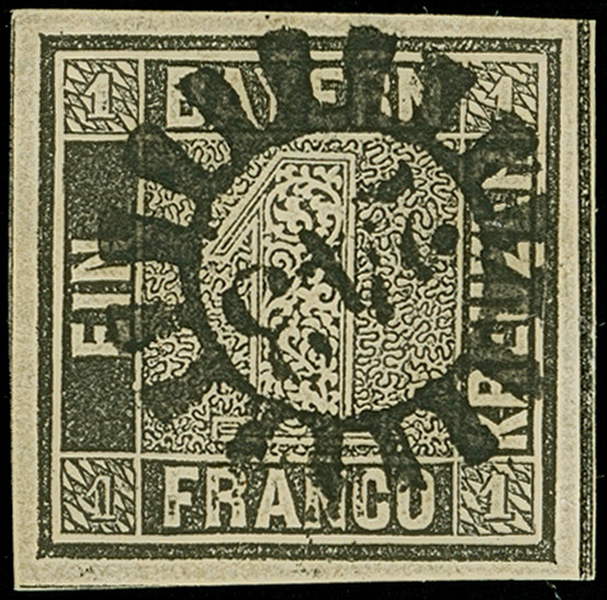 1849, 1 Kr. grauschwarz, Platte 1, farbfrisch und allseits breitrandig mit links voller, oben und rechts teilweiser Schnittlinie, zentrisch und klar mit gMR “343” (Teisendorf) entwertet, in tadelloser Erhaltung. Ein schönes Exemplar, sign. Pfenninger und Fotoattest Brettl BPP (2004)
