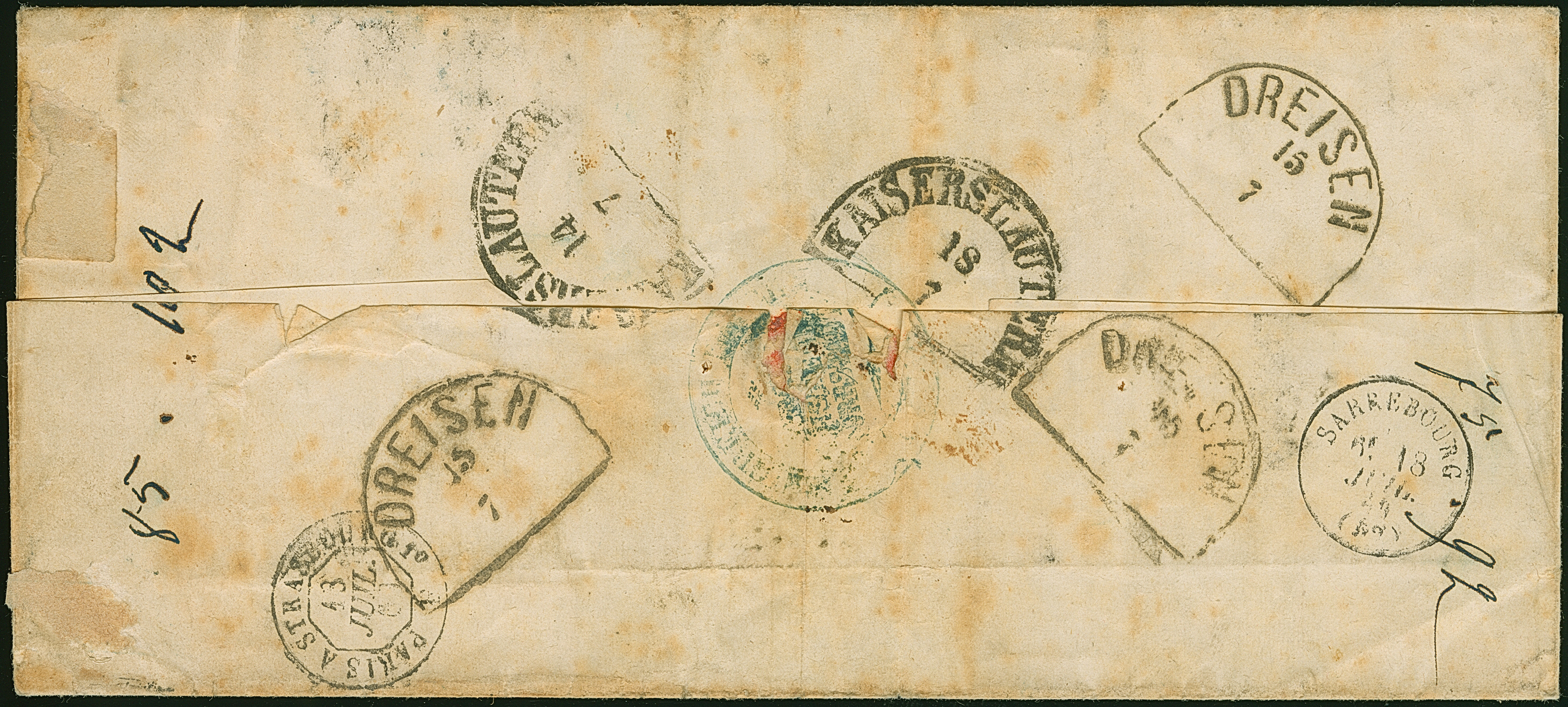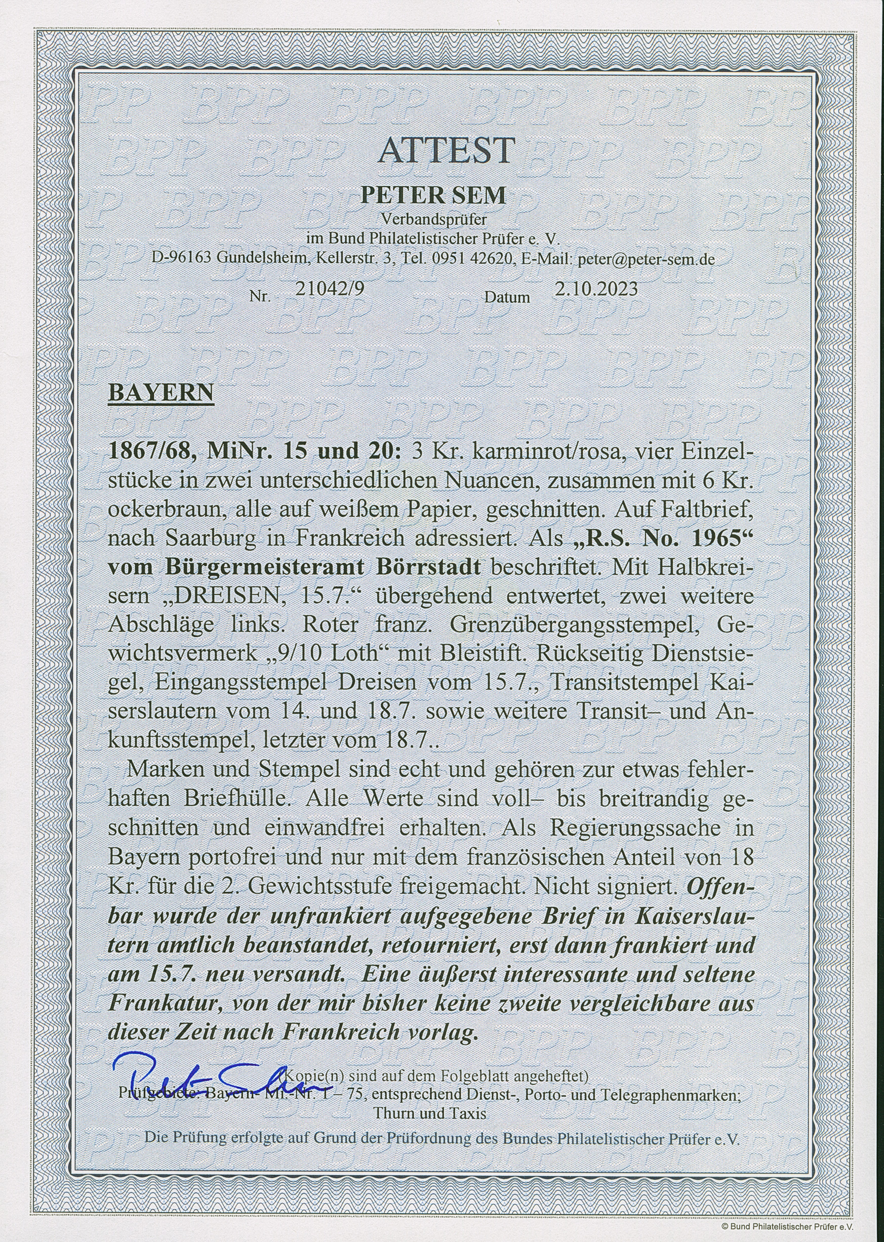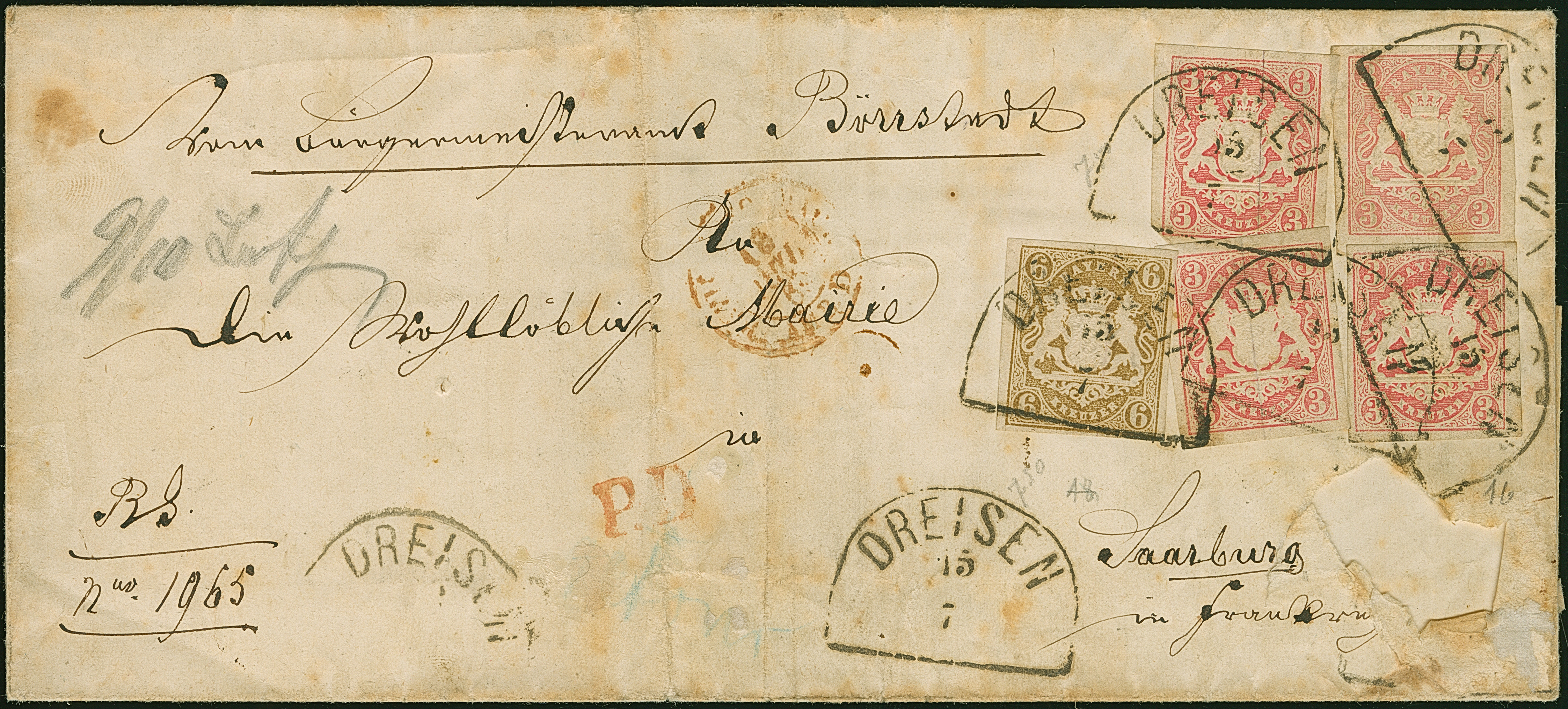 3 Kr. rosa, 4 Einzelstücke in teils unterschiedlichen Nuancen und 6 Kr. ockerbraun, alle voll-bis breitrandig und einwandfrei, mit Halbkreis "DREISEN 15/7" (1869) auf im Inland portofreier Dienstbriefhülle der 2. Gewichtsstufe nach Saarburg in Frankreich. Die Hülle mit Faltungen außerhalb der Frankatur, vorderseitiger Fehlstelle und etwas unfrisch. Eine in dieser Form einmalige Teilfrankatur. Fotoattest Sem BPP (2023)