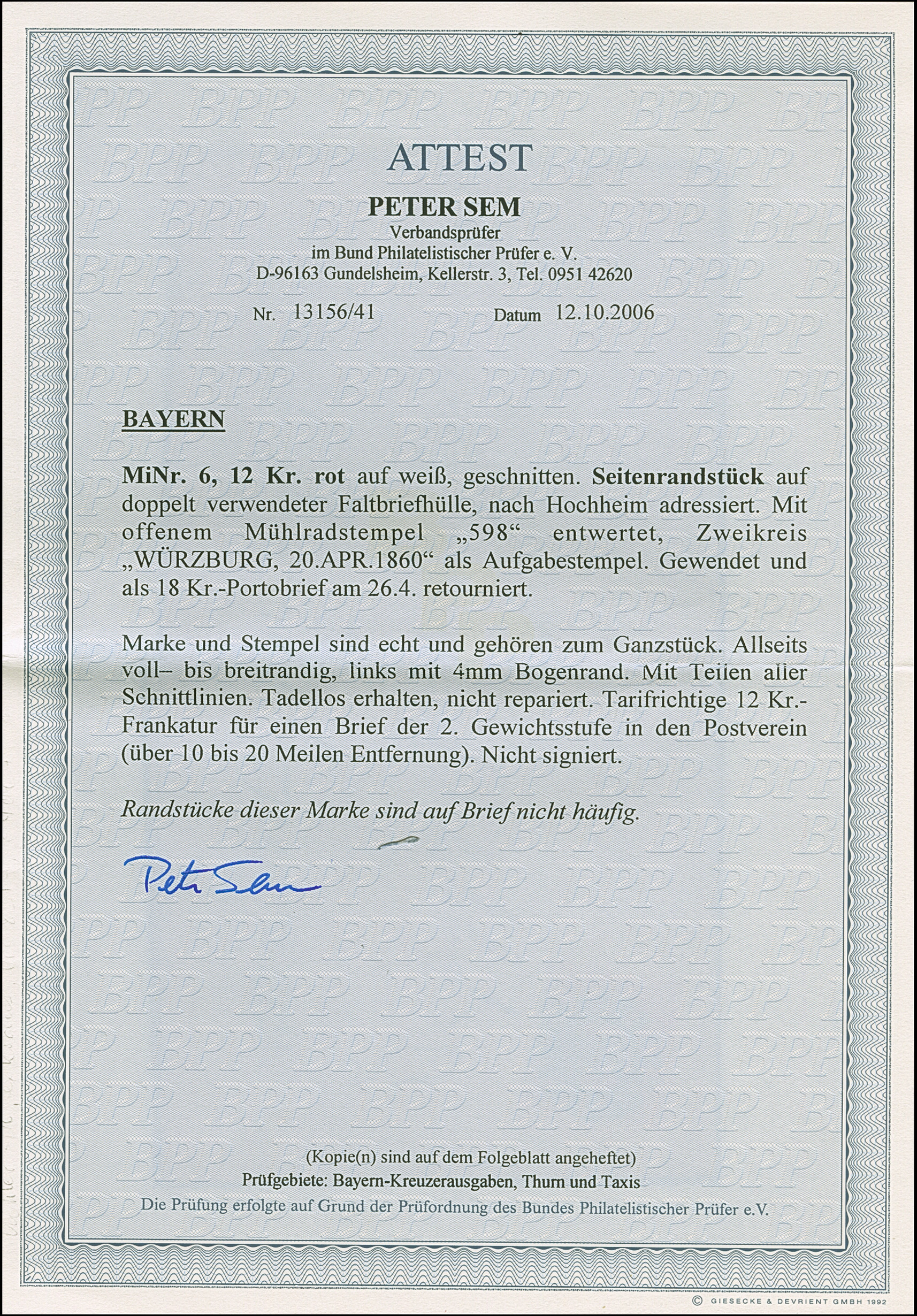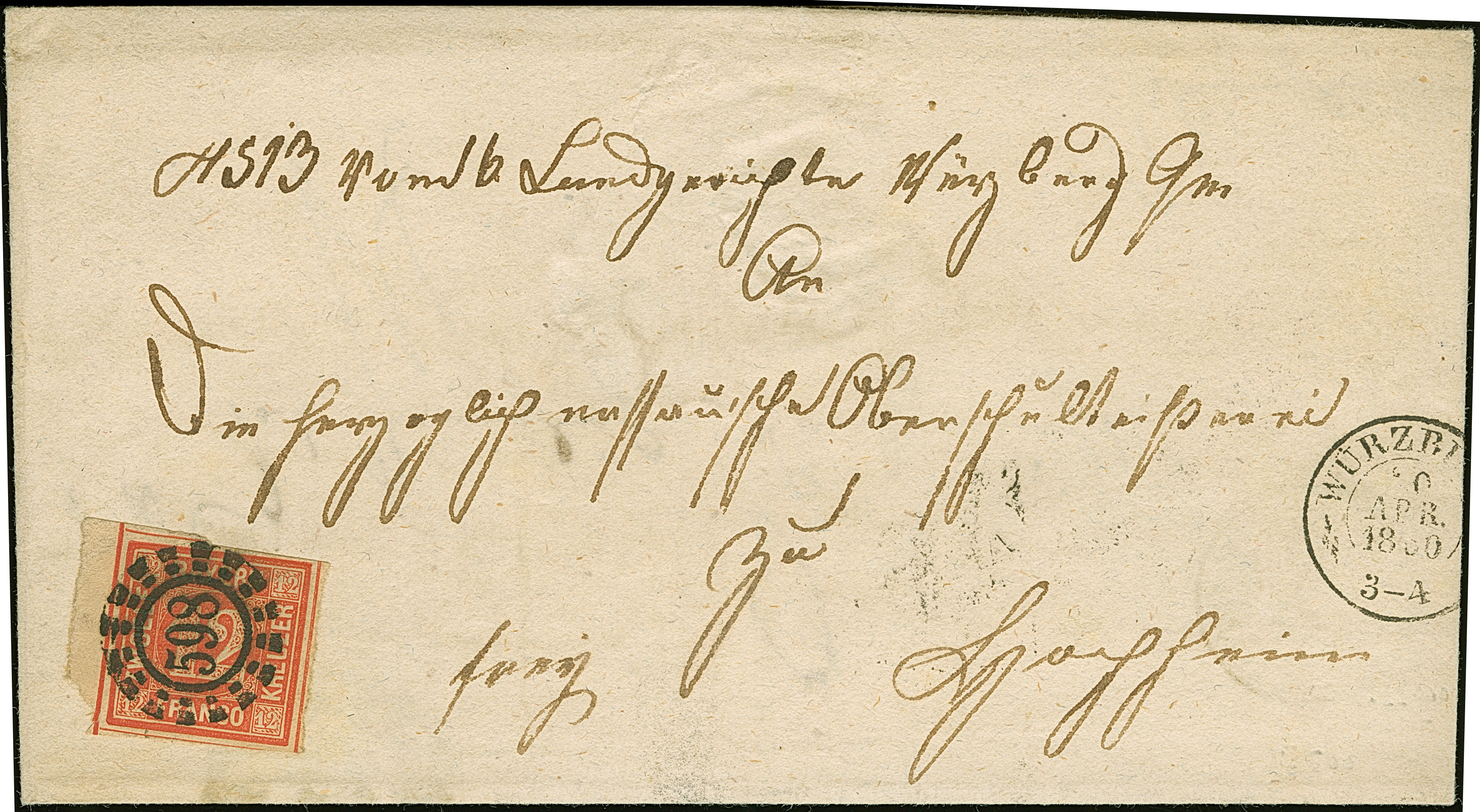 12 Kreuzer rot, oben rechts voll-, sonst breitrandig, links mit ca. 3 mm Bogenrand (unten nicht ganz komplett), mit zentrisch und klar aufgesetztem oMR "398" auf doppelt verwendeter Briefhülle mit nebengesetztem DKr. "WÜRZBURG 20. APR. 1860", nach Hochheim am Main. Eine attraktive und einwandfreie Einzelfrankatur in den Postverein. Fotoattest Sem BPP (2006)