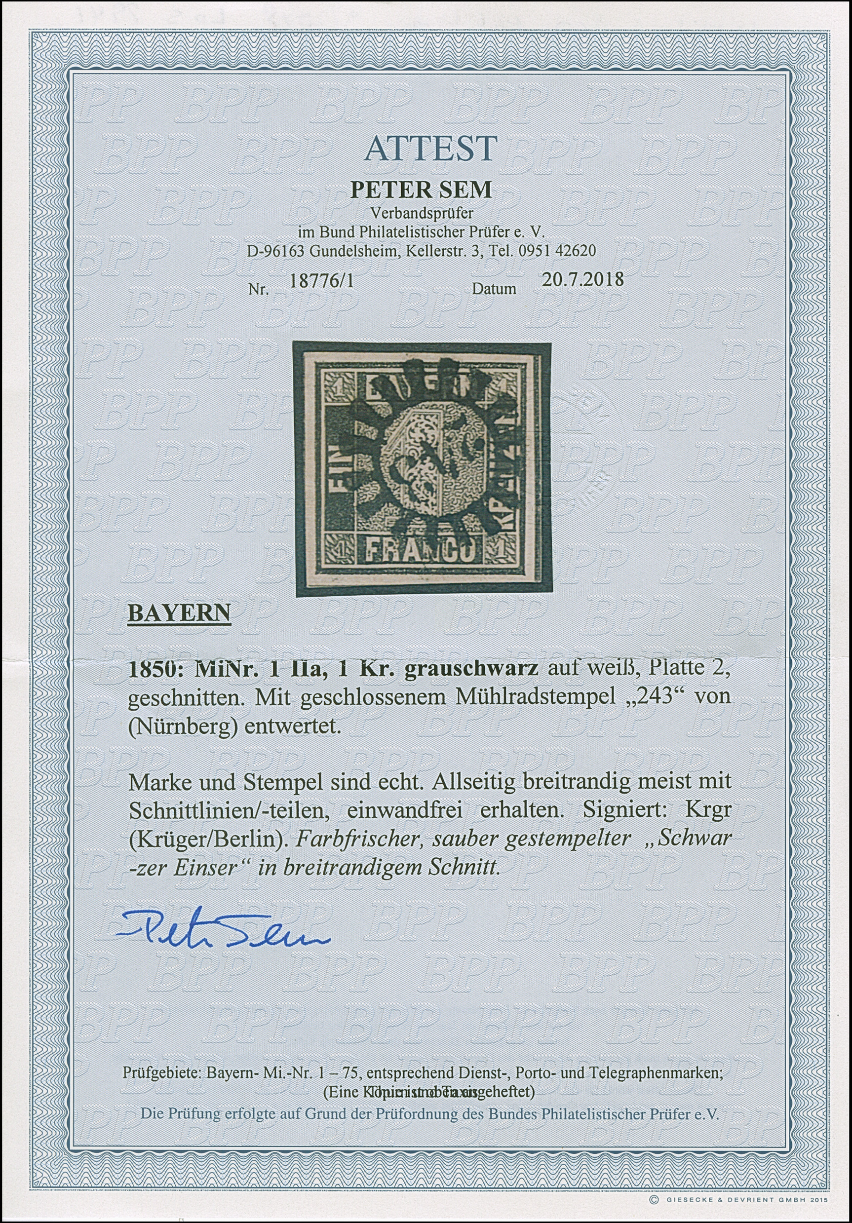 1 Kr. grauschwarz, farbfrisch und allseits breitrandig mit Schnittlinien an 3 Seiten, sauber entwertet durch zentrischen gMR "243" NÜRNBERG. Ein sehr schönes Stück in tadelloser Erhaltung. Fotoattest Sem BPP (2018)
