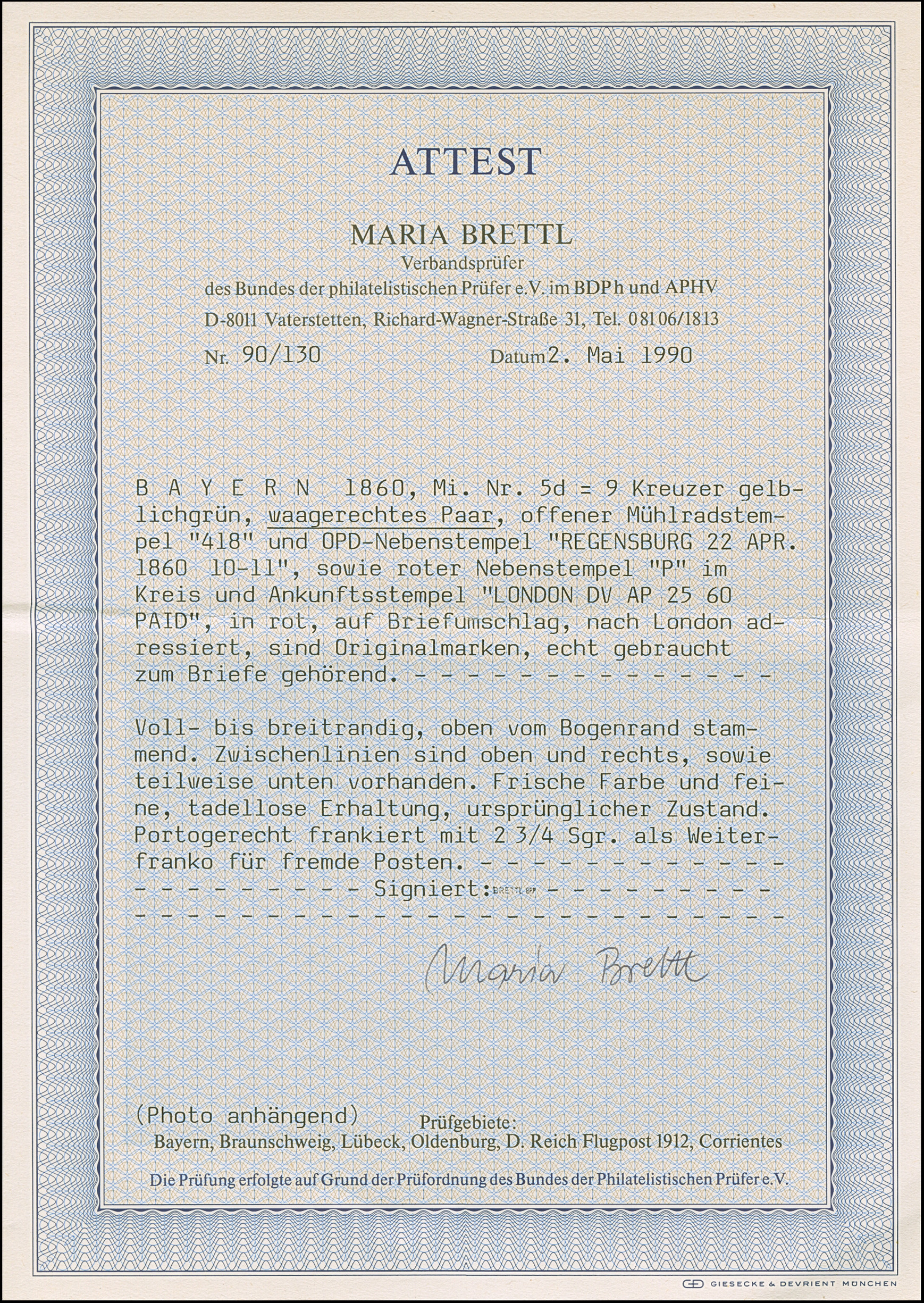 9 Kr. gelbgrün im waagerechten Paar der, farbfrisch und voll- bis breitrandig, oben mit schmalem Bogenrand, mit klarem oMR "418" und sauber nebengesetztem DKr. "REGENSBURG 22 APR. 1860" auf Briefkuvert über Belgien an die kaiserlich österreichische Gesandtschaft nach London. Ein sehr attraktiver Brief. Fotoattest Brettl BPP (1990)