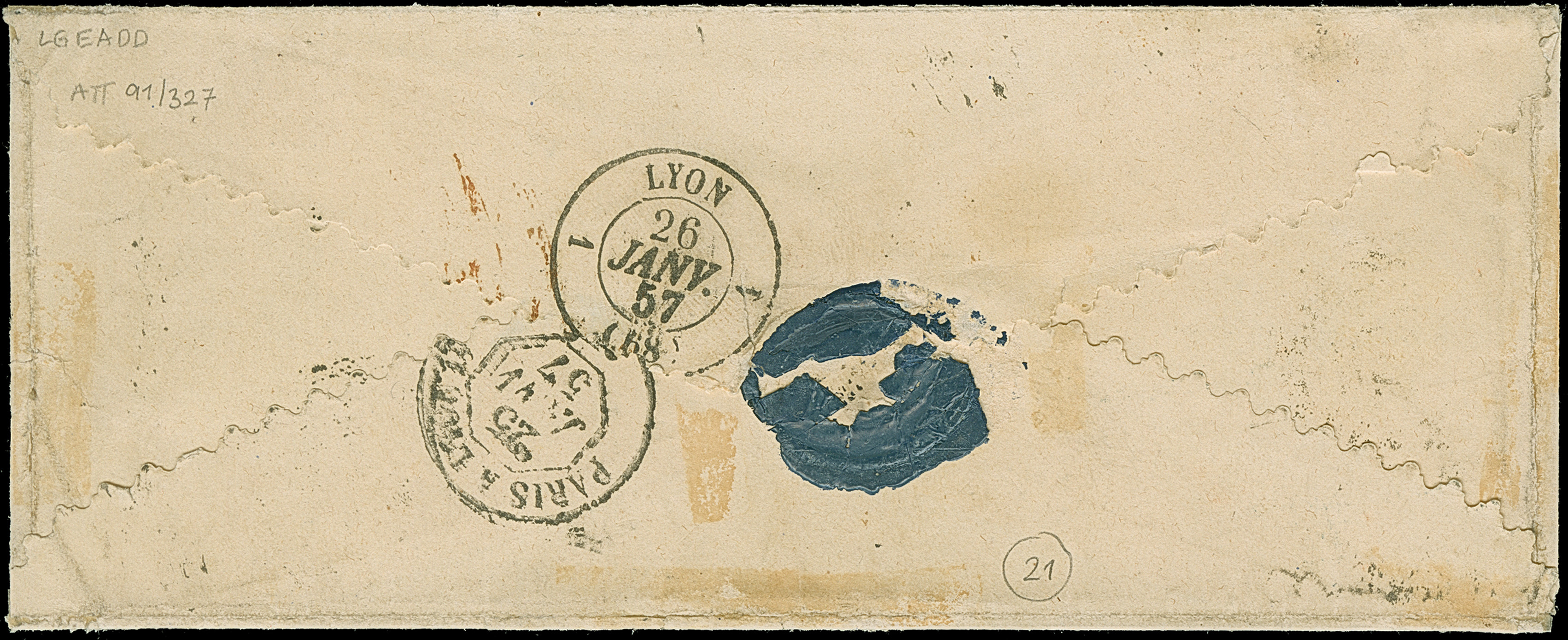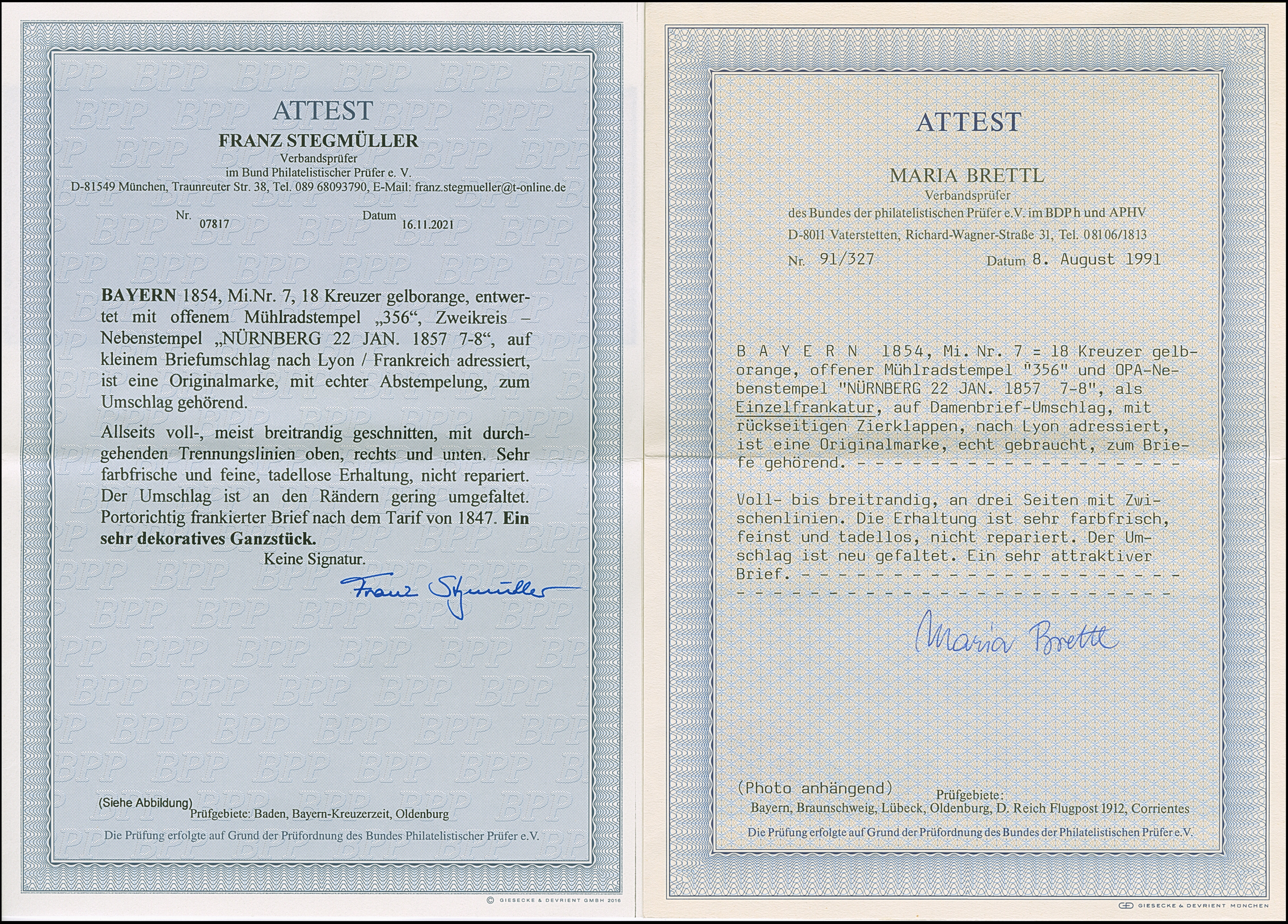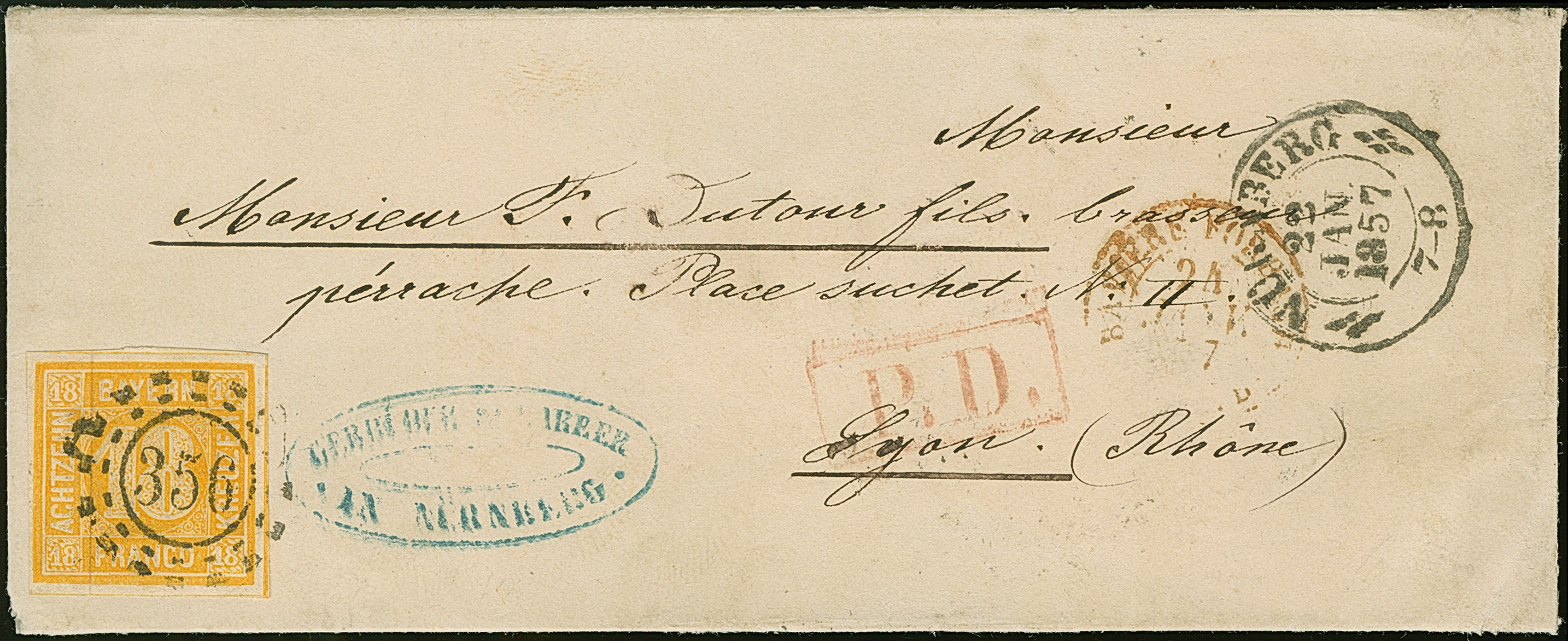 18 Kr. gelborange in leuchtend frischer Farbe, voll- bis meist breitrandig, mit klar aufgesetztem oMR "356" und nebengesetztem DKr. "NÜRNBERG 22 JAN. 1857" auf kleinem Damen-Kuvert nach Lyon. Eine besonders schöne Einzelfrankatur in tadelloser Erhaltung. Fotoattest Brettl BPP (1991) und Stegmüller BPP (2021)
