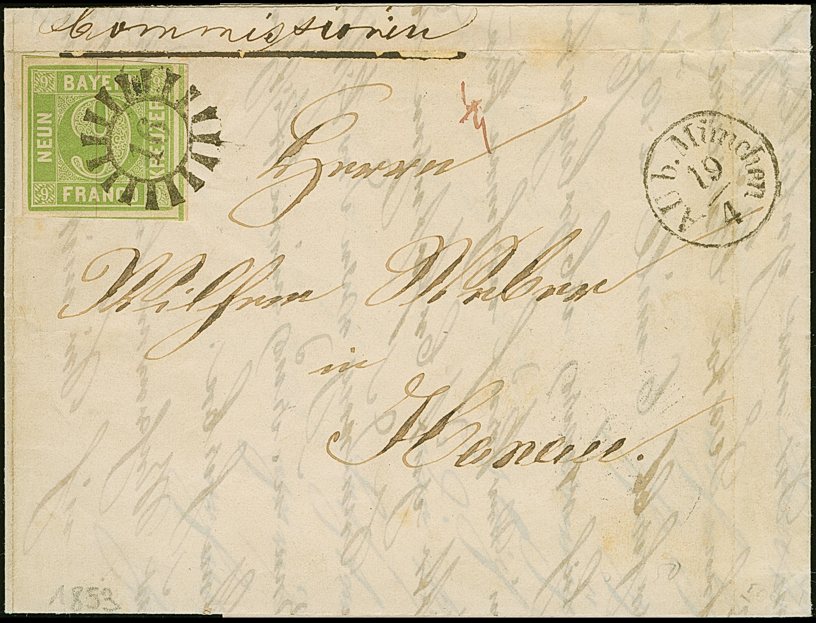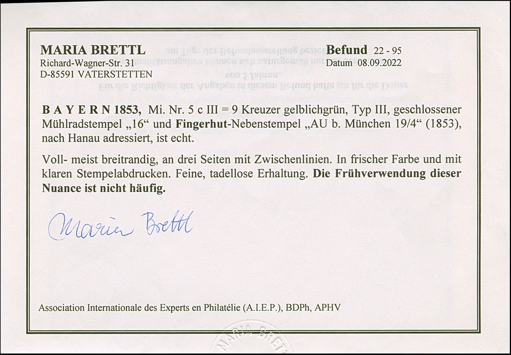 9 Kr. maigrün, farbfrisch und voll- bis meist breitrandig, mit klar aufgesetztem gMR "16" und nebengesetztem Fingerhutstempel "AU b. München 19/4"(1853) auf komplettem Faltbrief nach Hanau. Einwandfrei. Befund M. Brettl (2022)
