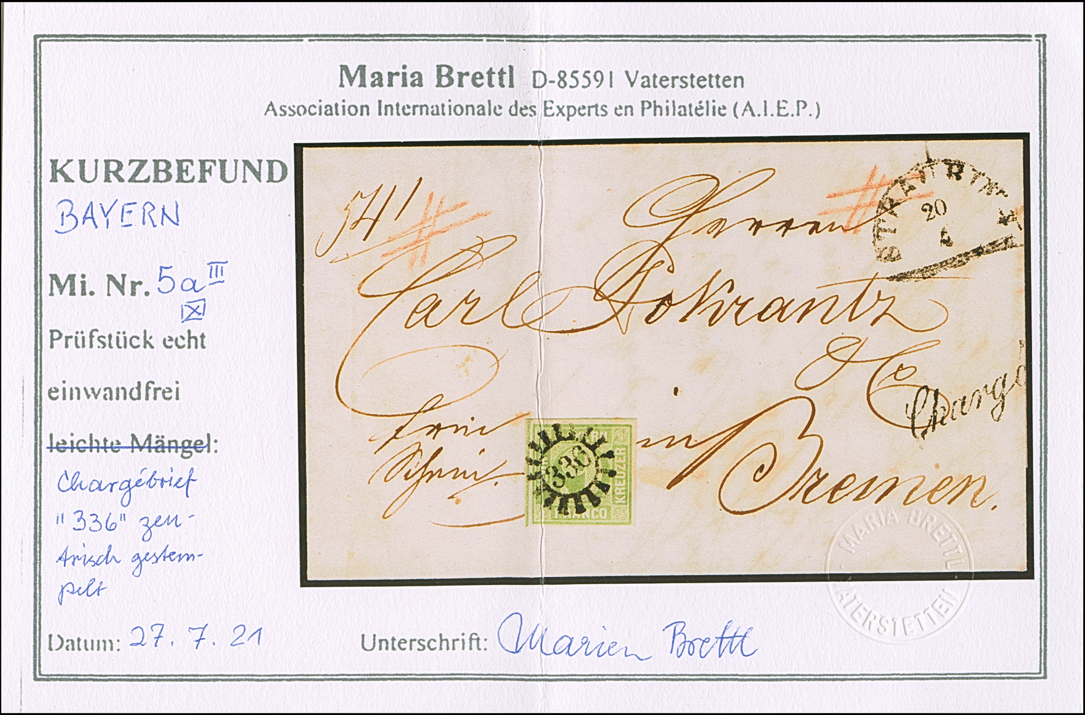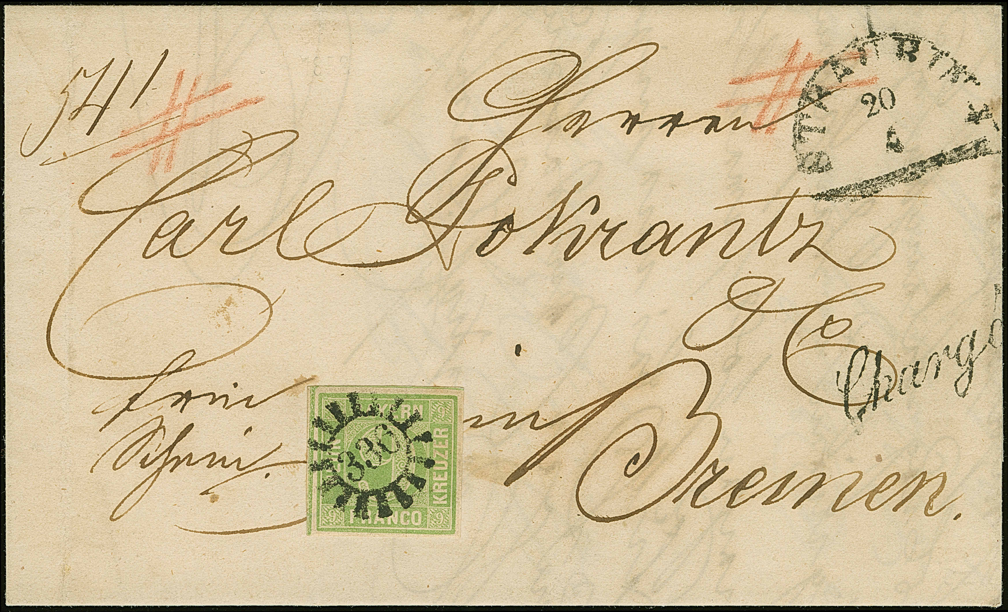 9 Kr. bläulichgrün, schöne frische und kräftige Farbe, allseits gleichmäßig breitrandig, mit Schnittlinien an 2 Seiten, mit klarem gMR "336" und nebengesetztem Halbkreis "STRAUBING 20/4" (1852) auf eingeschriebenem Faltbrief mit 2 Rötel-Gitterkreuzen und L1 "Charge", an die bekannte Adresse Prokrantz, Bremen. Frische und tadellose Erhaltung. Ein attraktiver früher Reco-Brief in den Postverein. Signiert Brettl BPP und Kurzbefund Brettl AIEP