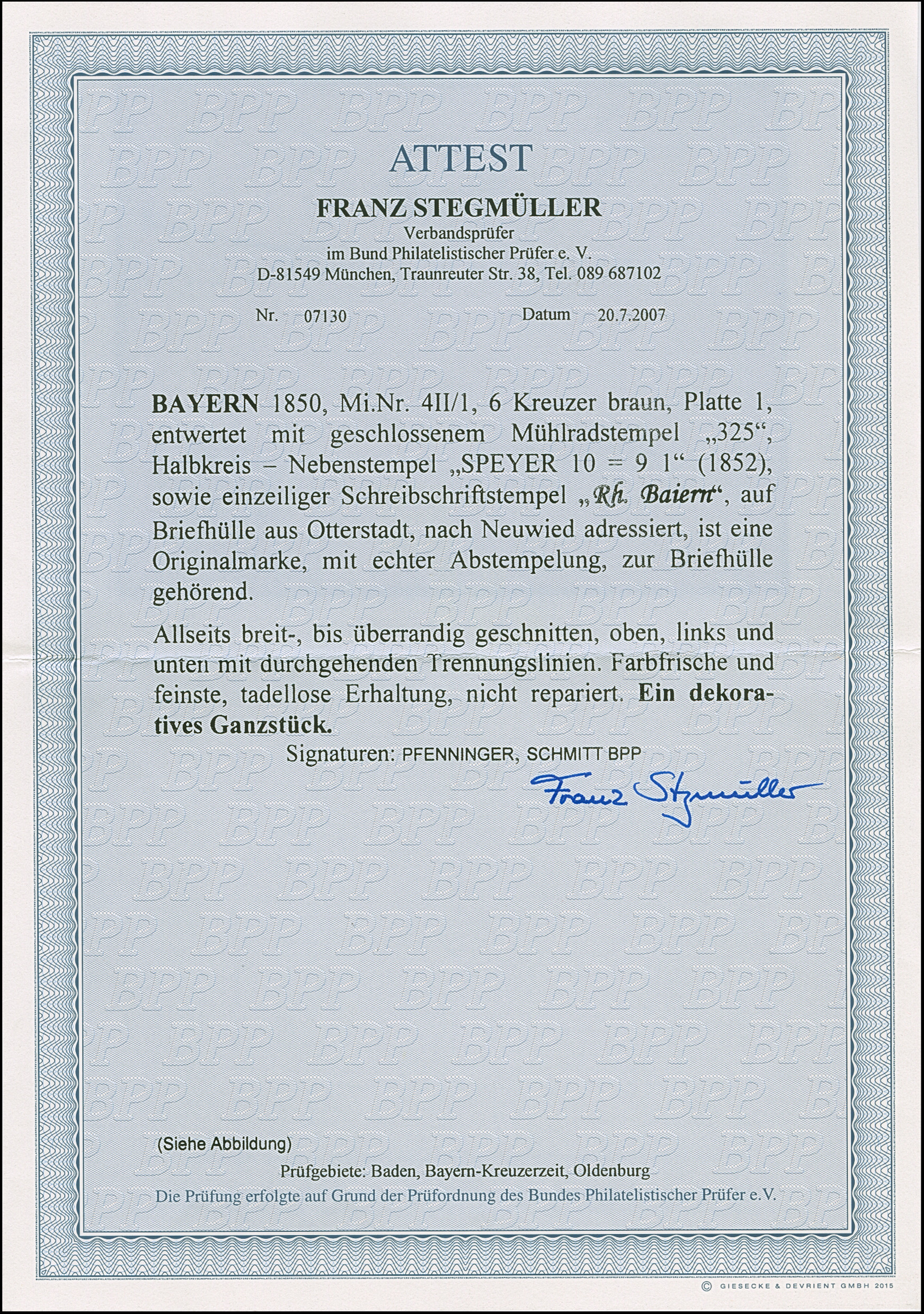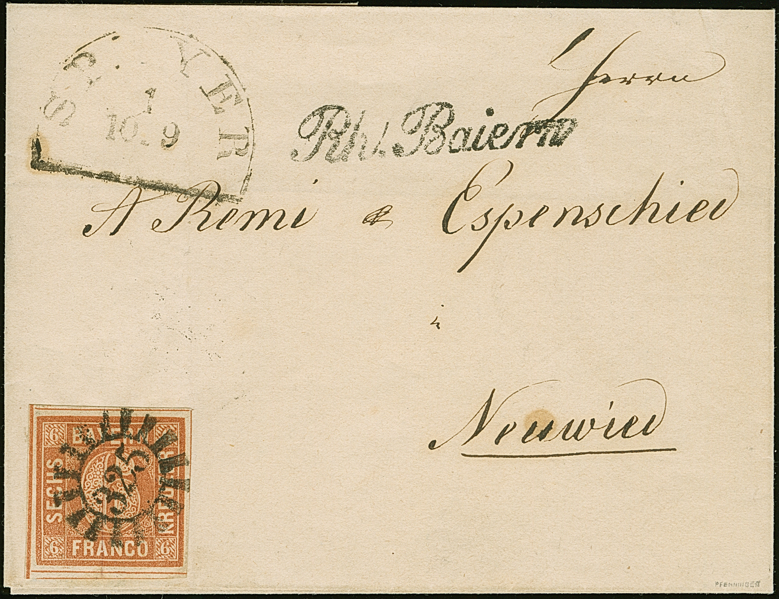 6 Kr. braun, allseits breitrandig, mit klarem gMR "325" auf Briefhülle mit nebengesetztem Halbkreis "SPEYER 10/9" (1852) und L1 "Rh. Baiern" nach Neuwied. Ein schöner und mit dem Übergangsstempel seltener Brief. Signiert Pfenninger und Fotoattest Stegmüller BPP (2007)