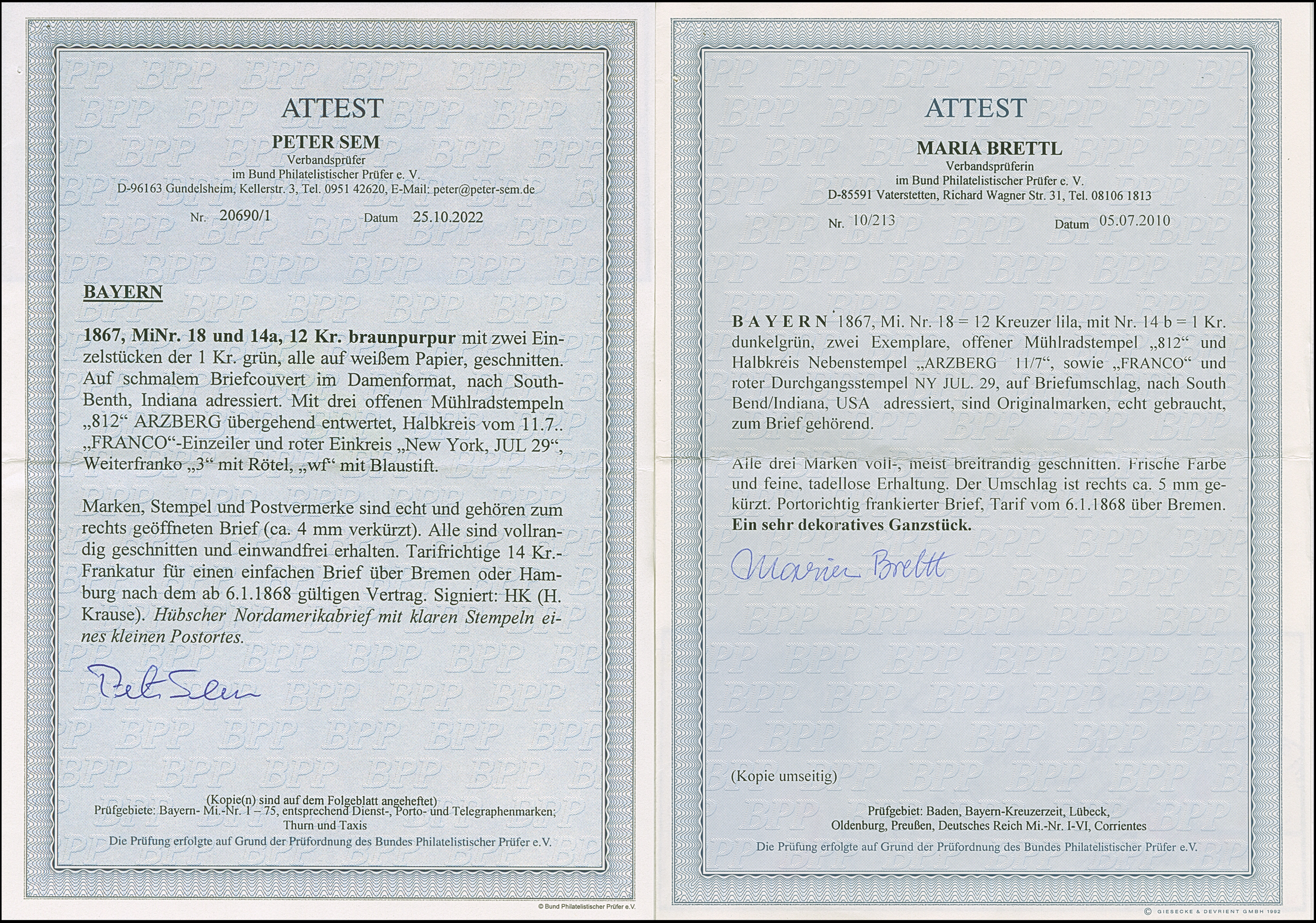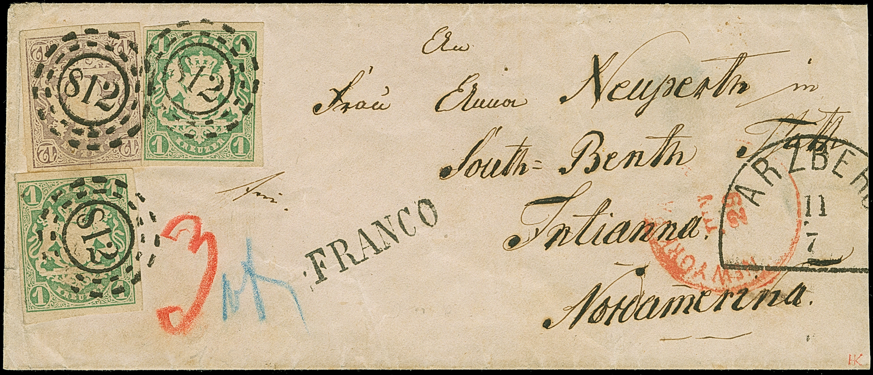 12 Kr. lila mit 2 Einzelwerten 1 Kr. grün, alle farbfrisch und voll- bis meist breitrandig, mit klar aufgesetztem oMR "812" und nebengesetztem Halbkreisstempel "ARZBERG 11 7" auf kleinem Briefkuvert über Bremen nach South Bend, Indiana. Das Kuvert durch Öffnung rechts minimal verkürzt, sonst tadellose und sehr attraktive Erhaltung. Fotoatteste Brettl BPP (2010) und Sem BPP (2022)