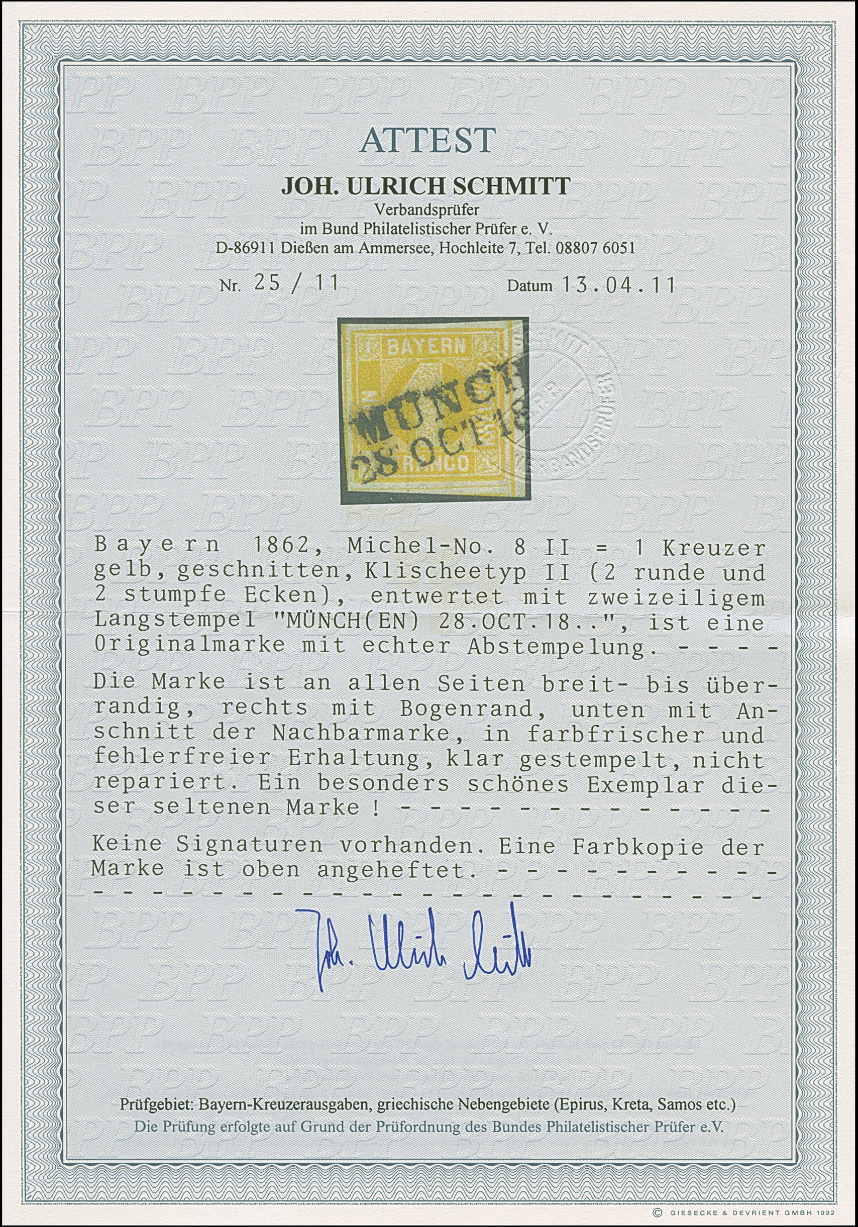 1862, 1 Kr. gelb, Type II, farbfrisch und allseits breit- bis überrandig mit kleinem Bogenrand rechts, sauber mit schwarzem L2 "MüNCHEN 23.OCT.18(66) entwertet und in tadelloser Erhaltung. Das dazugehörige Briefstück liegt bei, ein sehr schönes Exemplar dieser seltenen Marke, Fotoattest Schmitt BPP (2011)
