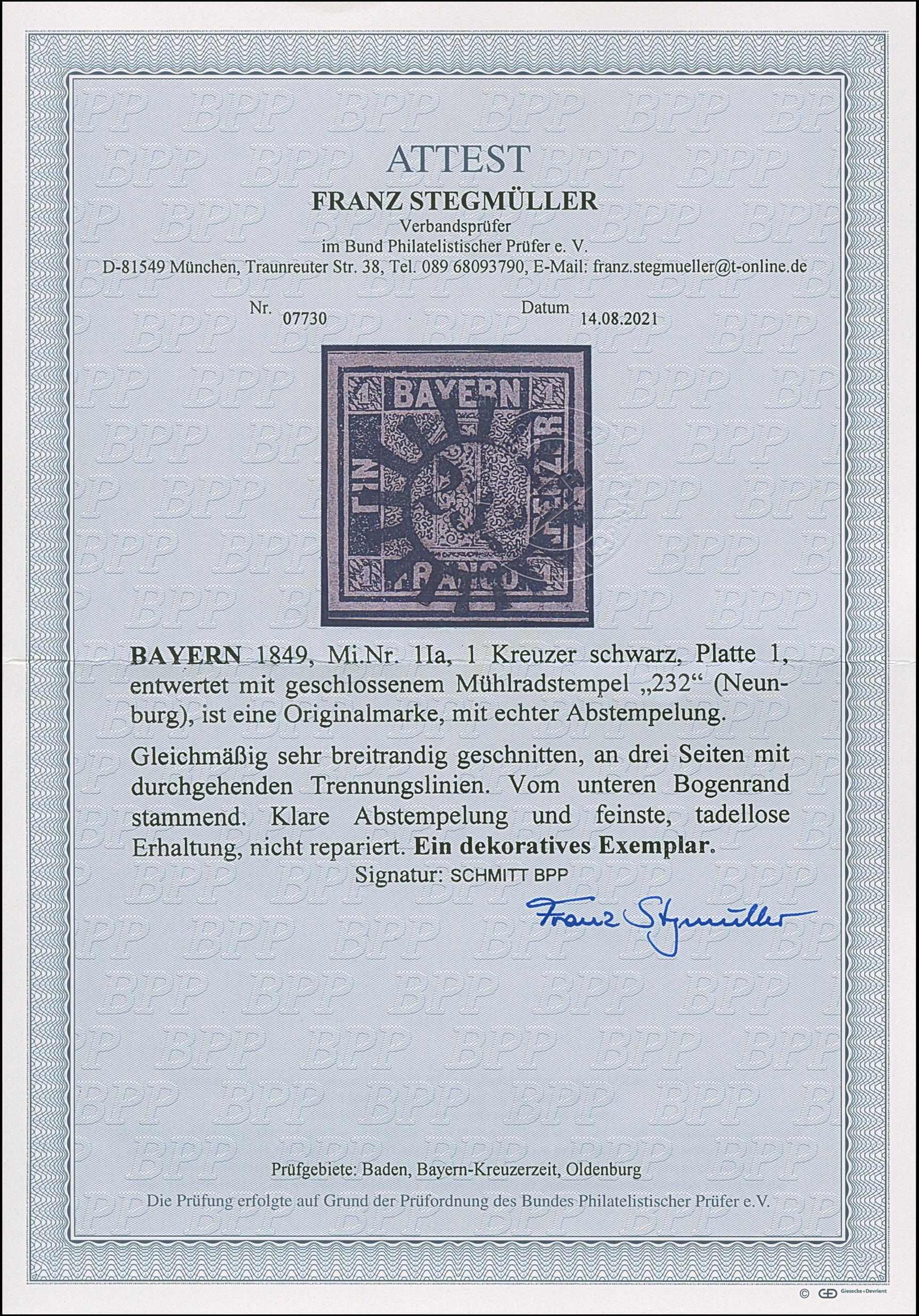 1849, 1 Kr. schwarz, Platte 1, gleichmäßig sehr breitrandig geschnitten mit Zwischenlinien und vom unteren Bogenrand, sauber und zentrisch mit klarem gMR “232” NEUNBURG, tadelloser Erhaltung. Ein attraktives Exemplar, signiert Schmitt BPP sowie Fotoattest Stegmüller BPP (2021)