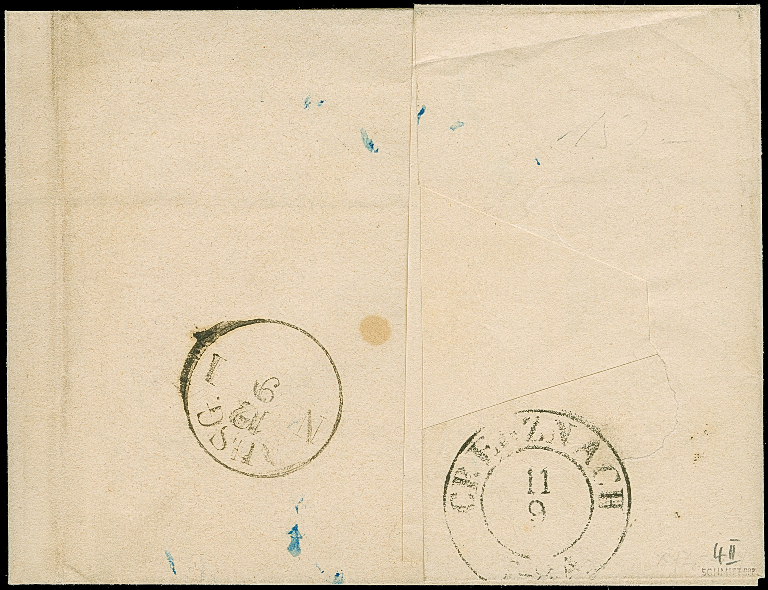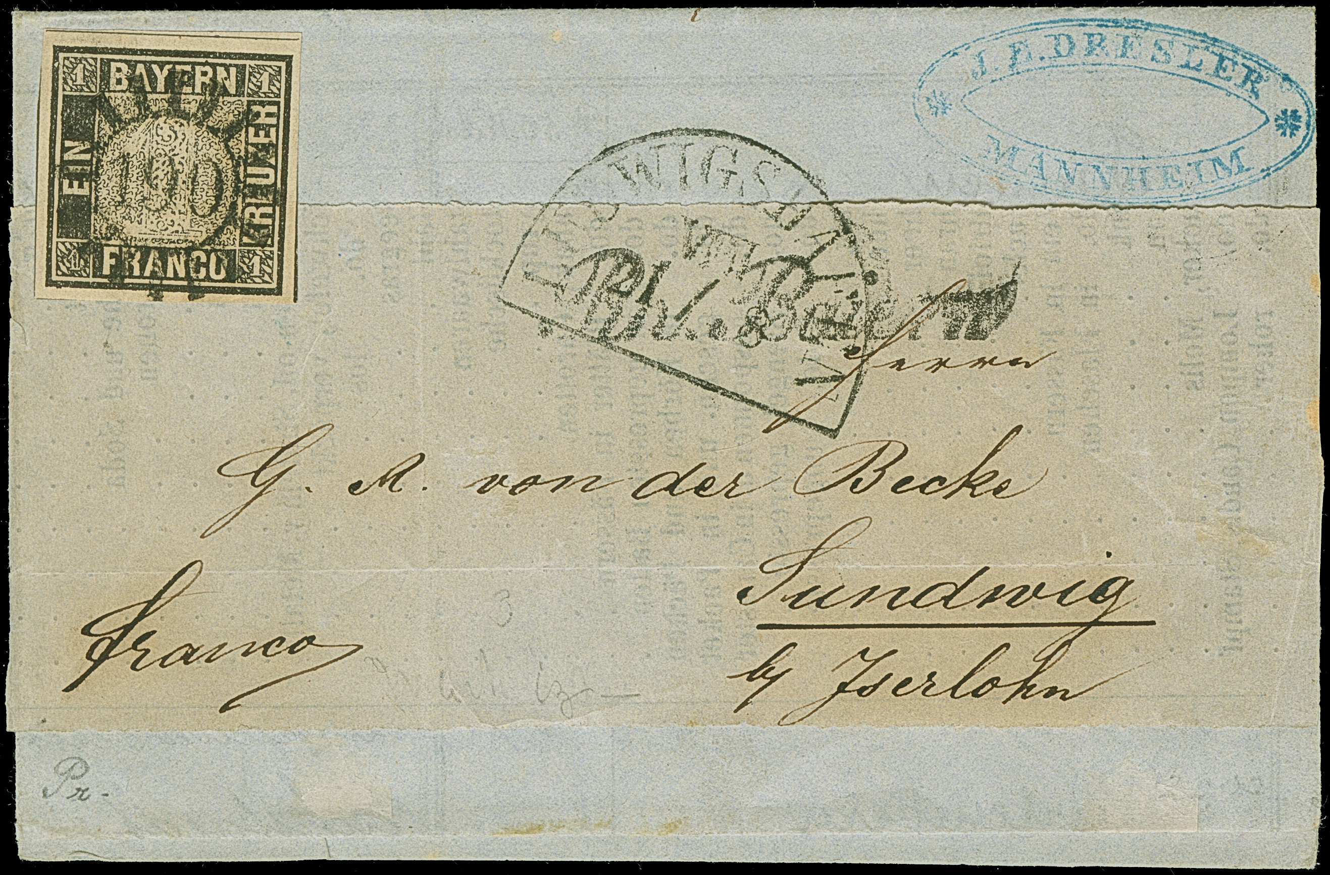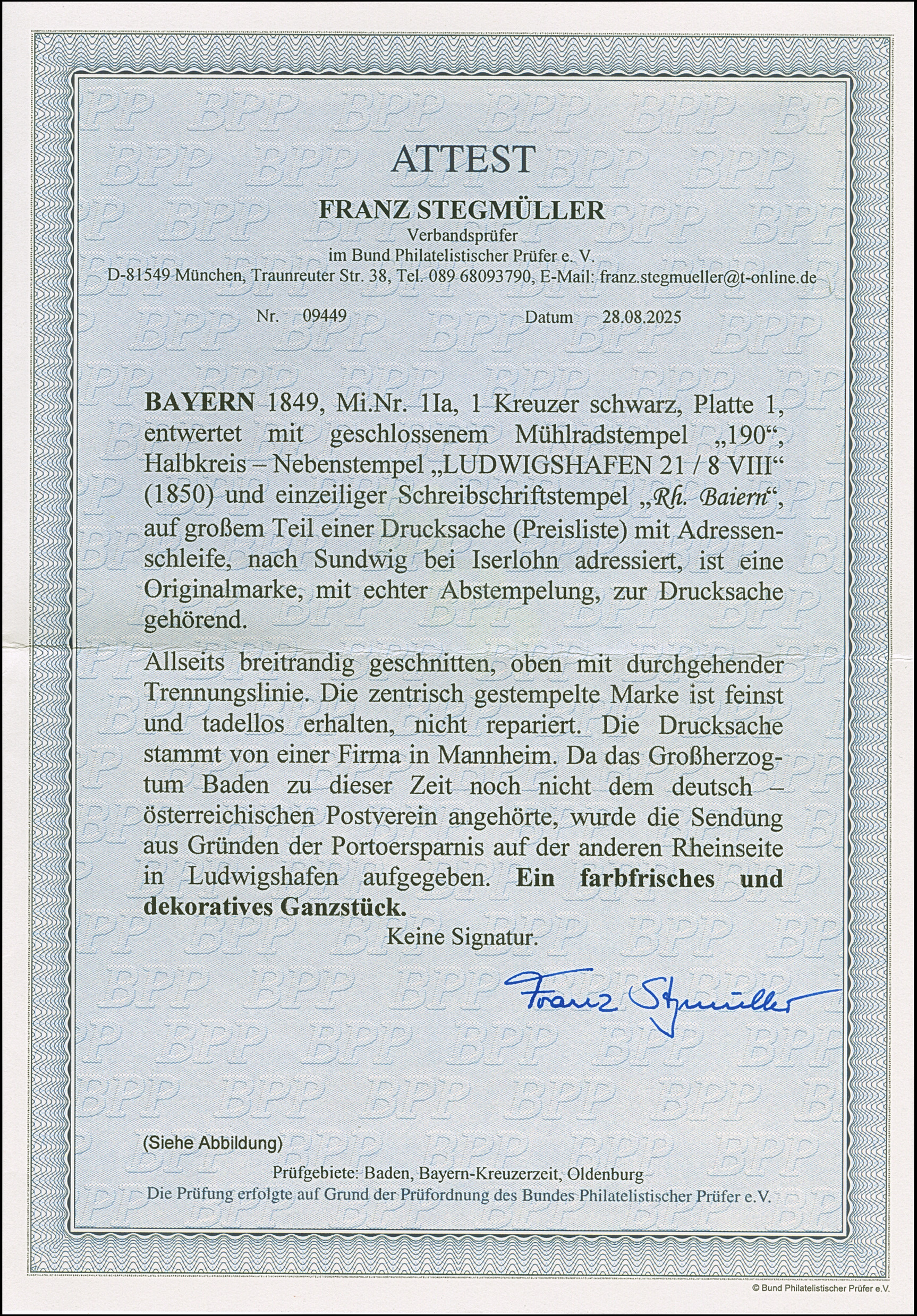 1849, 1 Kr. schwarz, Platte 1, farbfrisch und allseits breitrandig geschnitten, oben mit durchgehender Trennungslinie, sauber mit zentrisch abgeschlagenem gMR “190” und nebengesetztem Halbkreisstempel “LUDWIGSHAFEN 21 / 8 VIII” sowie Kursiv-L1 “Rh. Baiern” auf großem Teil einer Drucksache (Preisliste) mit Adressschleife, nach Sundwig bei Iserlohn adressiert. Die Drucksache aufgegeben von einer Firma in Mannheim mit vorderseitigem Absenderstempel “J.E. DRESLER MANNHEIM”. Da das Großherzogtum Baden zu dieser Zeit noch nicht dem DÖPV angehörte, wurde die Sendung aus Gründen der Portoersparnis auf der anderen Rheinseite in Ludwigshafen aufgegeben. Ein wunderschönes und attraktives Stück, in dieser Form nach unseren Unterlagen Unikat! Fotoattest Stegmüller BPP (2025)