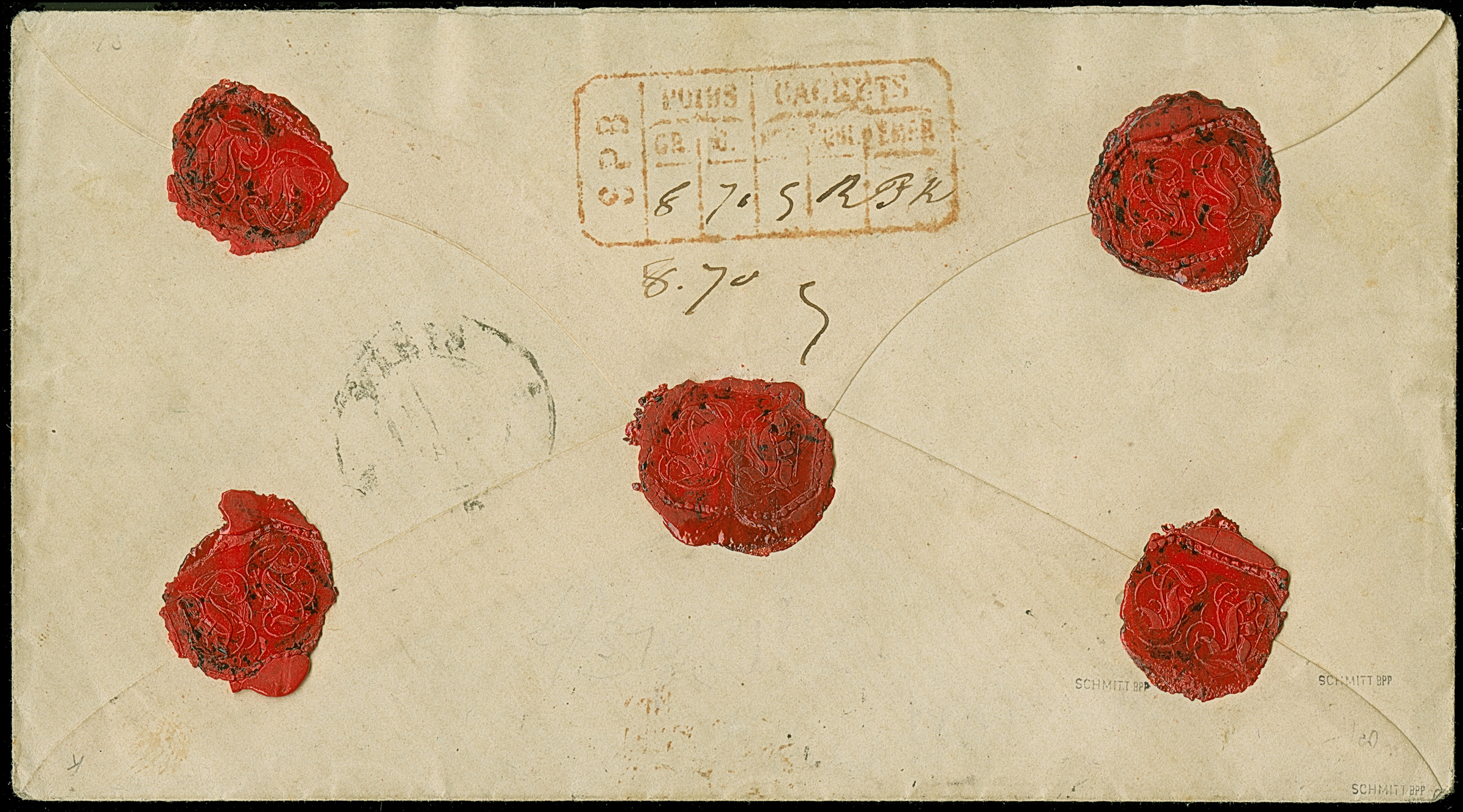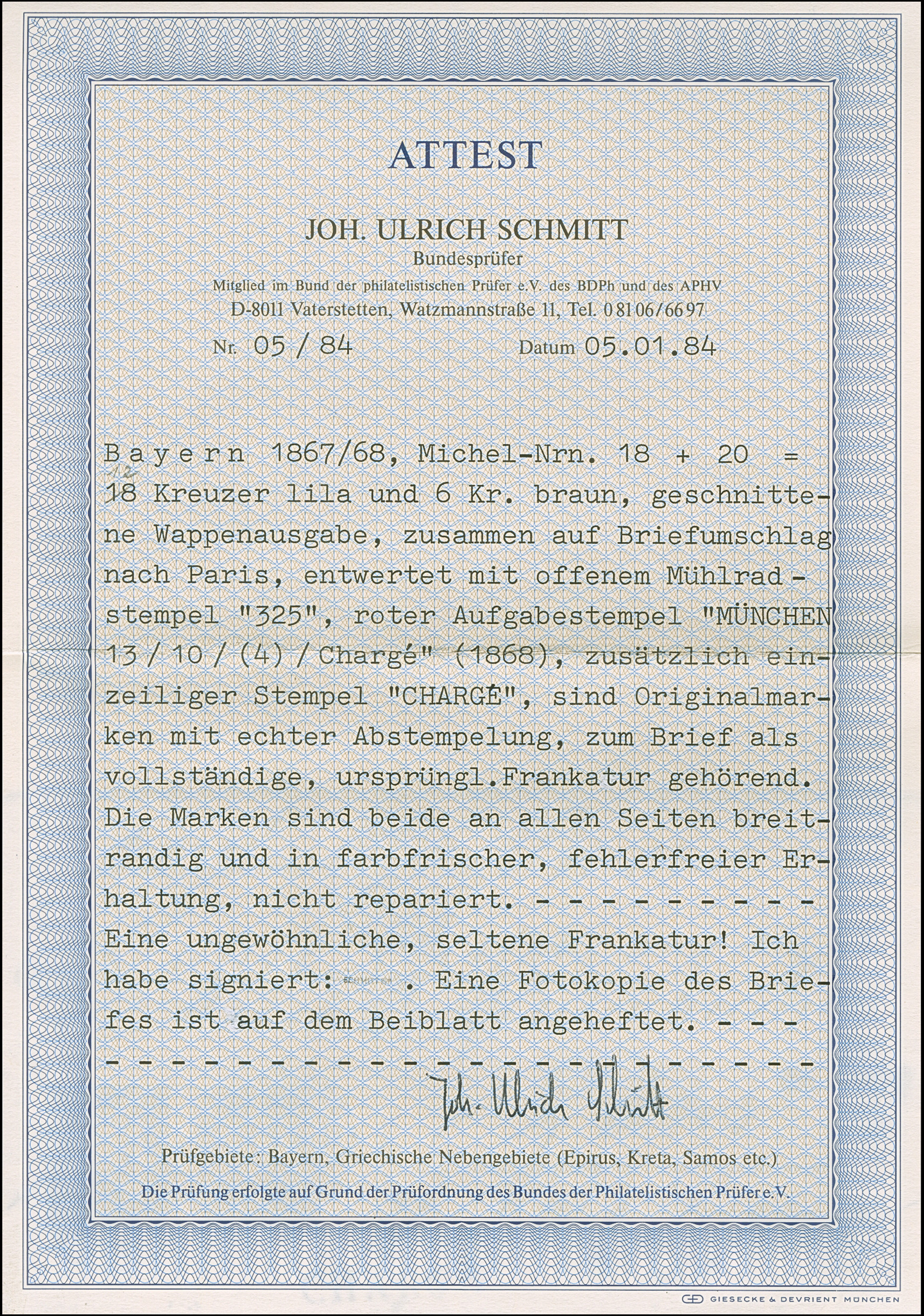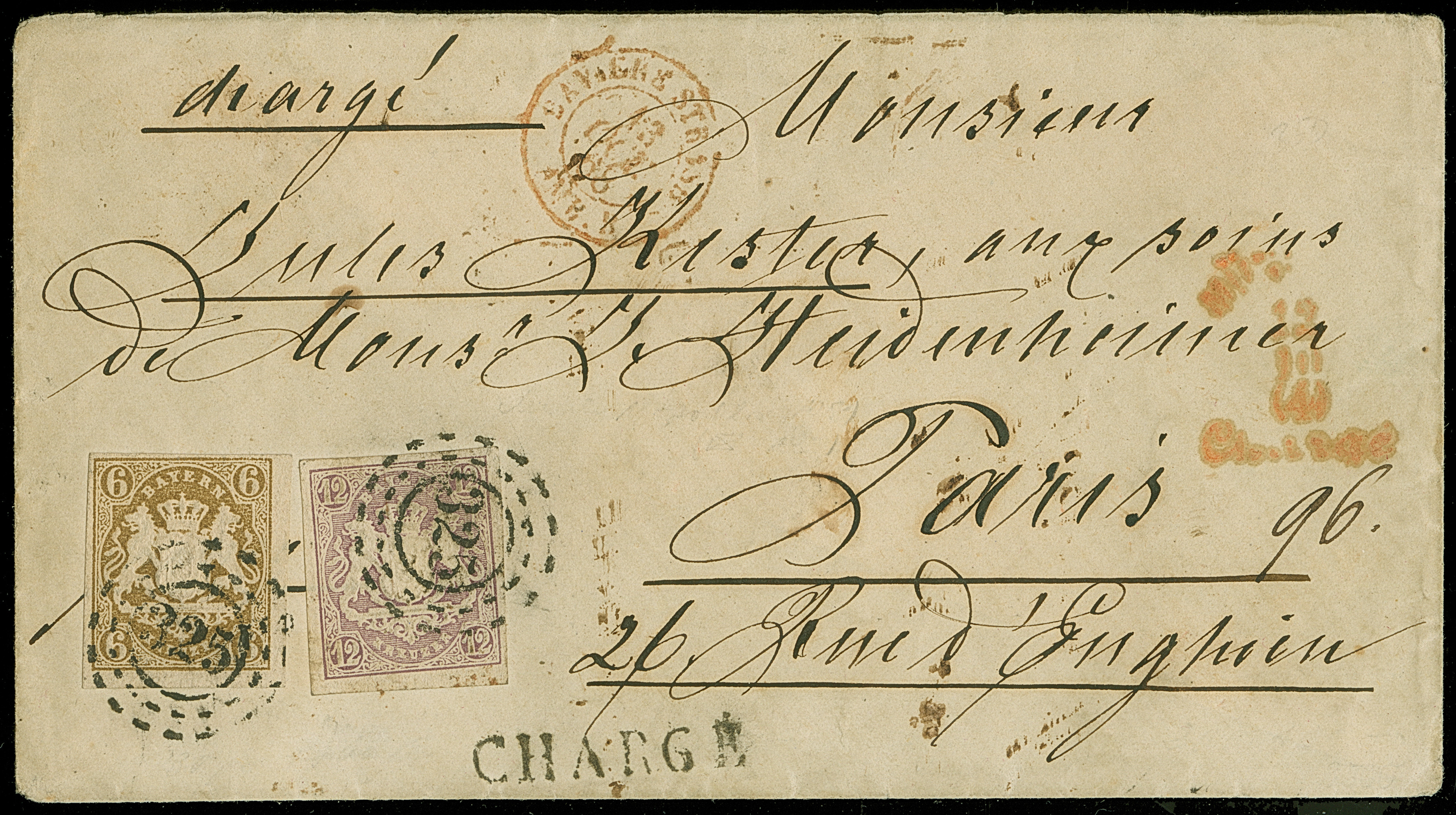 1867/68, Staatswappen 12 Kr. hellbraunviolett in Mischfrankatur mit 1868 6 Kr. ockerbraun, farbfrisch, voll- bis meist breitrandig geschnitten, sauber mit oMR “325” und nebengesetztem rotem Aufgabe-Stempel “MÜNCHEN 12 10 Charge” auf Charge-Brief nach Paris, eine seltene und attraktive Frankatur, sign. Schmitt BPP mit Fotoattest (1984)