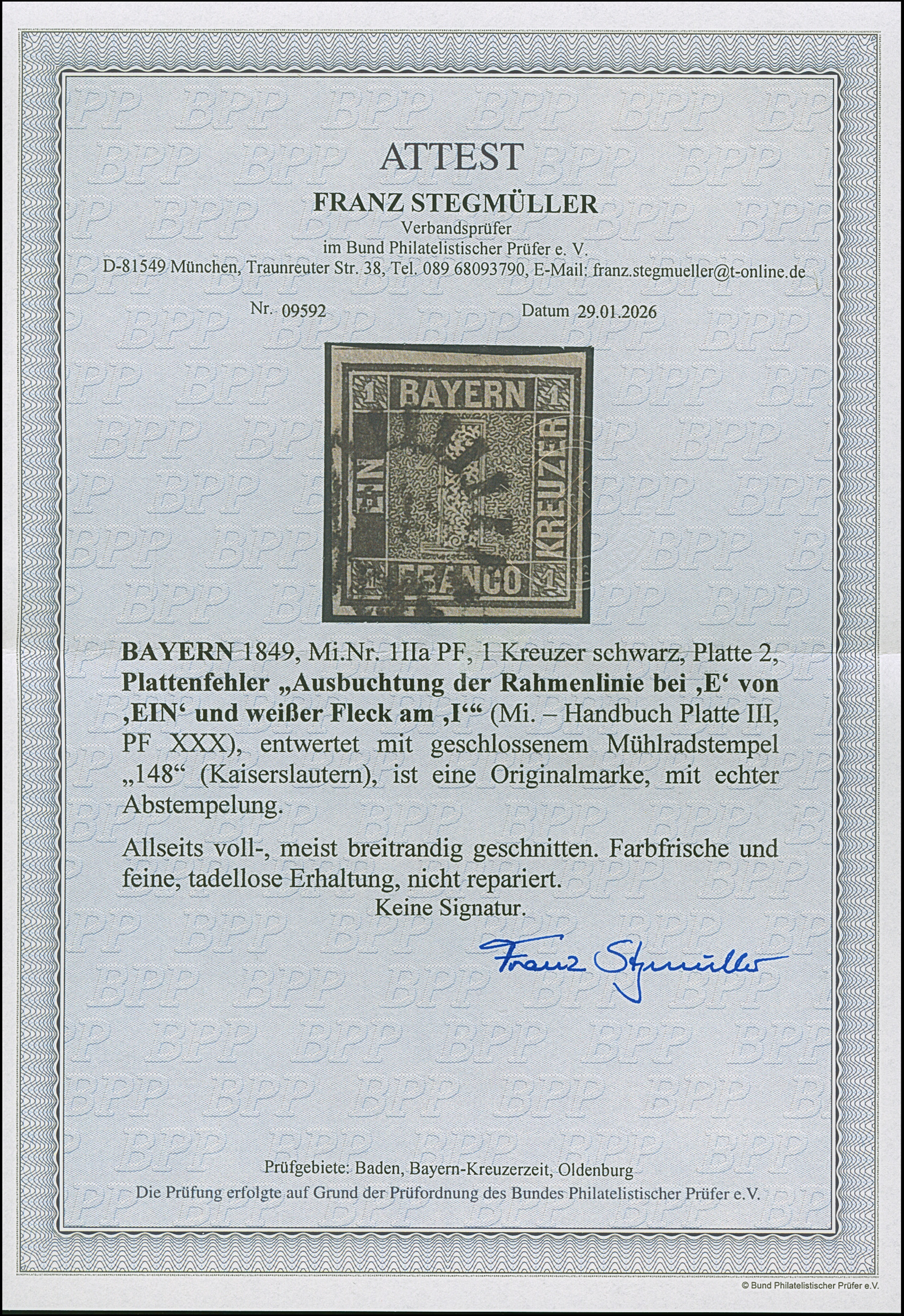 1 Kr. schwarz, Platte 2, Plattenfehler 'Ausbuchtung der Rahmenlinie bei E', farbfrisch und voll- bis breitrandig, sauber entwertet durch gMR "148" KAISERSLAUTERN. Tadellos. Fotoattest Stegmüller BPP (2026)