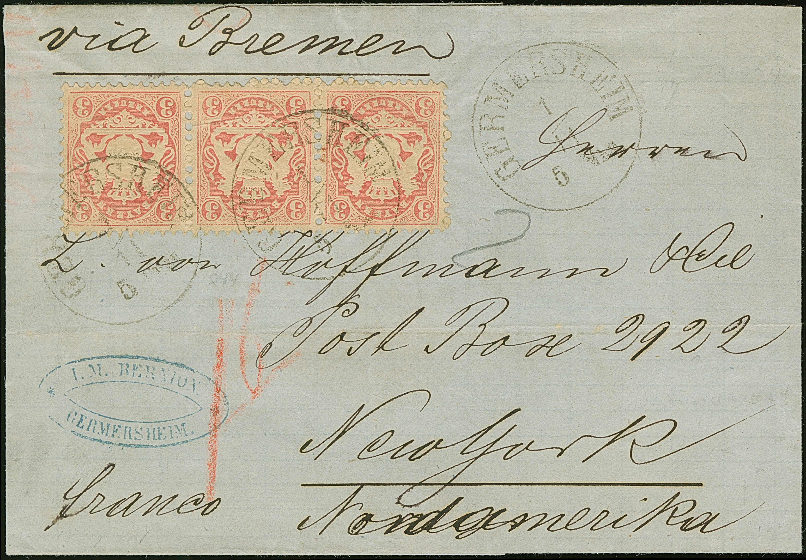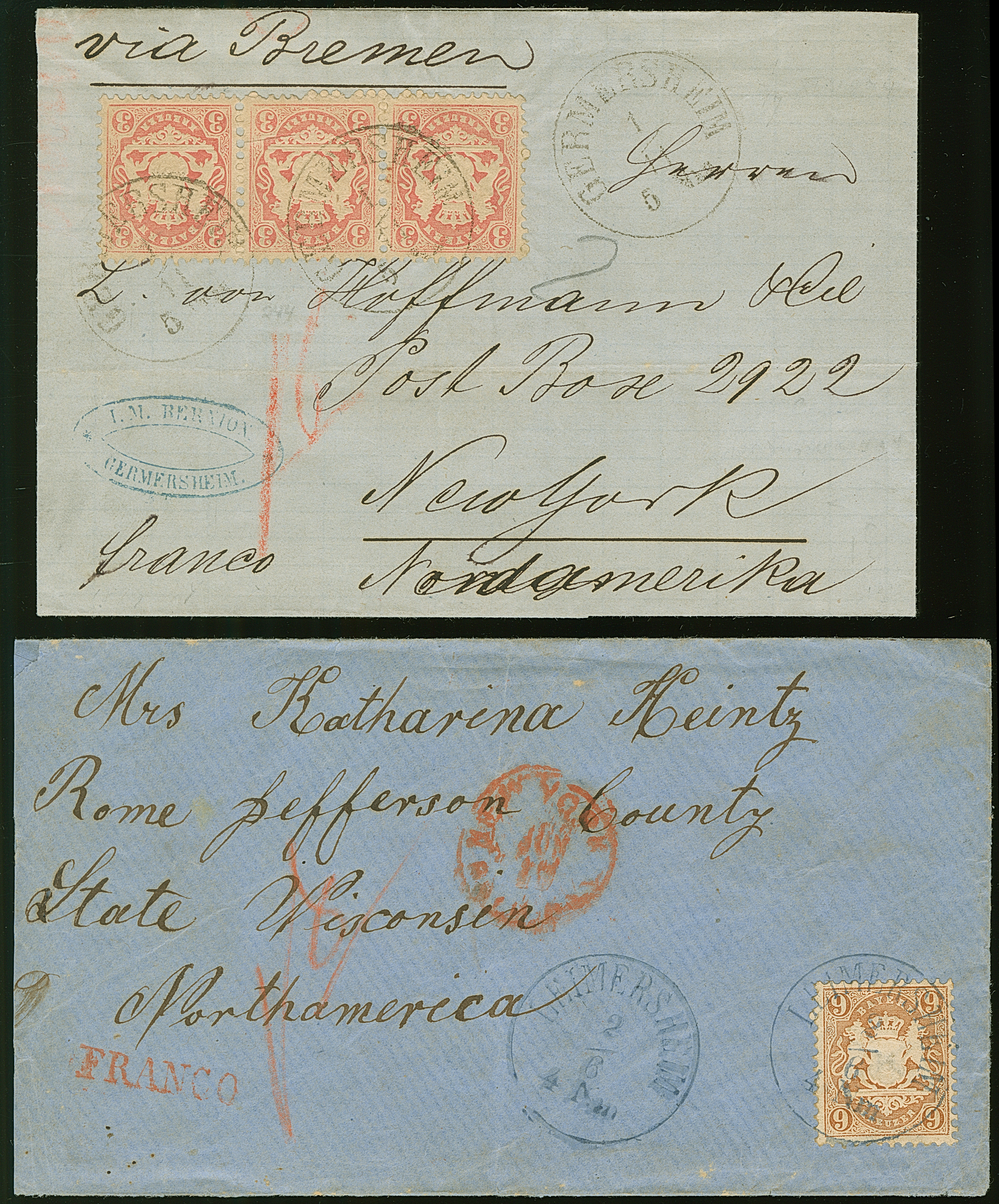 3 Kreuzer rosa im waagerechten 3er-Streifen bzw. 9 Kr. braun, je farbfrisch und gut gezähnt, auf Briefhülle bzw. Briefkuvert über Bremen in die Vereinigten Staaten. Brief mit 3 Kr. Fotoattest Schmitt BPP (2010)