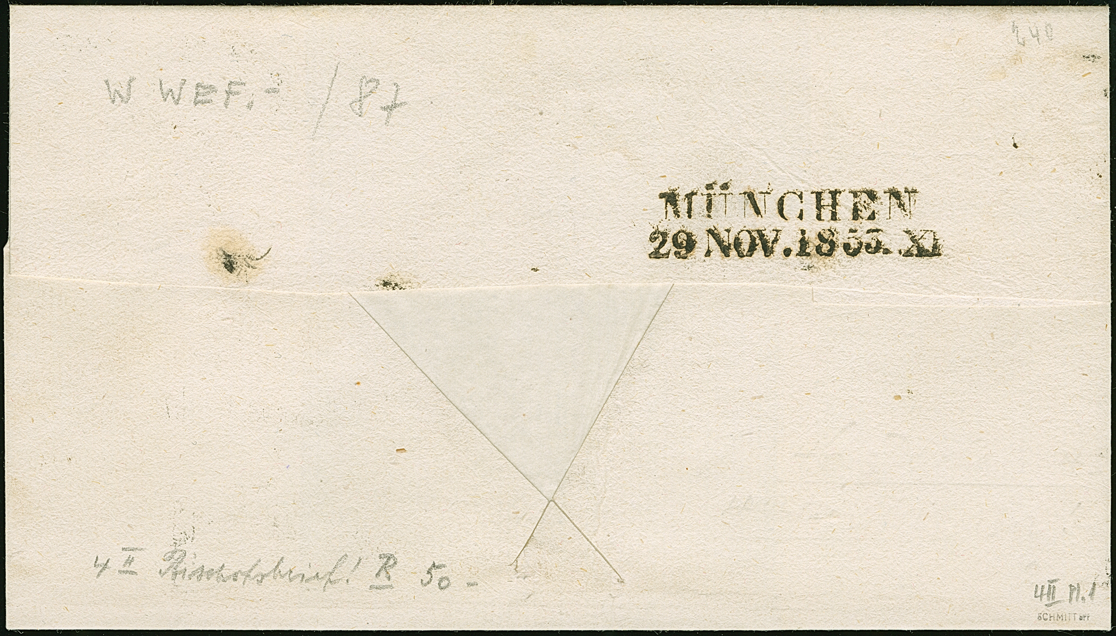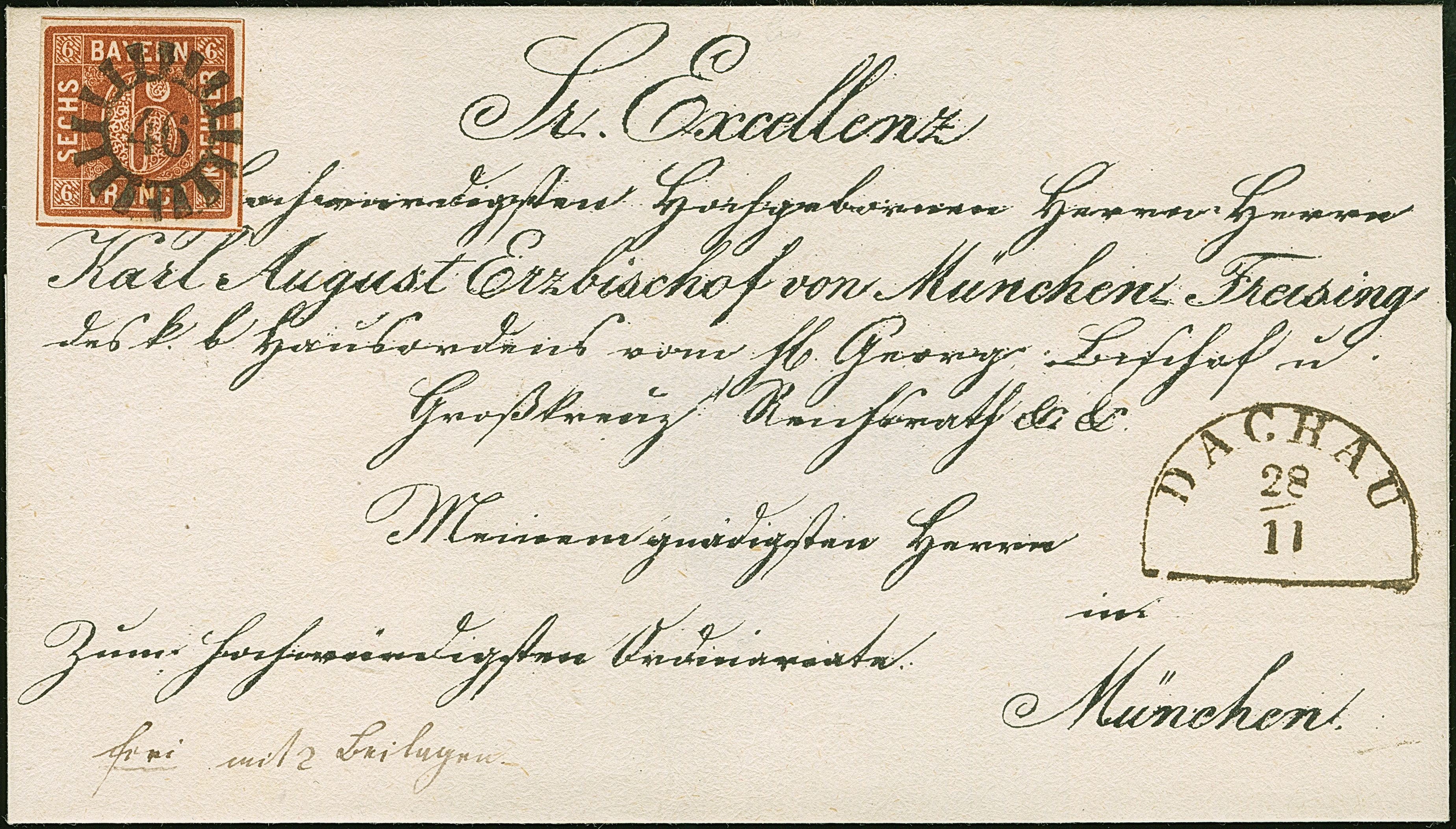 6 Kr. rötlichbraun, voll- bis breitrandig, mit klar und zentrisch aufgesetztem gMR "46" und klar nebengesetztem Halbkreis "DACHAU 28/11" auf Bischofsbrief an Karl August in München. Tadellos. Signiert Schmitt BPP