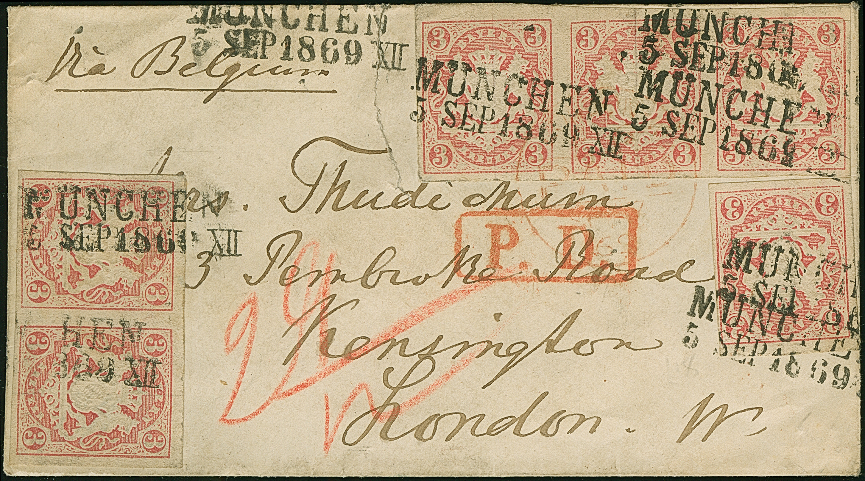 3 Kr. blau, Platte 3, zusammen mit 2 Einzelstücken 1 Kr. rosa und waagerechtem Dreierstreifen 6 Kr. braun, mit oMR "325" und nebengesetztem Halbkreis "BAHNH.MÜNCHEN 17/4" (1858) auf Briefcouvert nach London, nebengesetzte "P.D." und " T.F.". Der Brief war für den Leitweg über Belgien portogerecht frankiert, jedoch aufgrund des fehlenden Leitvermerkes über Frankreich befördert, was der Postkasse zusätzliche 2 Kreuzer Gewinn einbrachte. 4 Werte vollrandig mit Knittern, 2 Werte des Streifens oben leicht berührt. Ein interessanter und attraktiver Brief. Signiert Brettl BPP, Fotoattest Sem BPP (2011)