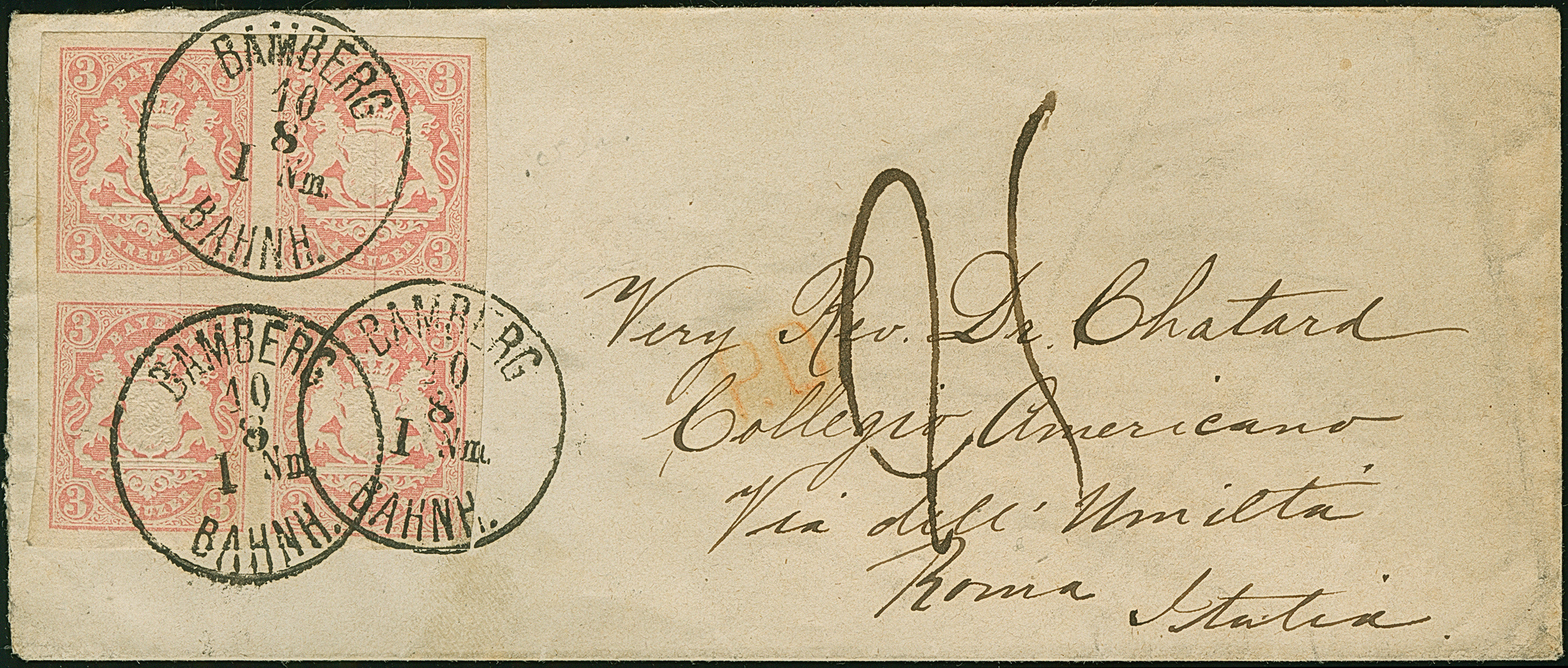 3 Kr. rosa im 4er-Block, farbfrisch und allseits breitrandig, mit sauber aufgesetztem EKr. "BAMBERG BAHNH. 10 8" (1869) auf kleinem Briefkuvert nach Rom im Kirchenstaat. Eine der besten Block-Frankaturen dieser Marke; mit dieser Destination hat PROFI keinen weiteren Beleg registriert.