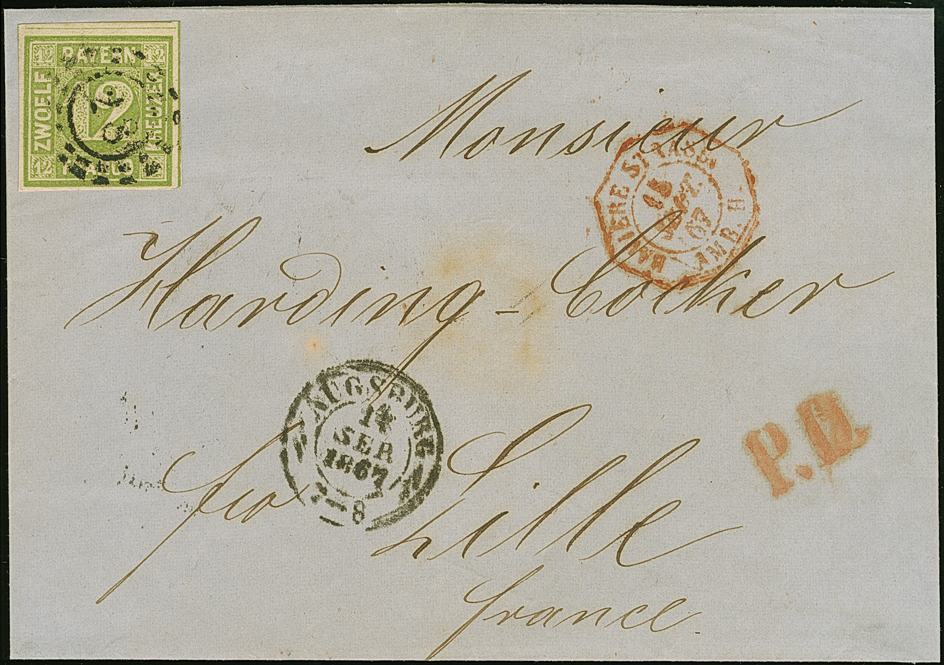 12 Kreuzer grün, voll- bis meist breitrandig mit oMR "28" und nebengesetztem DKr. "AUGSBURG 14 SEP. 1867" auf Briefhülle nach Lille, Pracht, signiert Brettl BPP