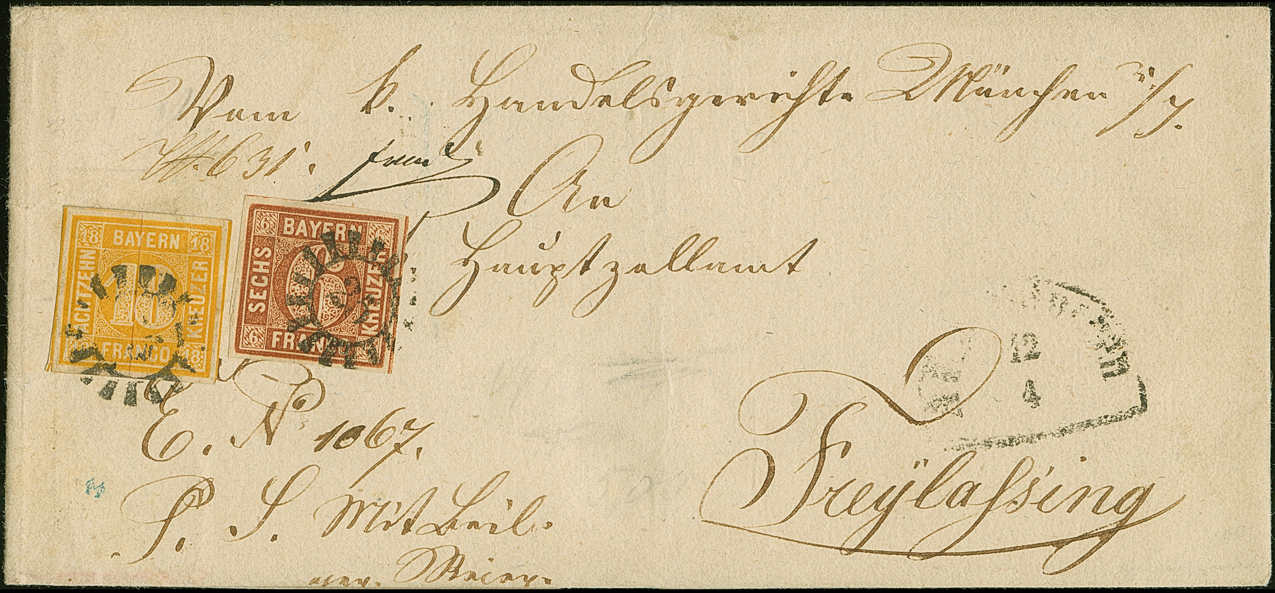 18 Kr. gelborange und 6 Kr. braun Type II, Platte 2, beide voll- bis breitrandig, teils mit Schnittlinien, mit gMR "25" und nebengesetztem Halbkreis "AU B. MÜNCHEN 12/4" (1859) auf Briefhülle der 4. Gewichtsstufe nach Freilassing. Eine äußerst seltene Inlands-Frankatur in einwandfreier Erhaltung. Fotoattest Sem BPP (2018)