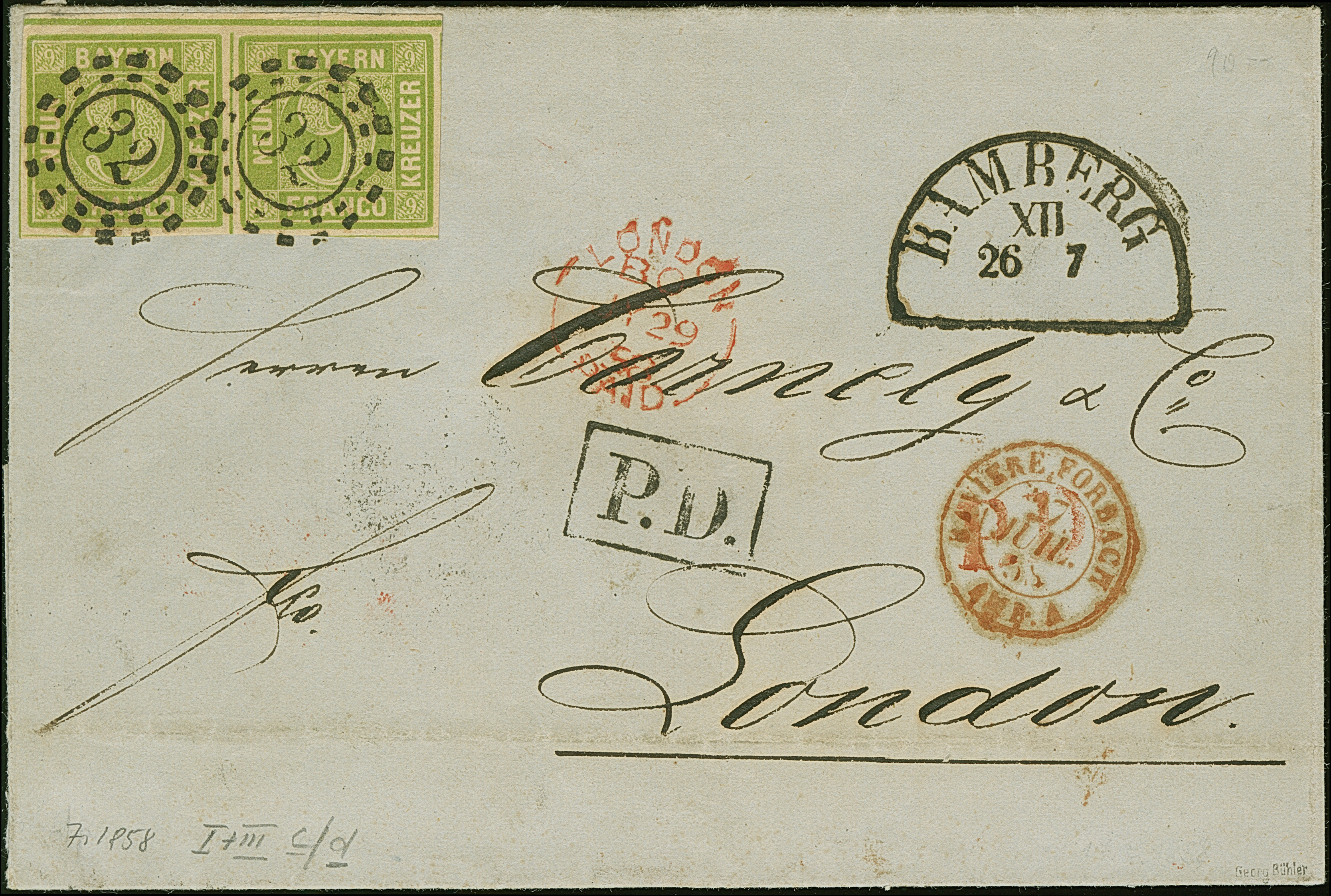 9 Kr. gelbgrün im waagerechten Paar der Typen I und III, farbfrisch und allseits breitrandig, oben mit schmalem Bogenrand, mit klarem oMR "32" und sauber nebengesetztem Halbkreis "BAMBERG 26 7" (1858) auf kpl. Faltbrief über Frankreich nach London. Eine in dieser Form sehr seltene und attraktive Frankatur. Signiert Georg Bühler