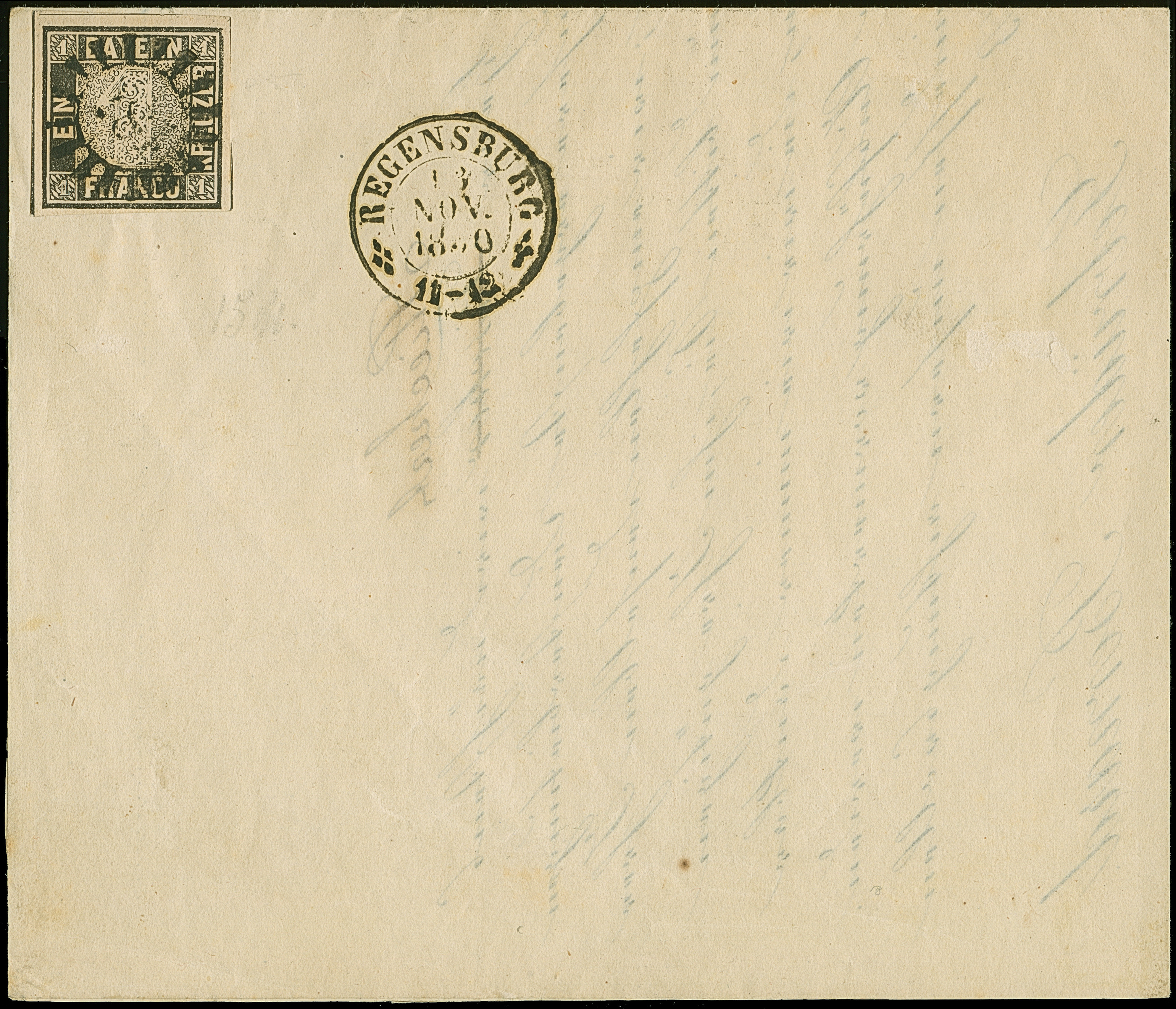 1849, 1 Kr. schwarz, Platte 1, farbfrisch und allseits voll- meist breitrandig geschnitten, links mit durchgehender Trennungslinie, sauber mit gMR “281” und nebengesetztem DKr. “REGENSBURG 13 NOV 1850” auf Vertreterankündigung ohne Adressschleife, tadellos, ein schönes und ursprüngliches Ganzstück aus dem November, Fotoattest Stegmüller BPP (2025)