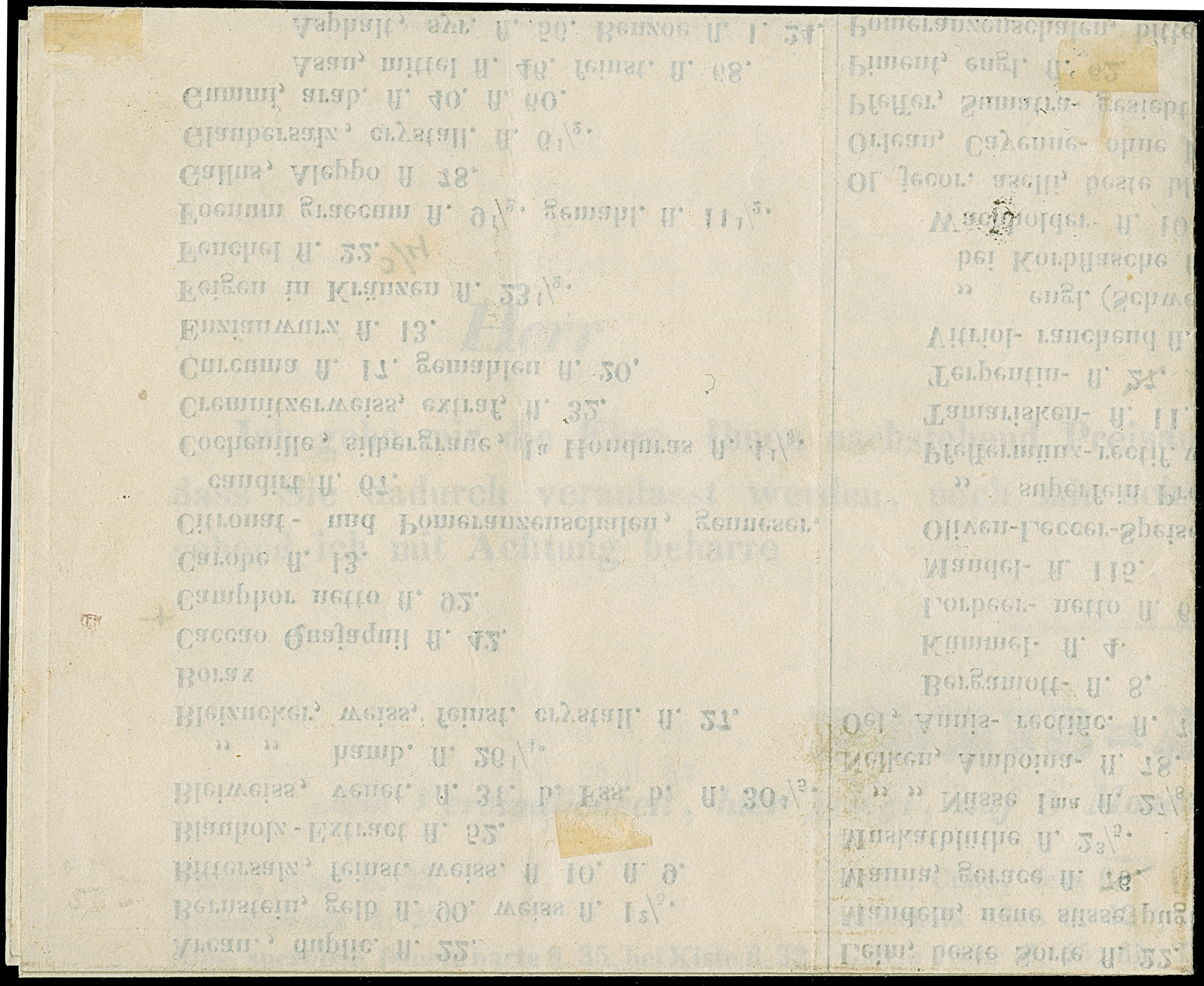 1849, 1 Kr. schwarz, Platte 1, farbfrisch und allseits breitrandig geschnitten, oben und rechts mit durchgehender Trennungslinie, sauber mit gMR “217” (=MÜNCHEN) auf Drucksache (gedruckte Preisliste) ohne Adressschleife, tadellos, ein schönes und ursprüngliches Ganzstück, Fotoattest Stegmüller BPP (2025)