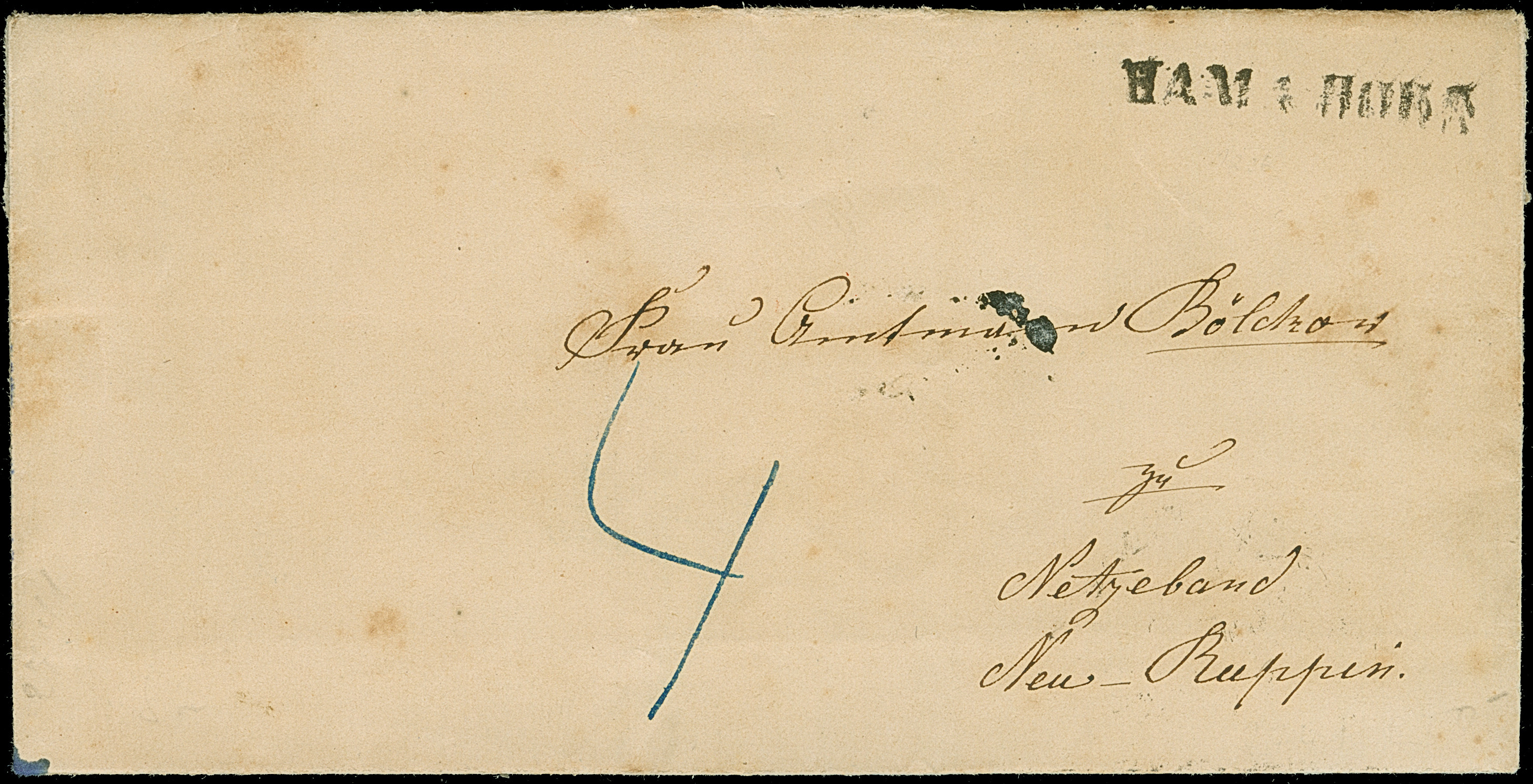 1857, "HAM & HORN", Langstempel, sauber abgeschlagen auf komplettem, unbezahltem kleinen Faltbrief von Hamm nach Neuruppin; rückseitig durch Langstempel des Stadtpost-und preußischen Postamtes.
