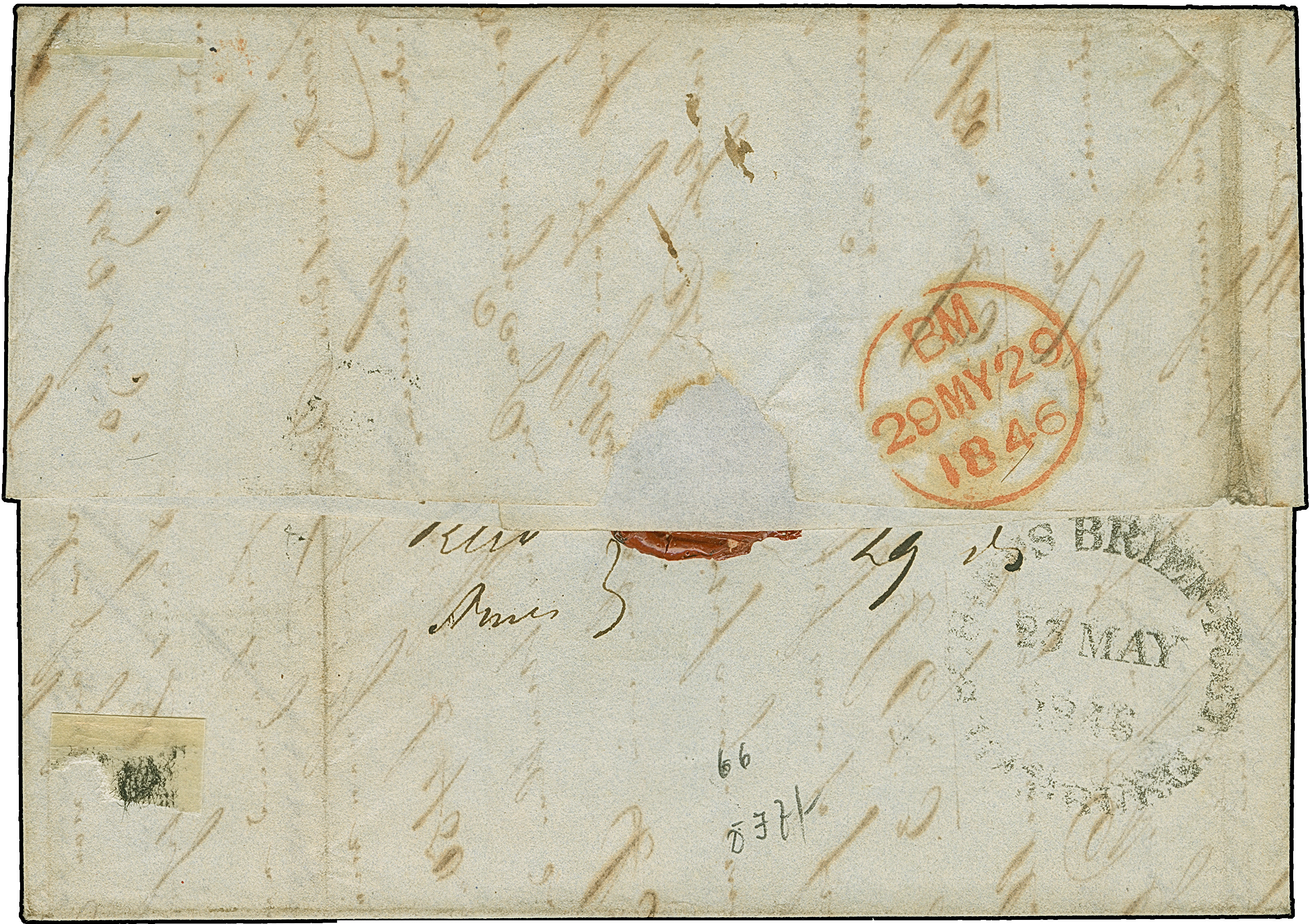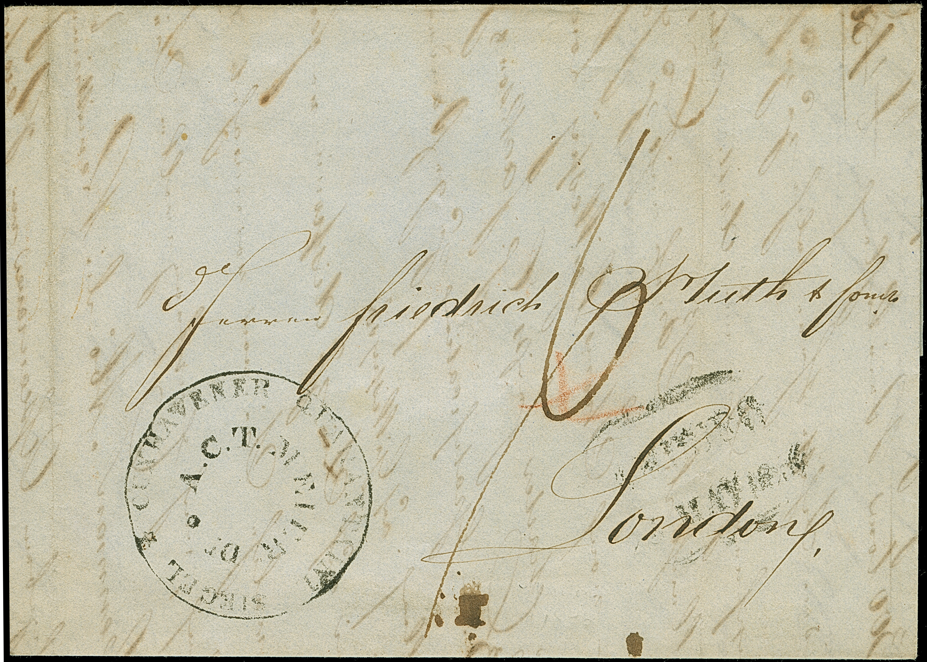 1846, "CUXHAVENER QUARANTÄNE-SIEGEL DR. A.C.T. MEIER", sauber auf komplettem Faltbrief der Hut-Korrespondenz nach London, mit nebengesetztem Schmetterlingsstempel "HAMBURG ..MAY 1846", rückseitigem Schiffsbrief- und Ankunftsstempel.