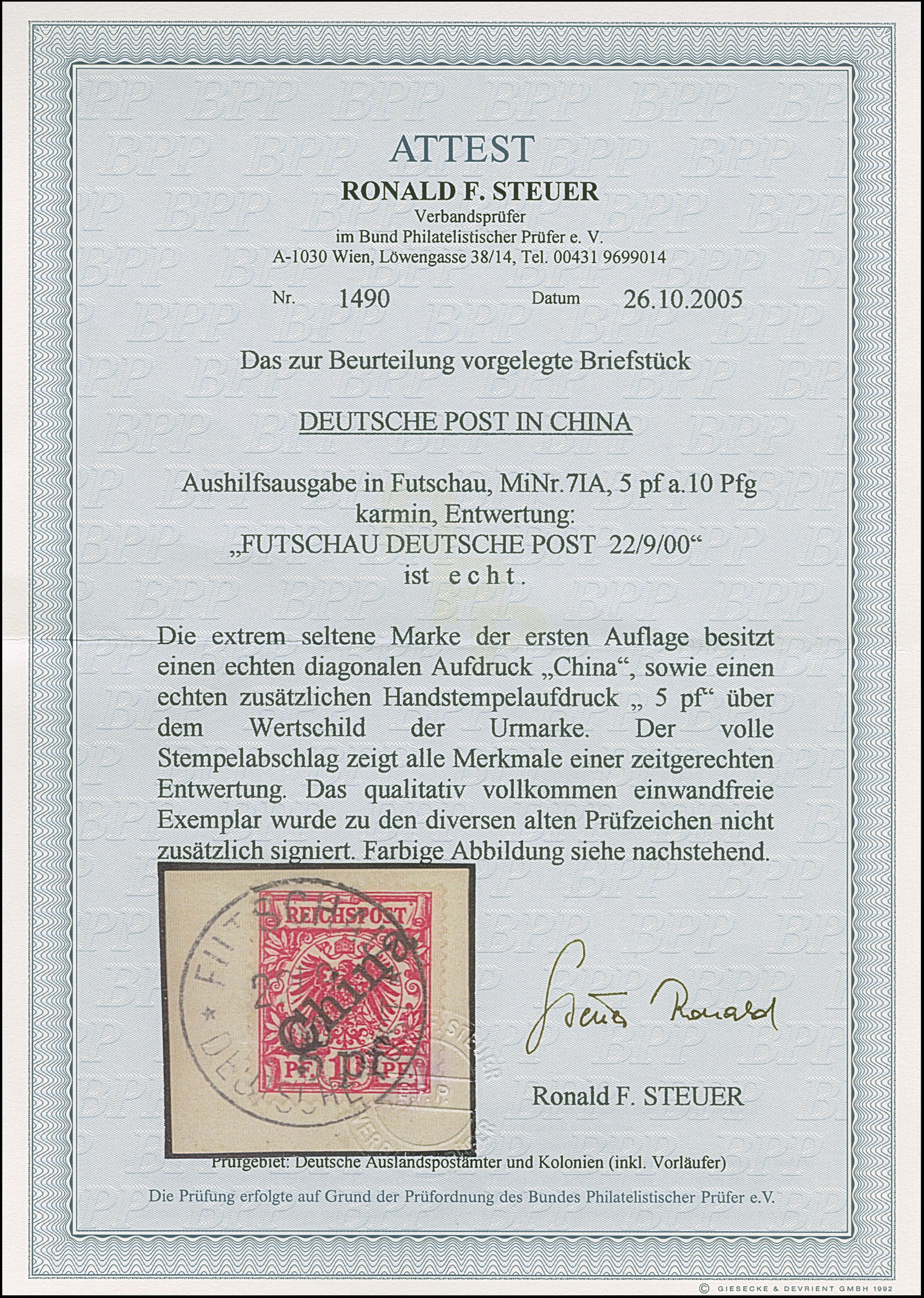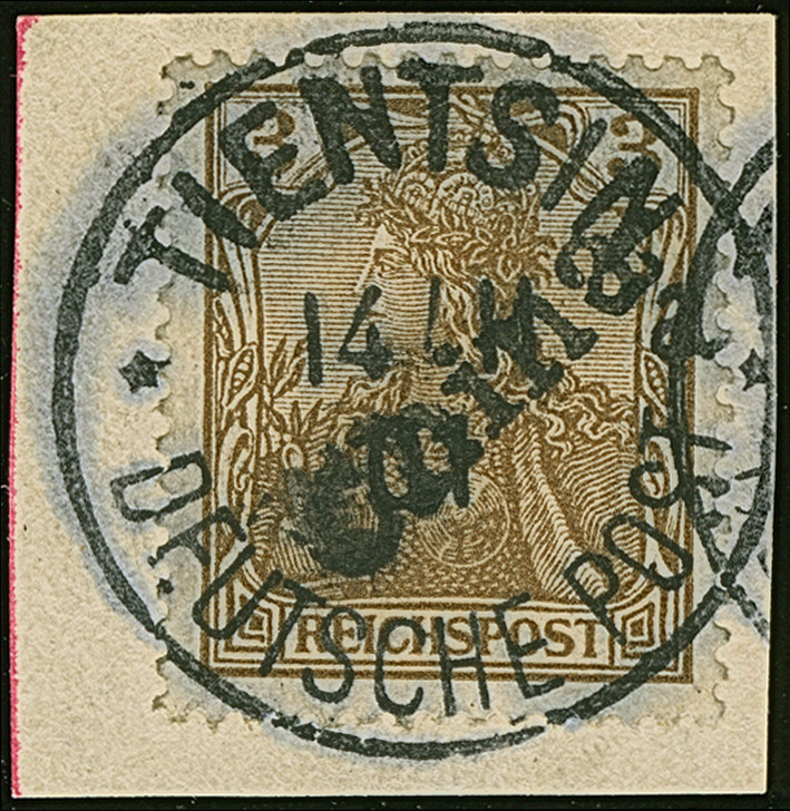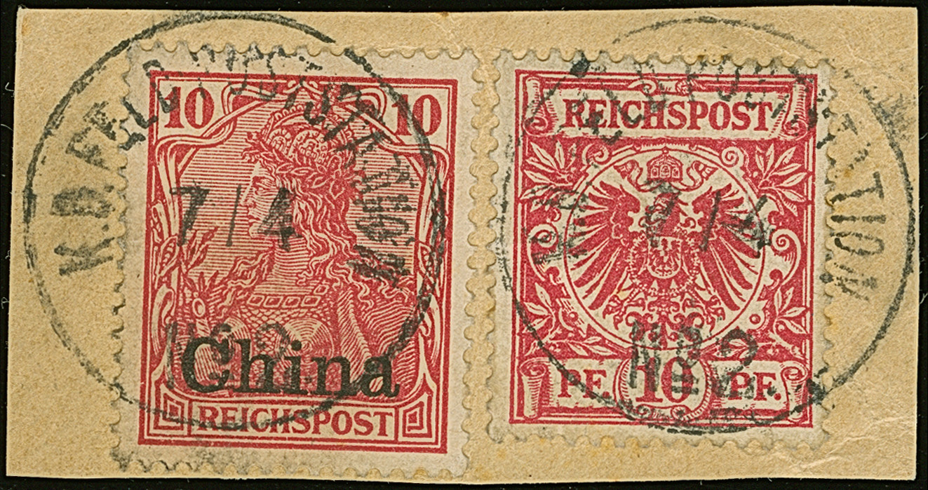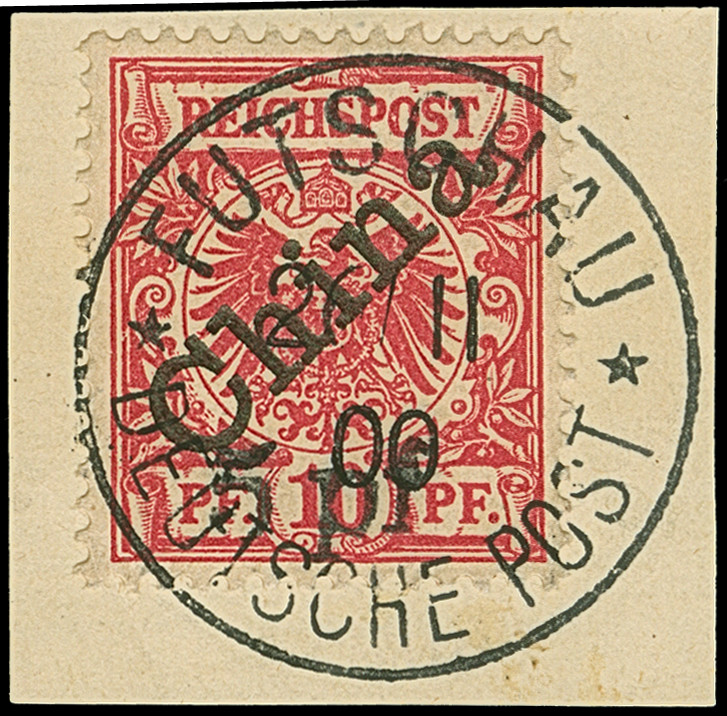 1900, 5 pf auf Diagonal 10 Pfg. mit Stempel “FUTSCHAU DP ** 26.11.00” auf Briefstück. Die farbfrische Marke ist gut gezähnt und in einwandfreier Erhaltung, sign. Pfenninger und Bothe BPP