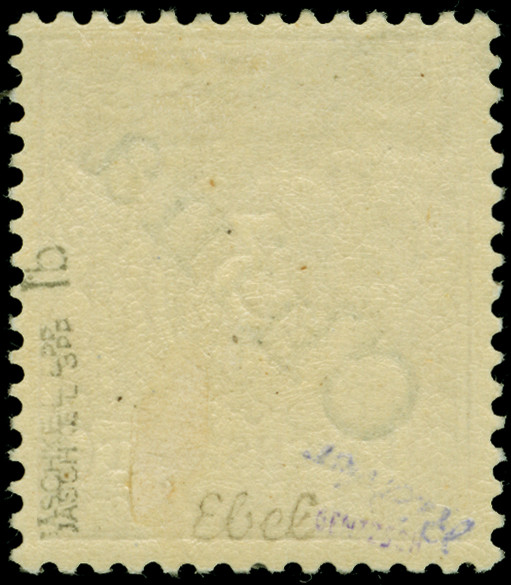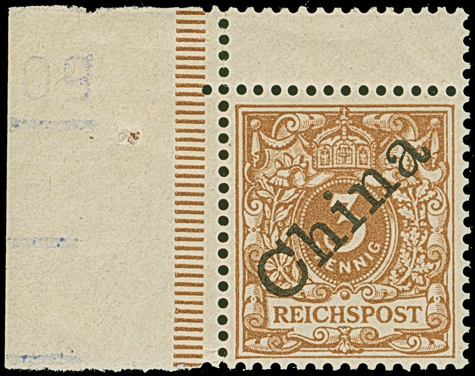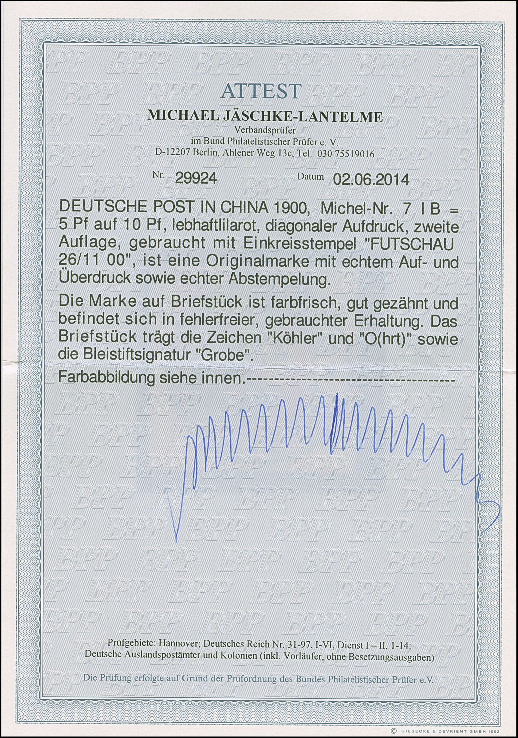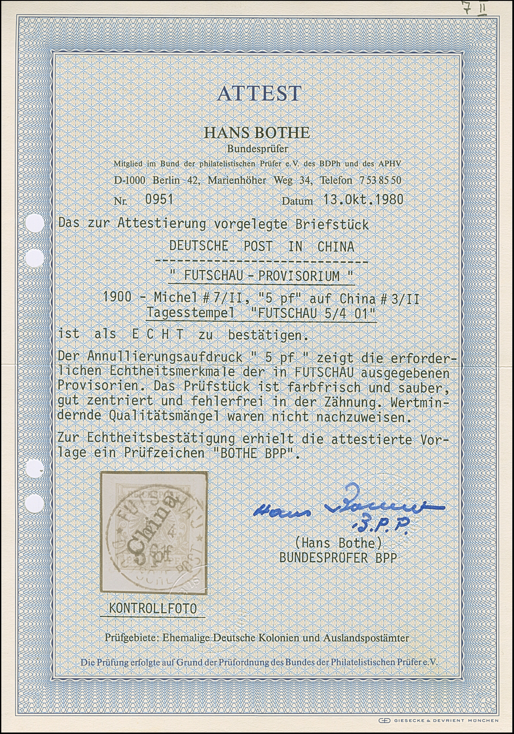 1900, 5 pf auf Diagonal 10 Pfg. mit Stempel “FUTSCHAU DP ** 26.11.00” auf Briefstück. Die farbfrische Marke ist gut gezähnt und in einwandfreier Erhaltung, sign. Pfenninger und Bothe BPP
