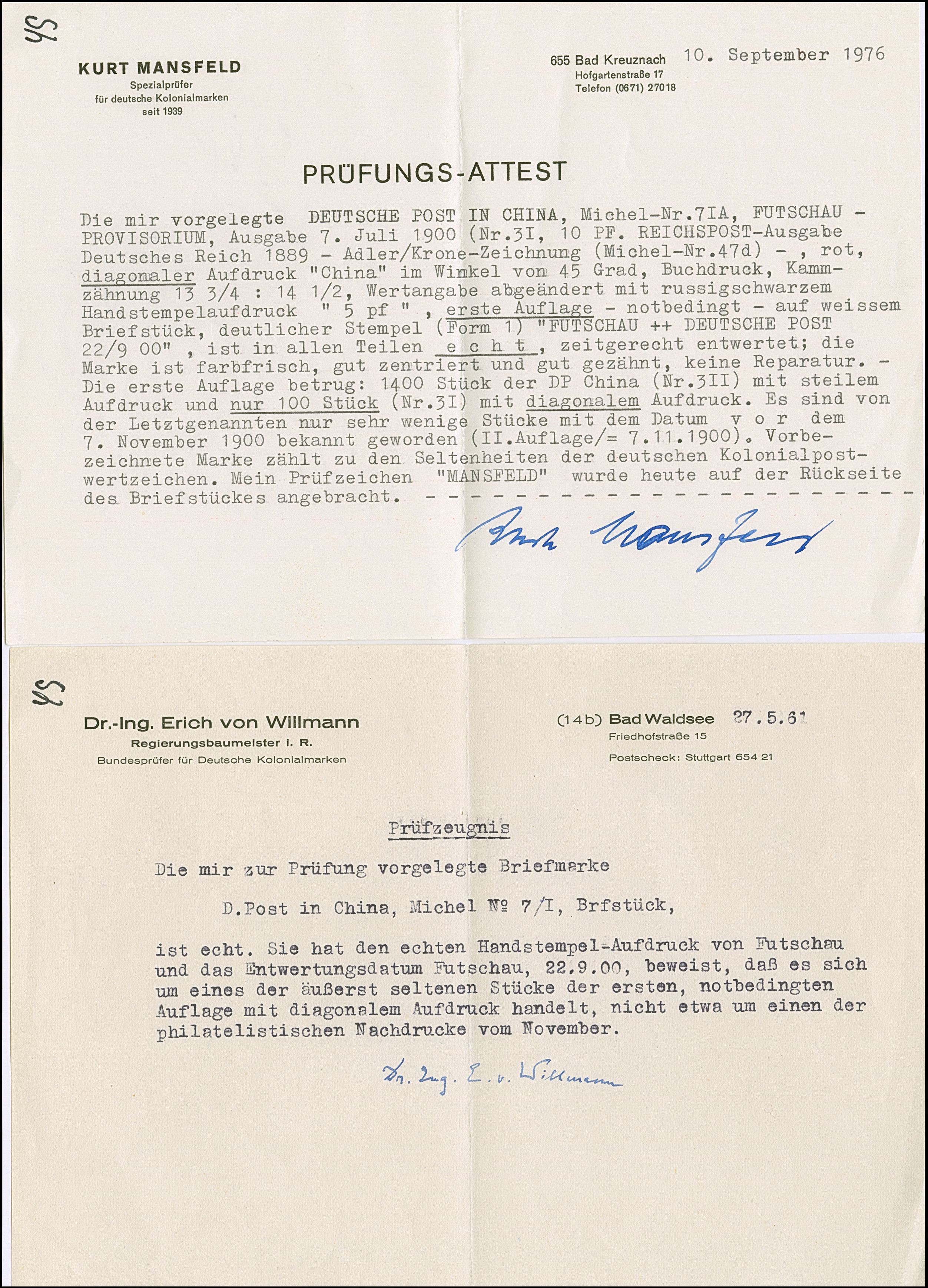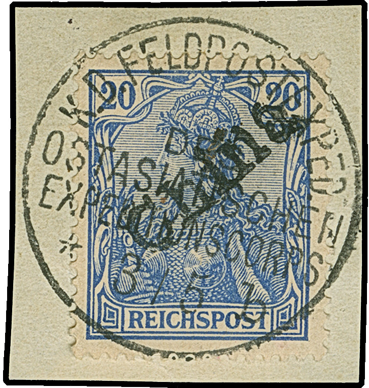 1900, 5 pf. auf Diagonalaufdruck 10 Pfg. mit Stempel “FUTSCHAU DP 22.9.00” auf Briefstück in einwandfreier Erhaltung. Ein sehr schönes Exemplar mit der sehr seltener, früher Entwertung vor Anfang November 1900, sign. Willmann mit Attest (1961, Mansfeld mit Attest (1976) und Fotoattest R. Steuer BPP (2005)