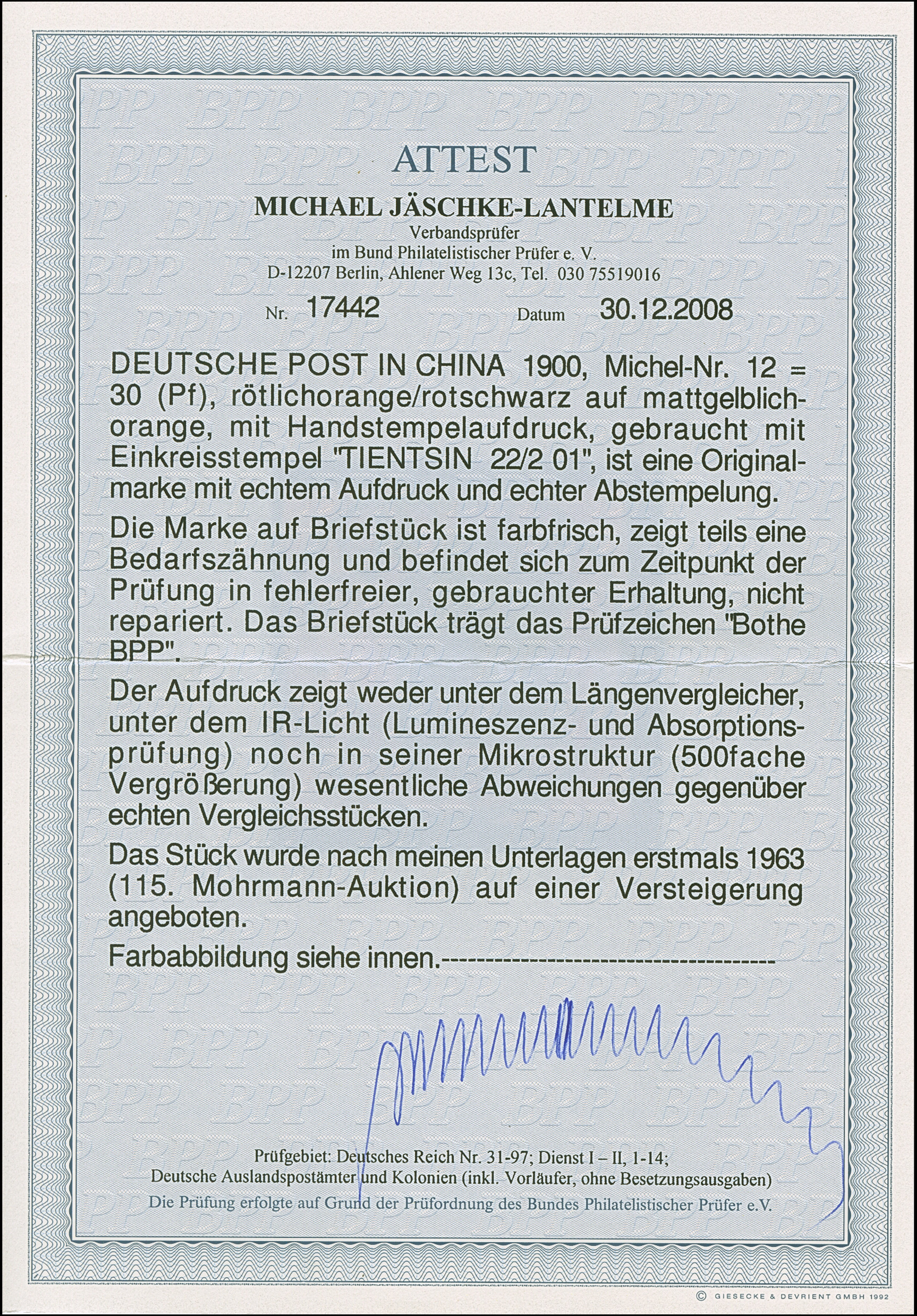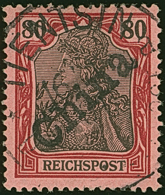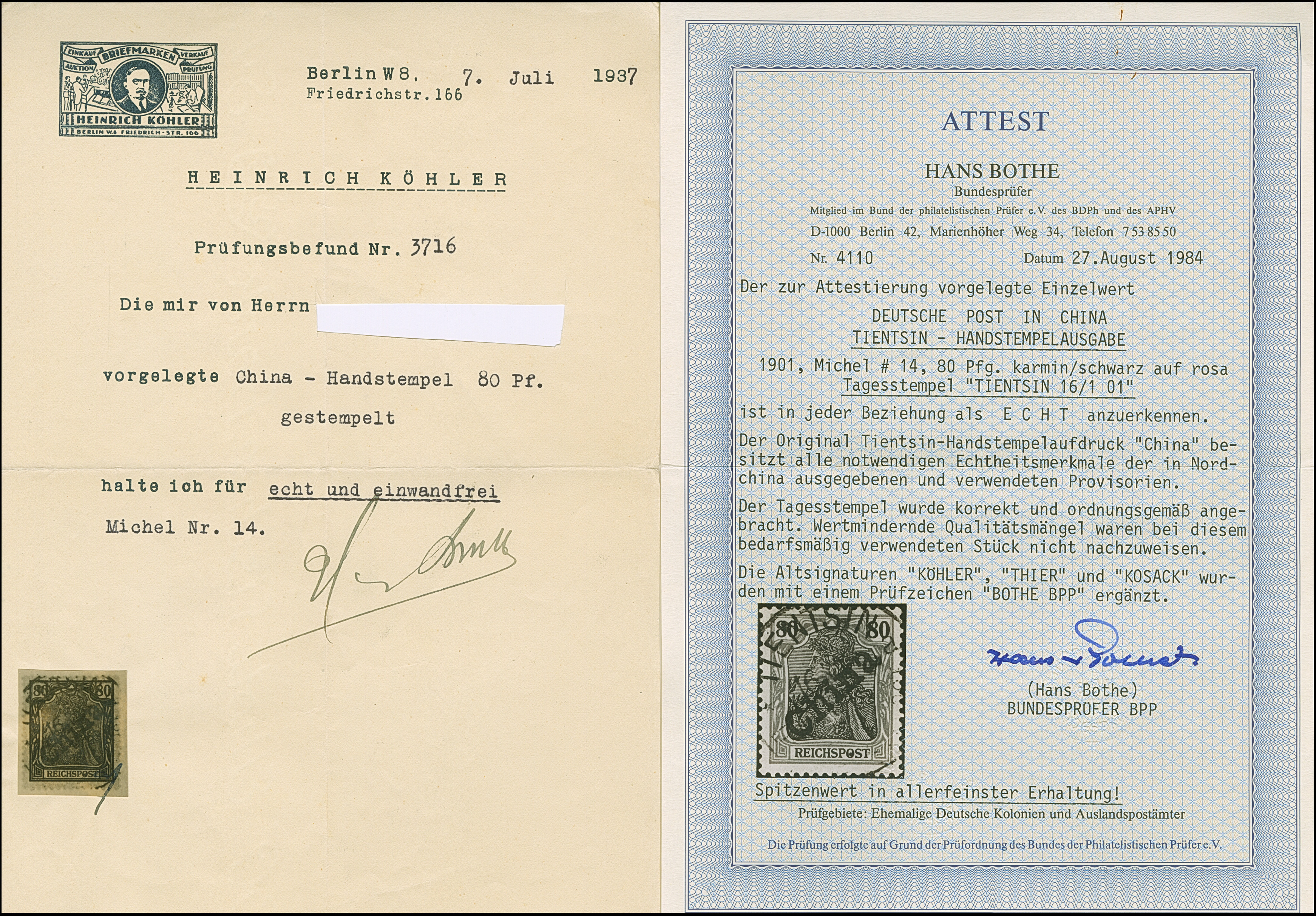 1900, Handstempel 80 Pfg., farbfrisch und normal gezähnt, sauber entwertet “TIENTSIN 16/1 01”, tadellos, ein schönes Exemplar dieser seltenen Marke, sign. Thier, sowie Köhler mit Fotoattest (1937) und Fotoattest Bothe BPP (1984)