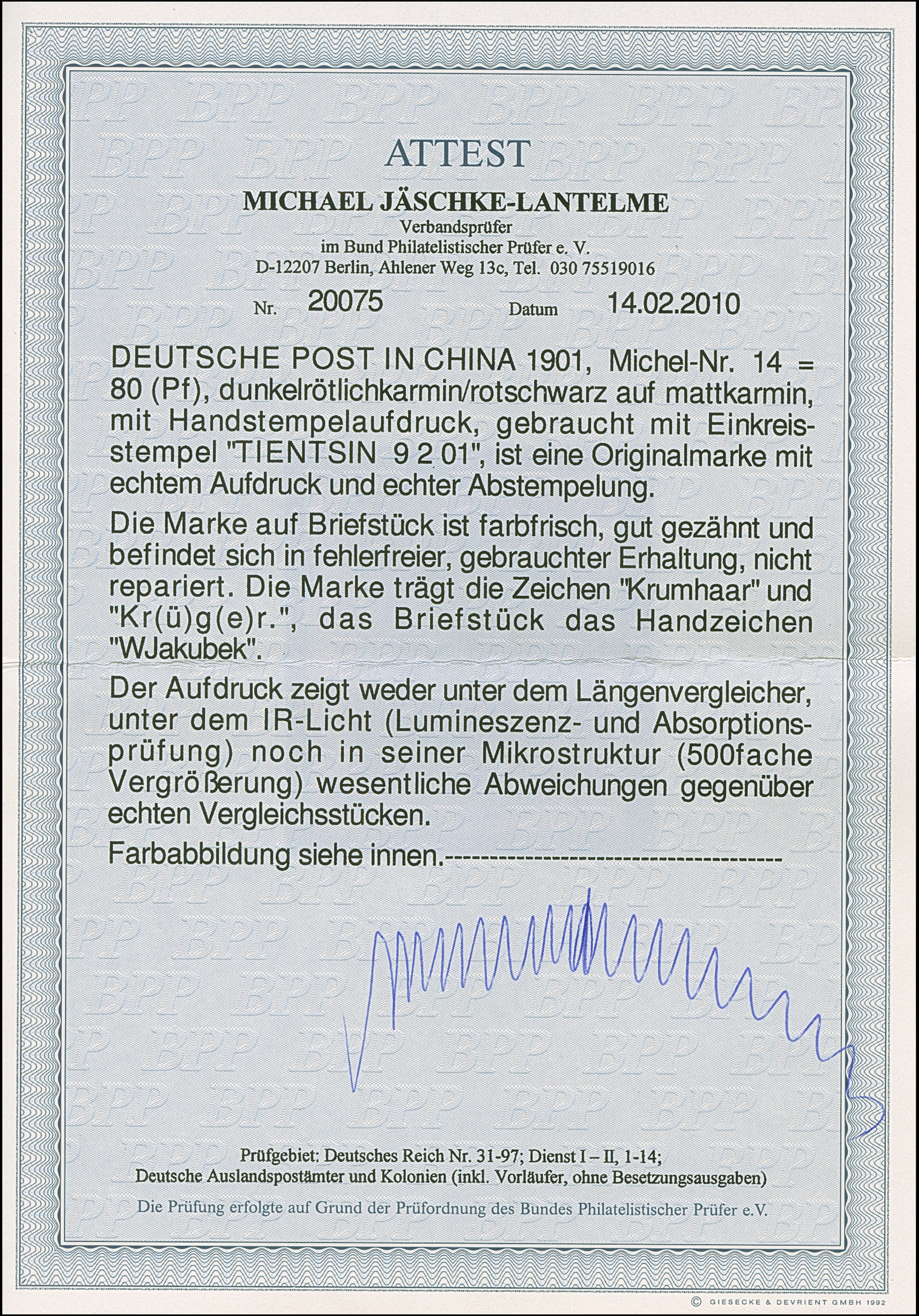 Handstempel 80 Pfg. mit klarem Stempel “TIENTSIN DP *a 9.2.01” auf Briefstück. Die farbfrische Marke ist in tadelloser Erhaltung. Sicherlich eine der schönsten Exemplare dieser seltenen Marke, sign. Kr(ü)g(e)r, Krumhaar und Bleistiftsignatur W. Jakubek sowie Fotoattest Jäschke-L. BPP (2010)