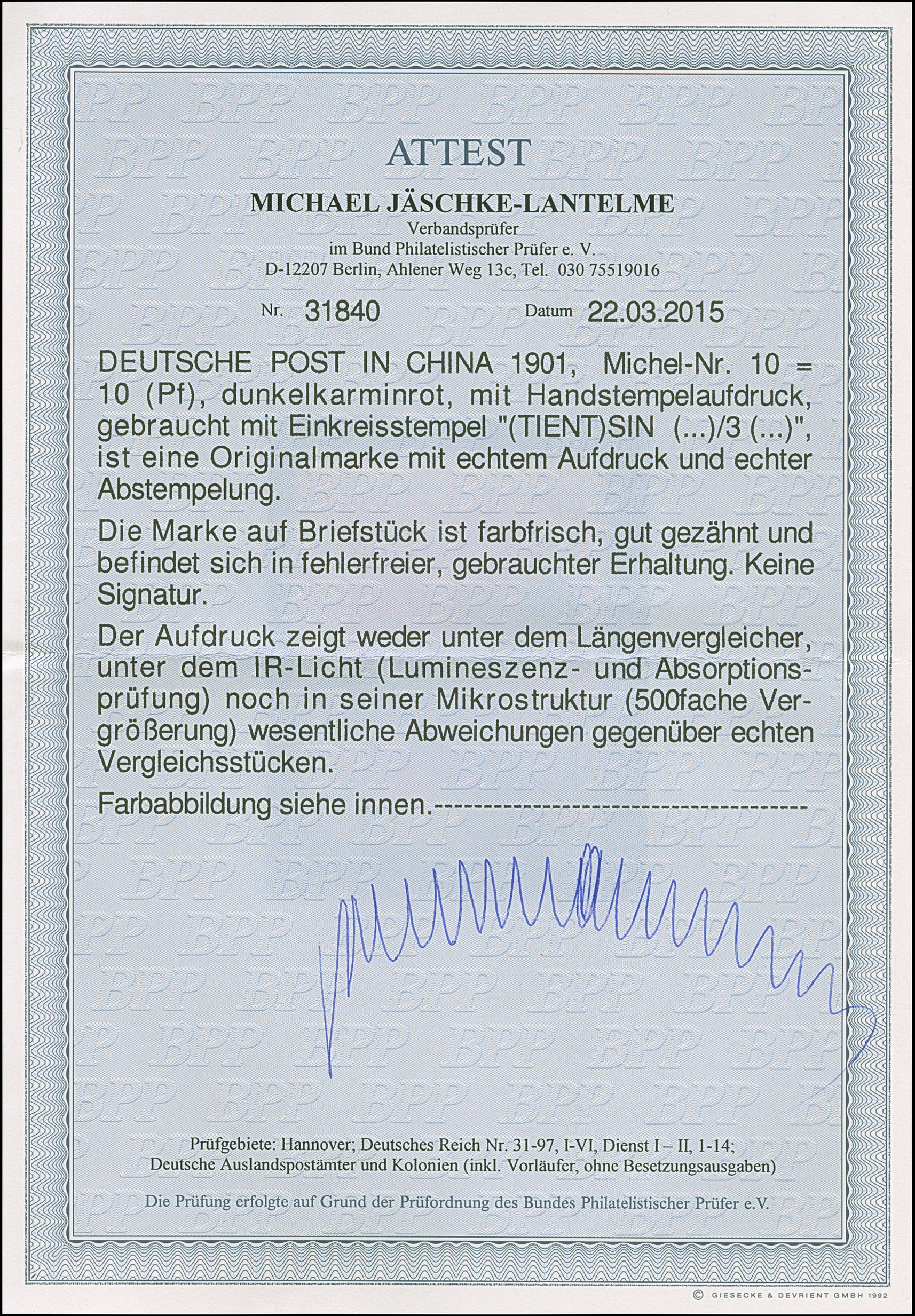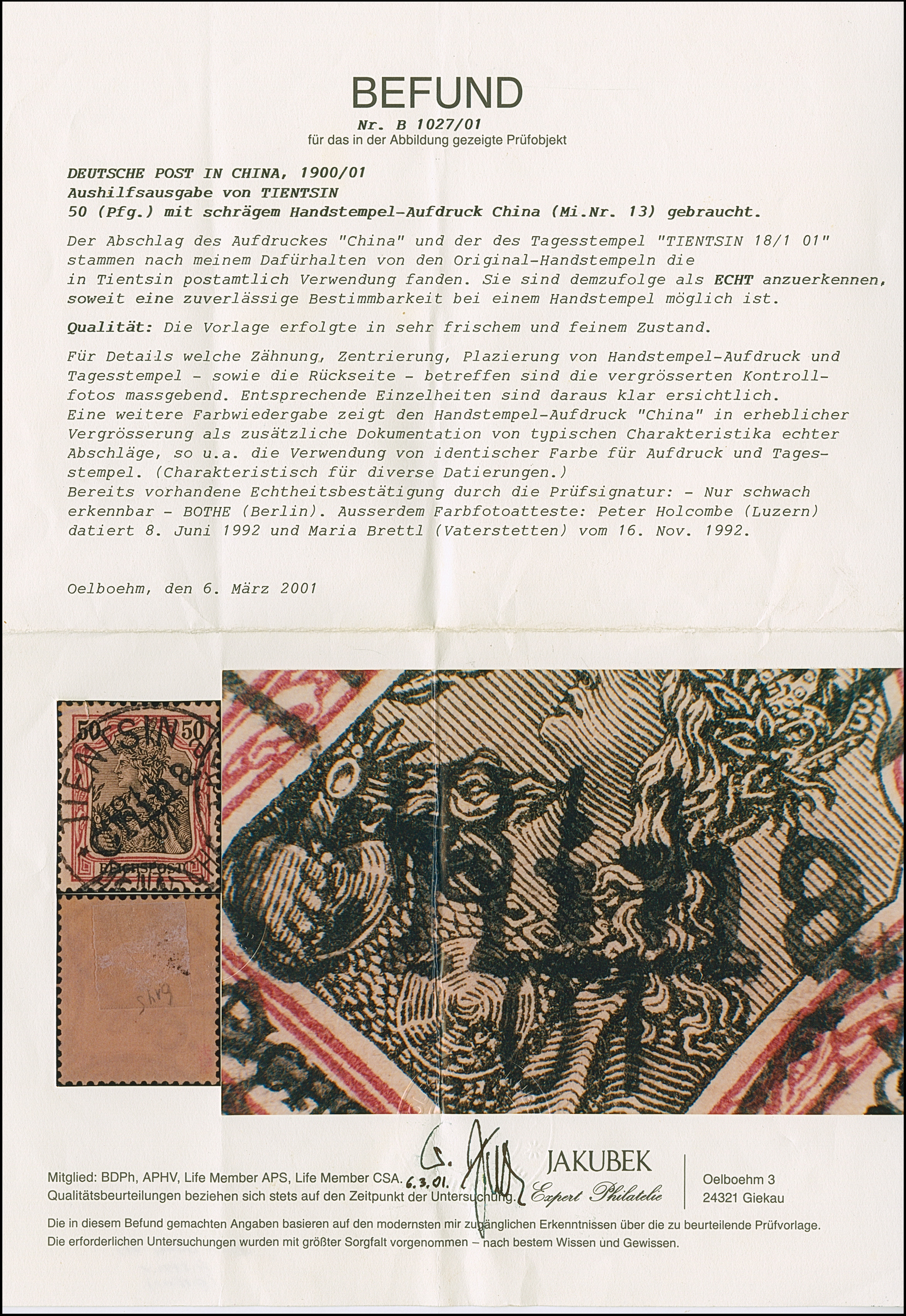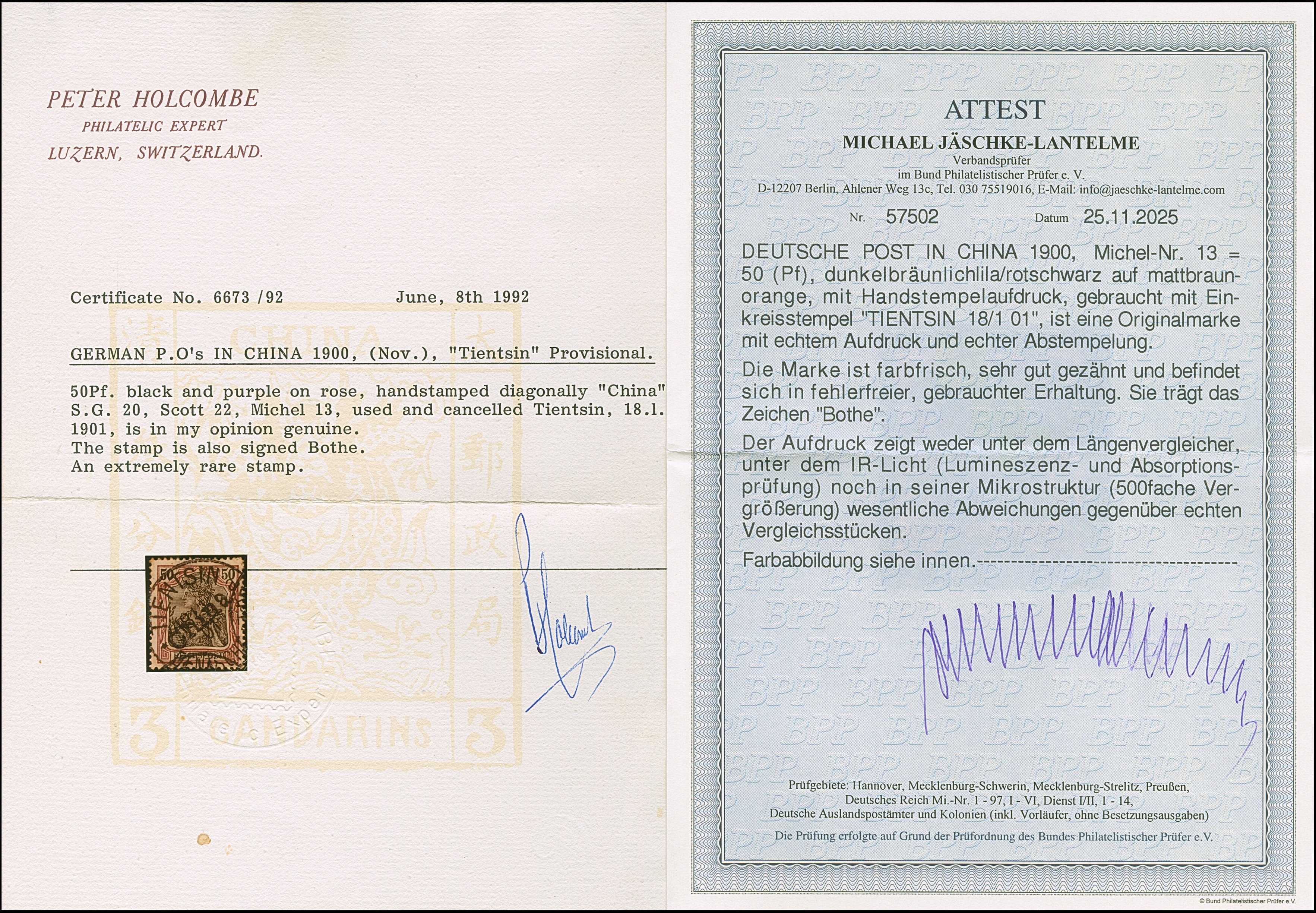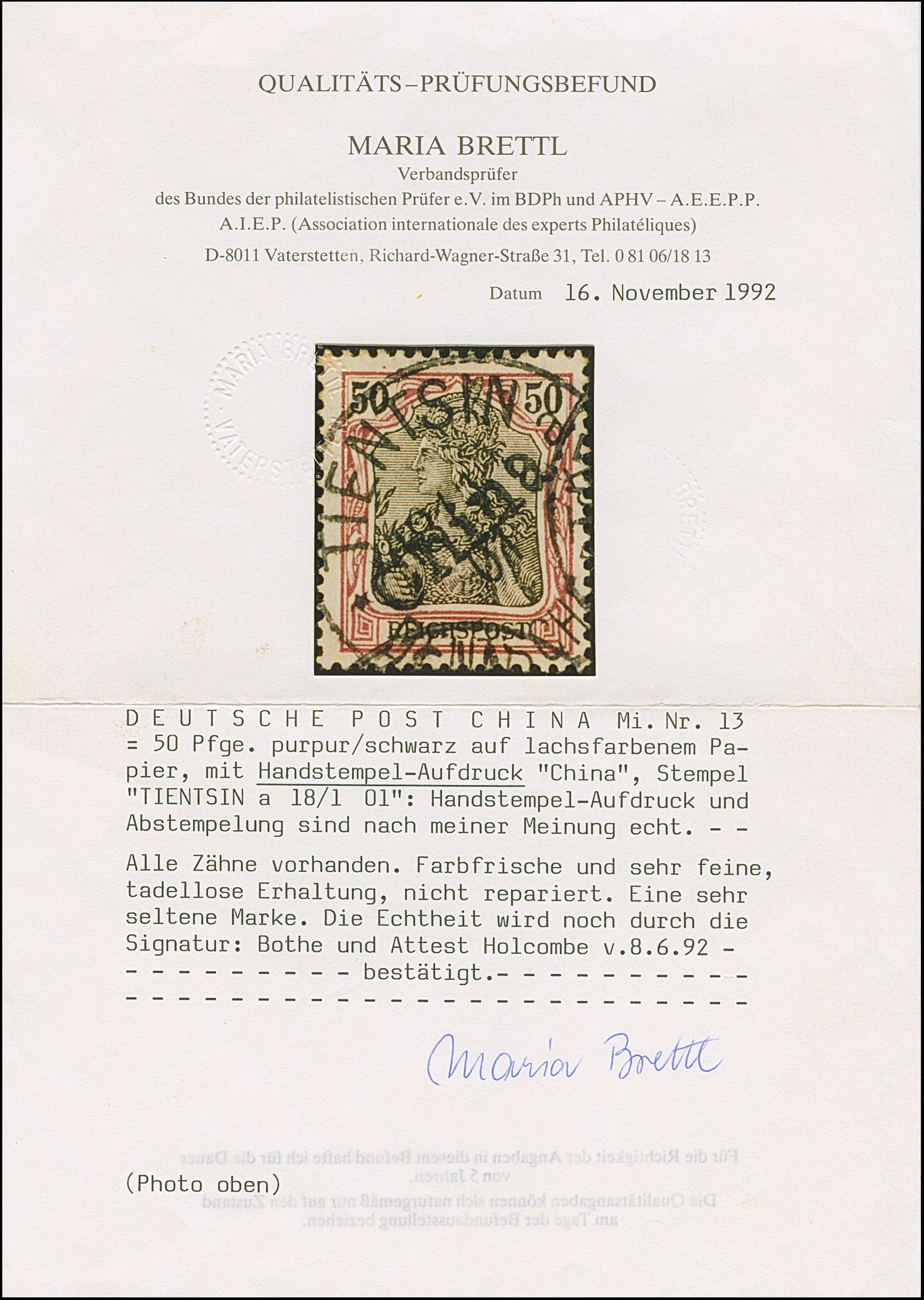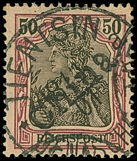 Handstempel 50 Pfg. mit Stempel “TIENTSIN DP 18.1.01”, die farbfrische Marke ist sehr gut gezähnt und in tadelloser Erhaltung. Ein außergewöhnlich schönes Stück mit Stempel der Sorte I, sign. Bothe und Befunde Brettl BPP (1992), Holcombe (1992) und Jakubek (1992) sowie Fotoattest Jäschke-L. BPP (2025)