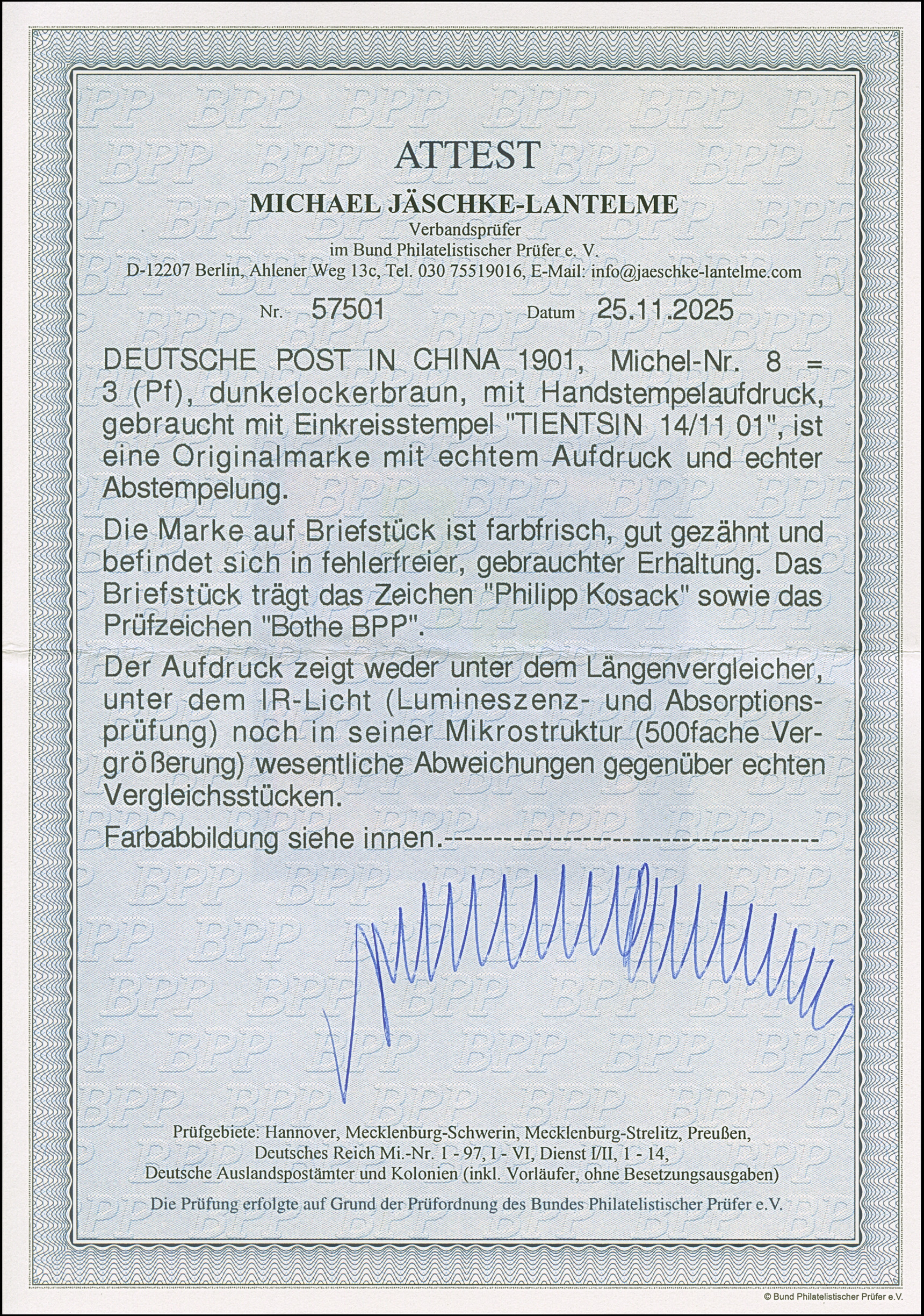 1900, Handstempel 3 Pfg. mit Stempel “TIENTSIN 14.11.01” auf Briefstück. Die farbfrische Marke ist gut gezähnt und in tadelloser Erhaltung. Ein sehr schönes Exemplar, sign. Phillipp Kosack und Bothe BPP sowie Fotoattest Jäschke-L. BPP (2025)