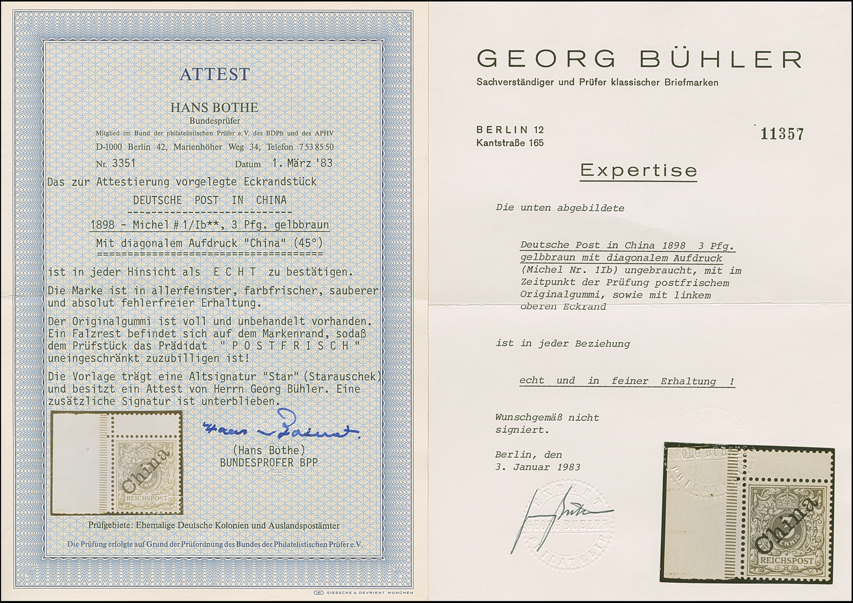 1898, Diagonaler Aufdruck: 3 Pfg. hellockerbraun, linkes Seitenrandstück mit Zwischenstegansatz oben, farbfrisch und gut gezähnt, postfrisch bzw. Falz im Rand, tadellos, sign. Star sowie Fotoattest Bühler (1983) und Bothe BPP (1983)