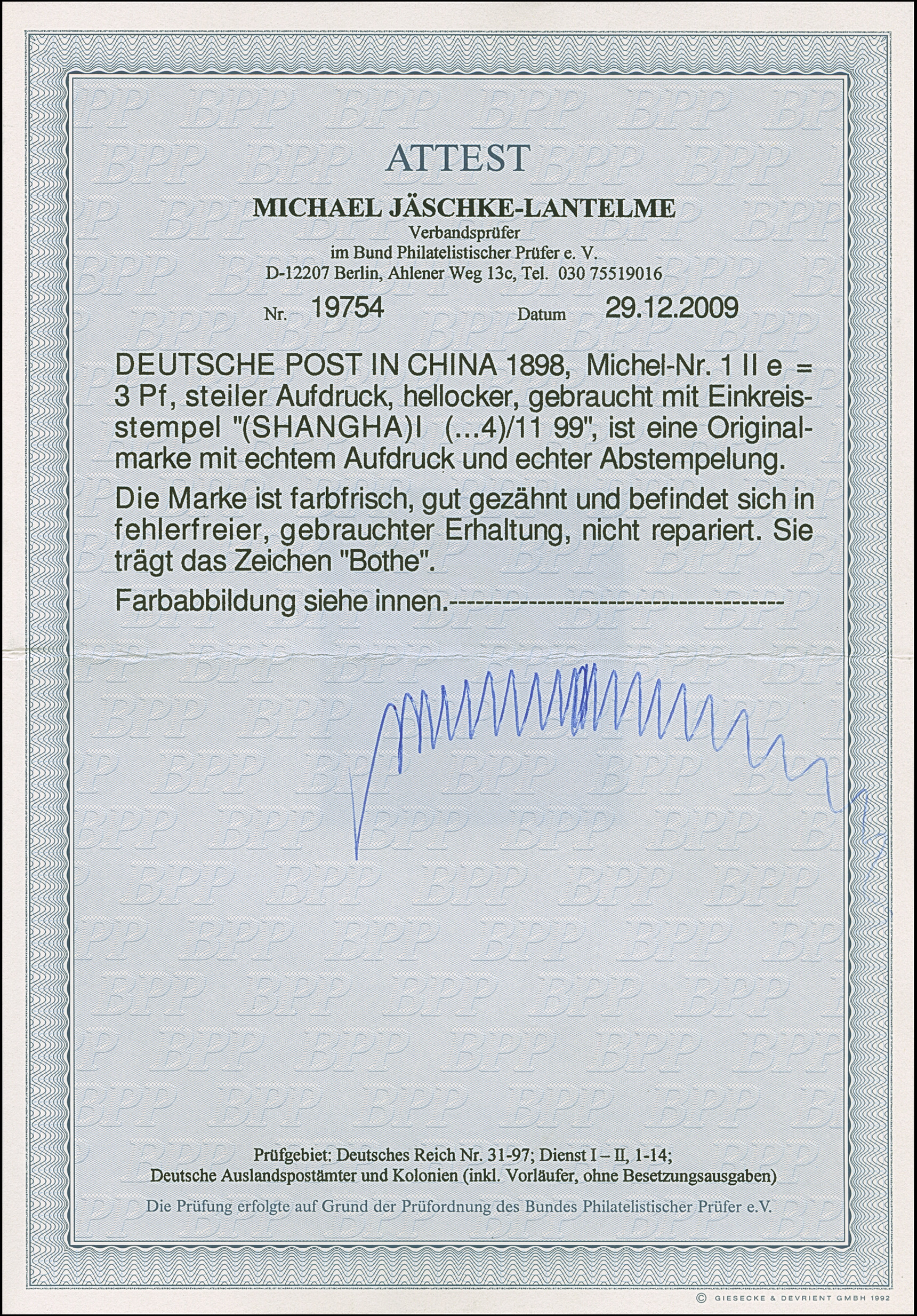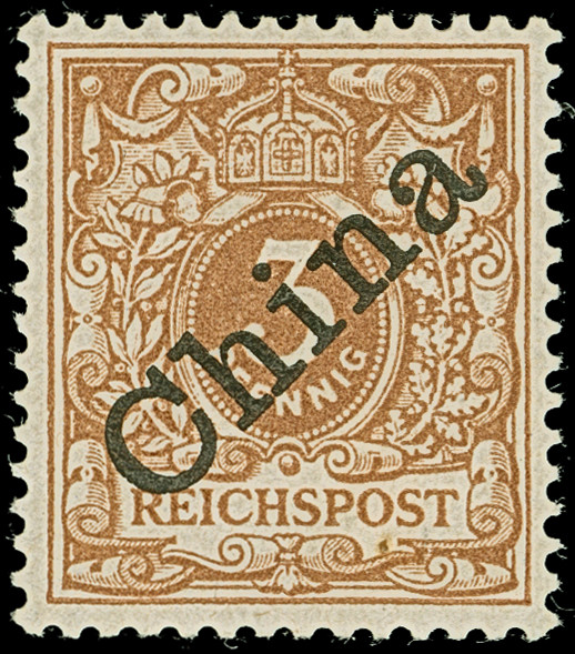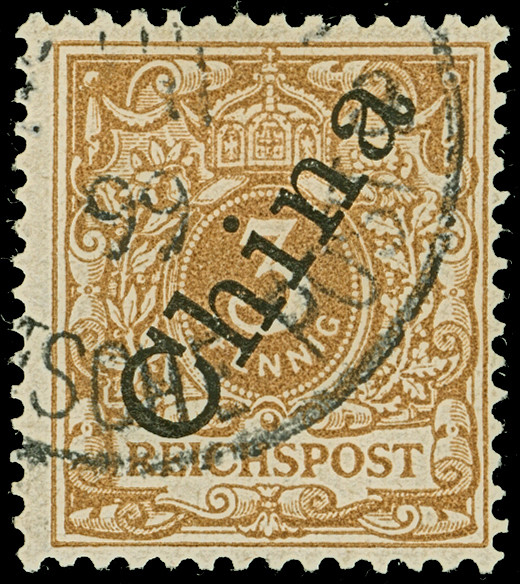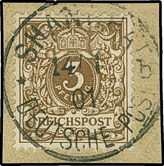 PETSCHILI: Krone/Adler 3 Pfg. dunkelockerbraun, farbfrisch und gut gezähnt, sauber mit klarem EKr. “SHANGHAI 14/1 01” auf Briefstück, tadellos, Ein schönes Exemplar dieser seltenen Farbvariante, u.a. sign. Bothe sowie Fotoattest Steuer BPP (2017)