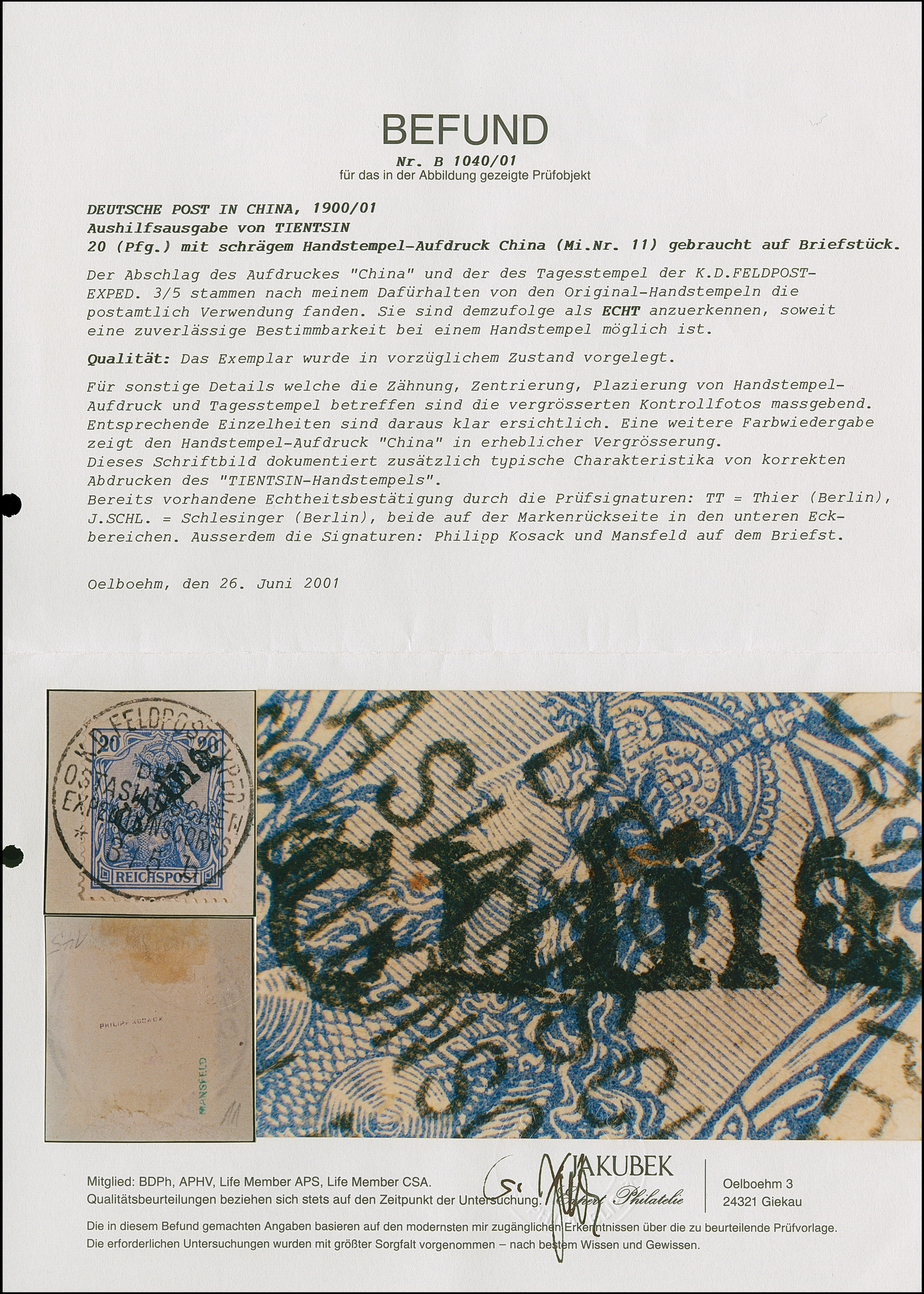 1900, Handstempel 20 Pfg., farbfrisch und gut gezähnt, sauber mit Stempel “K.D. FELDPOSTEXPED. DES OSTASIATISCHEN EXPEDITIONSCORPS *b 3.5.” auf Briefstück, tadellos, u,a, sign. Thier sowie Fotoattest Jakubek (2001)