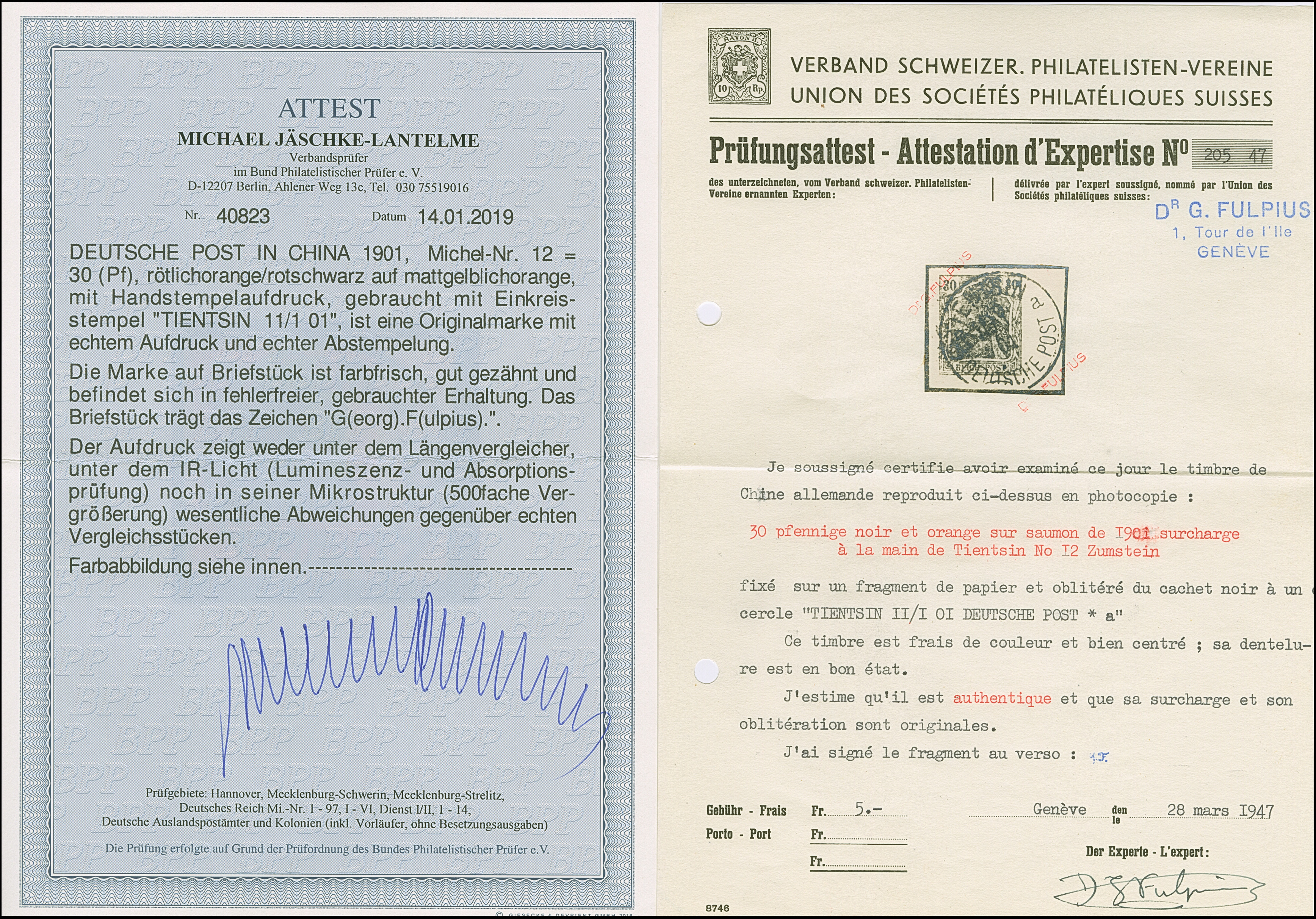 1900, Handstempel 30 Pfg., farbfrisch und gut gezähnt, sauber mit Stempel “TIENTSIN 11/1 01” auf Briefstück, tadellos, ein sehr schönes Exemplar dieser seltenen Marke, sign. G(eorg).F(ulpius) mit Fotoattest (1947) und Fotoattest Jäschke-L. BPP (2019)