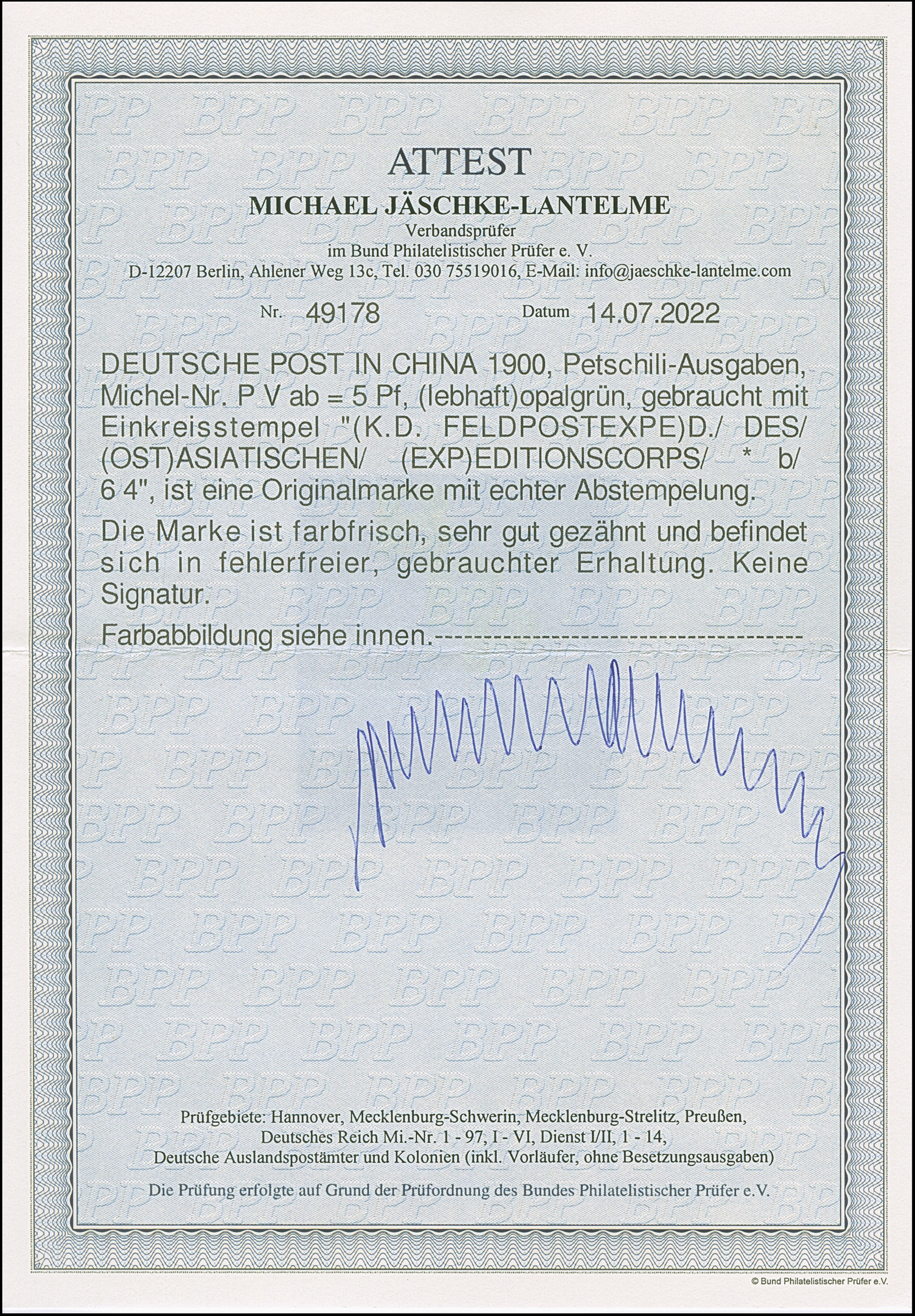 PETSCHILI: Krone/Adler 5 Pfg. opalgrün, farbfrisch und sehr gut gezähnt, sauber mit Teilstempel “K.D. FELDPOSTEXPEDITION” entwertet, tadellos, Fotoattets Jäschke-L. BPP (2022)