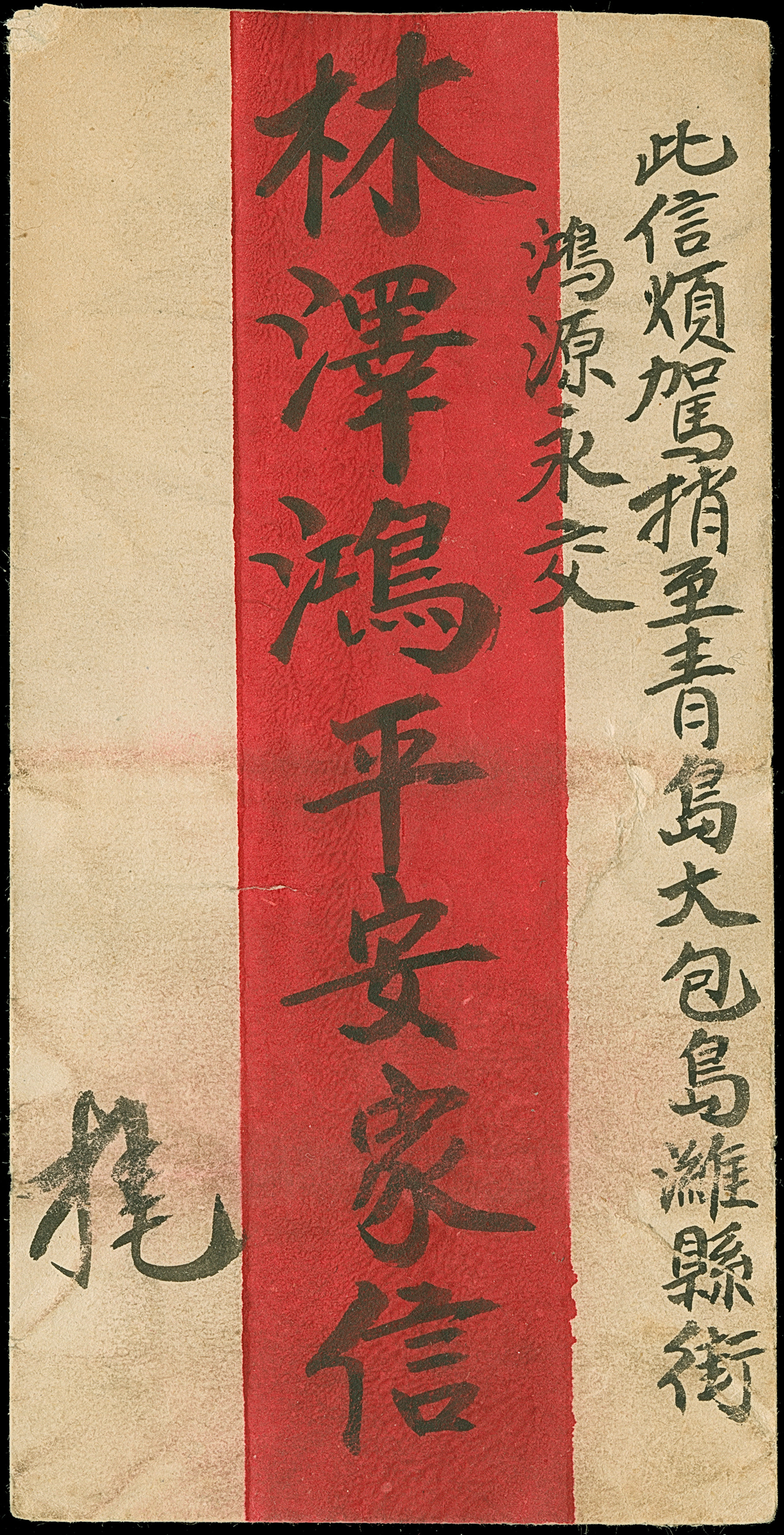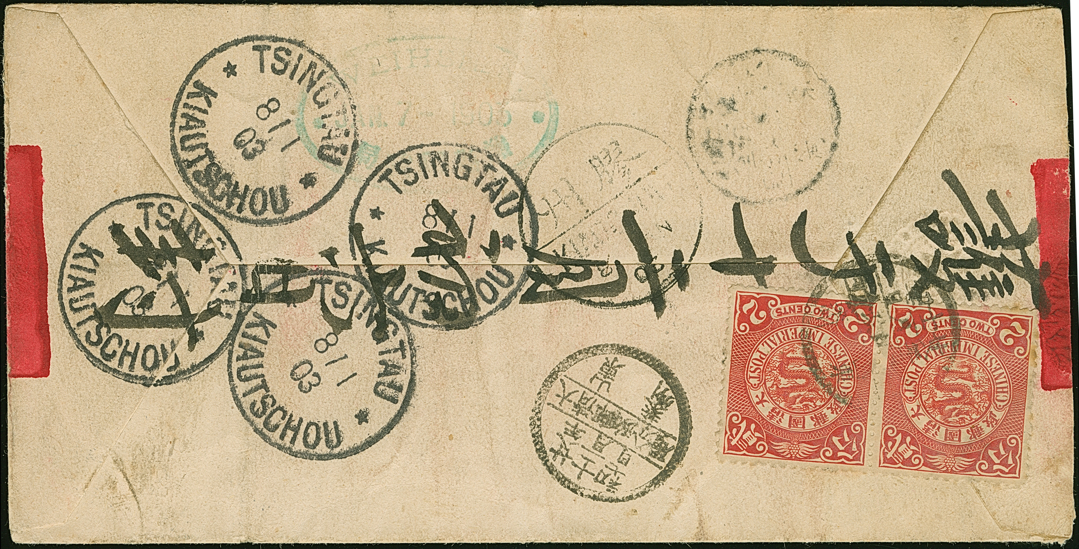 1903, Coiling Dragon 2 c. red, pair tied on double rate redband cover by fancy type cancel from Great P.O. Tsing Laichow Province Shantung 28th year 12th month 17th day, transit mark mark Kiangchow alongside, to Weihsien with bilingual oval WEIHSIEN 7/JAN/1903 ds. and 4 x German P.O. "TSINGTAU KIAUTSCHOU 8/1/03" arrival mark, tiny crease, otherwise fine. The cover with content is forwarded by Huangyuan Yong to Tsingtau Tapautau, attractive and scarce