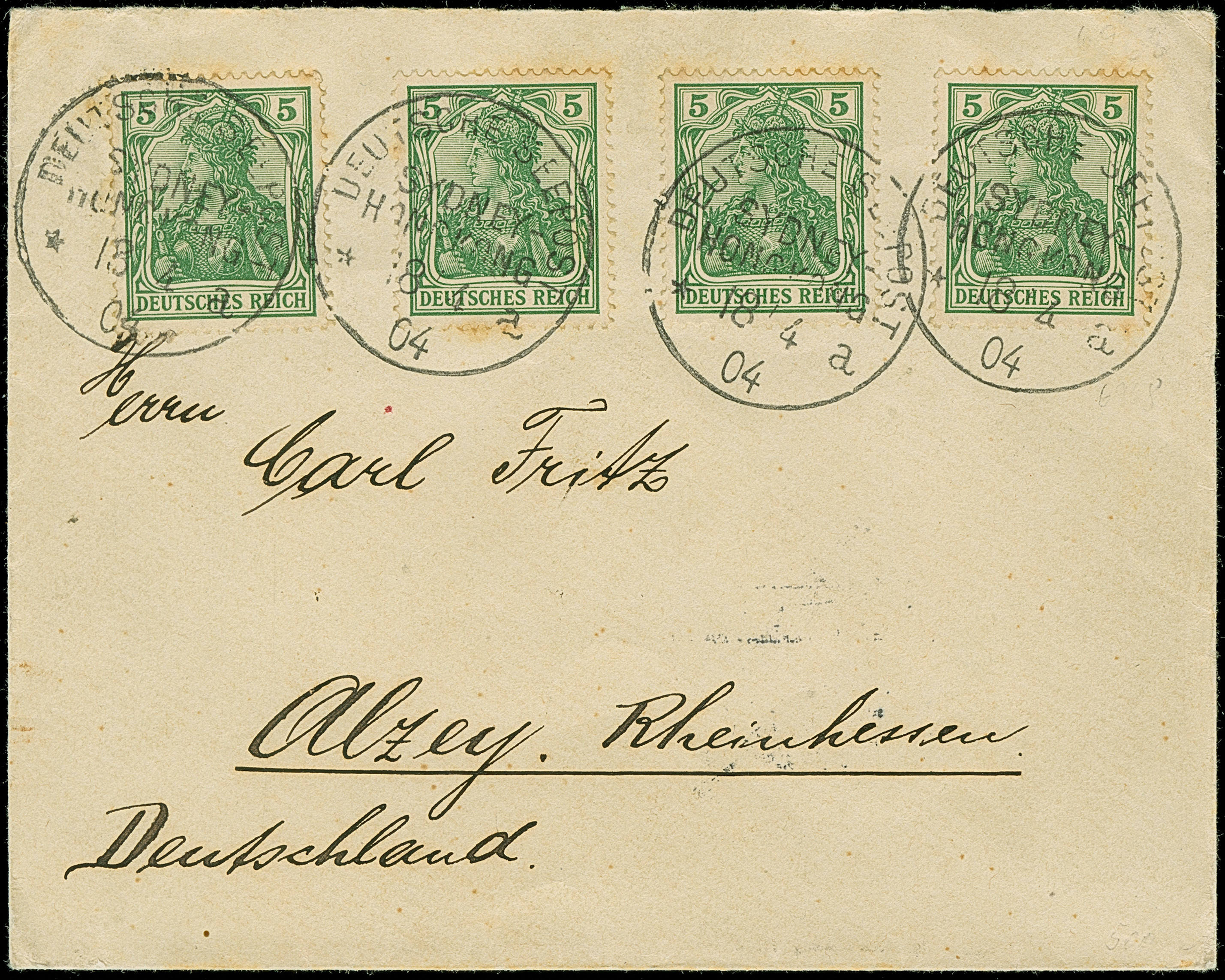 “DSP SYDNEY-HONGKONG *a 18.,4.04” (D. Medan), viermla klar auf vier Einzelmarken Germania 5 Pfg. als tarifgerechte Mehrfachfrankatur auf Brief nach Alzey mit Ankunftsstempel. Die Marken zum Teil mit Gelbflecken, ansonsten in guter Erhaltung. Ein seltener Schiffspoststempel aus der Südsee