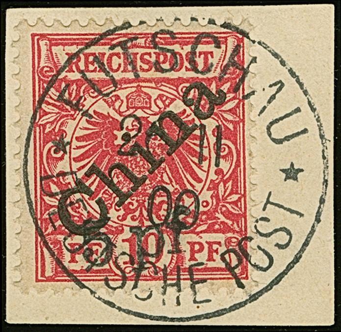 1900, Futschau Provisorium mit diagonalem Aufdruck 5 pf. auf 10 Pfg., sauber mit klarem EKr. “FUTSCHAU 26/11 00” auf Briefstück, tadellos, u.a. sign. Köhler sowie Fotoattest Jäschke-L. BPP (2014)