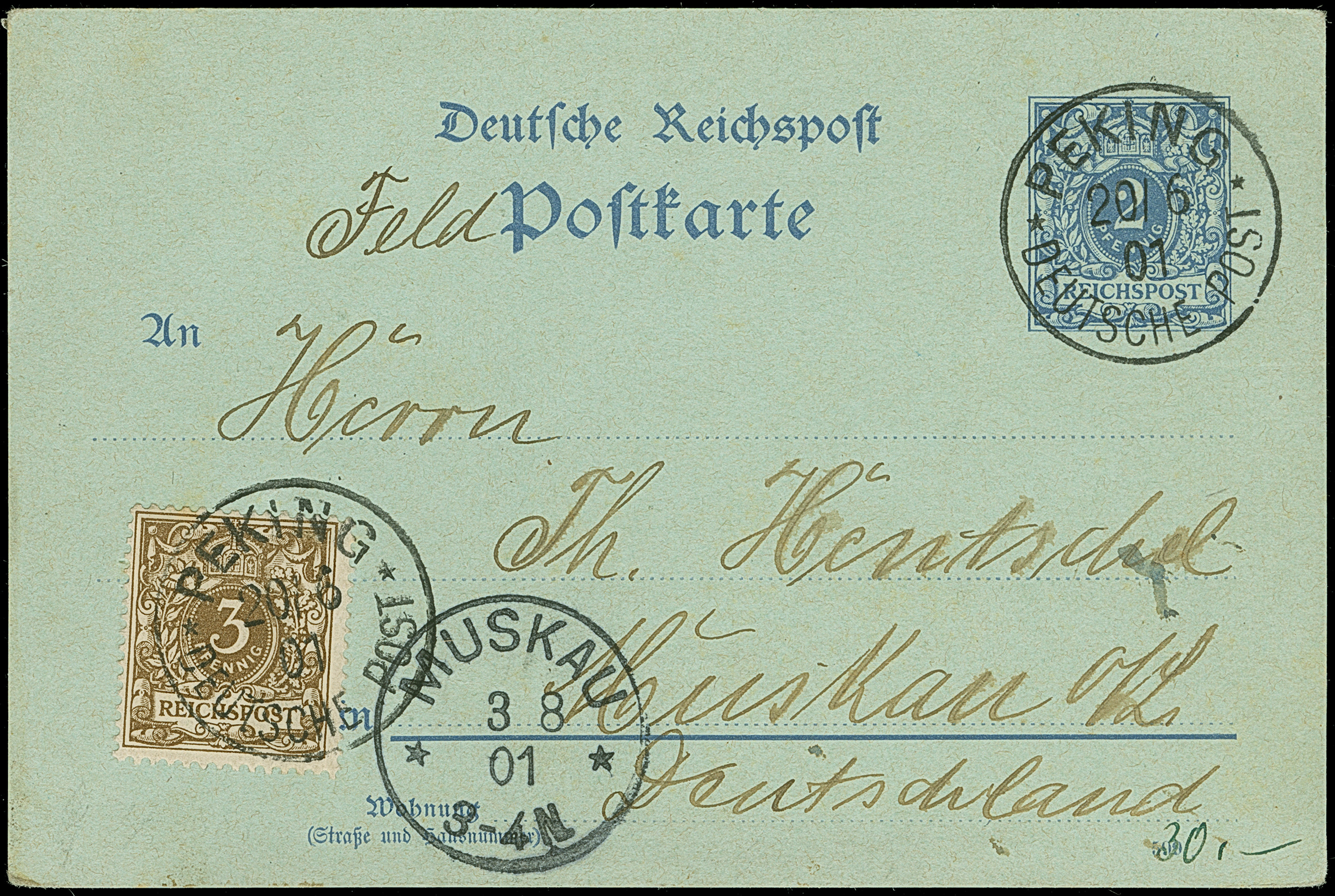 Krone/Adler 3 Pfg. dunkelockerbraun auf Ganzsachenkarte 2 Pfg. jeweils mit klarem EKr. “PEKING DP 20.6.01” und rückseitigem Text nach Muskau mit vorderseitigem Ankunftsstempel. Die Karte rückseitig mit Falzresten, die farbfrische Marke ist gut gezähnt und in einwandfreier Erhaltung, sign. Dr. Steuer BPP