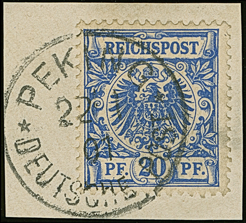 Krone/Adler 20 Pfg. mit klarem EKr. “PEKING DP 22.1.01” auf Briefstück. Die farbfrische Marke ist gut gezähnt und in einwandfreier Erhaltung, sign. Dr. Lantelme