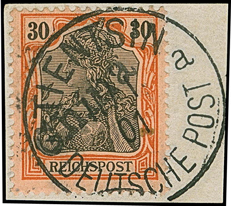 1900, Handstempel 30 Pfg. mit klarem Stempel “TIENTSIN DP *a 22.2.01” auf Briefstück. Die farbfrische Marke ist zum Teil üblich gezähnt und in einwandfreier Erhaltung. Ein außergewöhnlich schönes Exemplar dieser seltenen Marke, sign. Bothe BPP und Fotoattest Jäschke-L. BPP (2008)