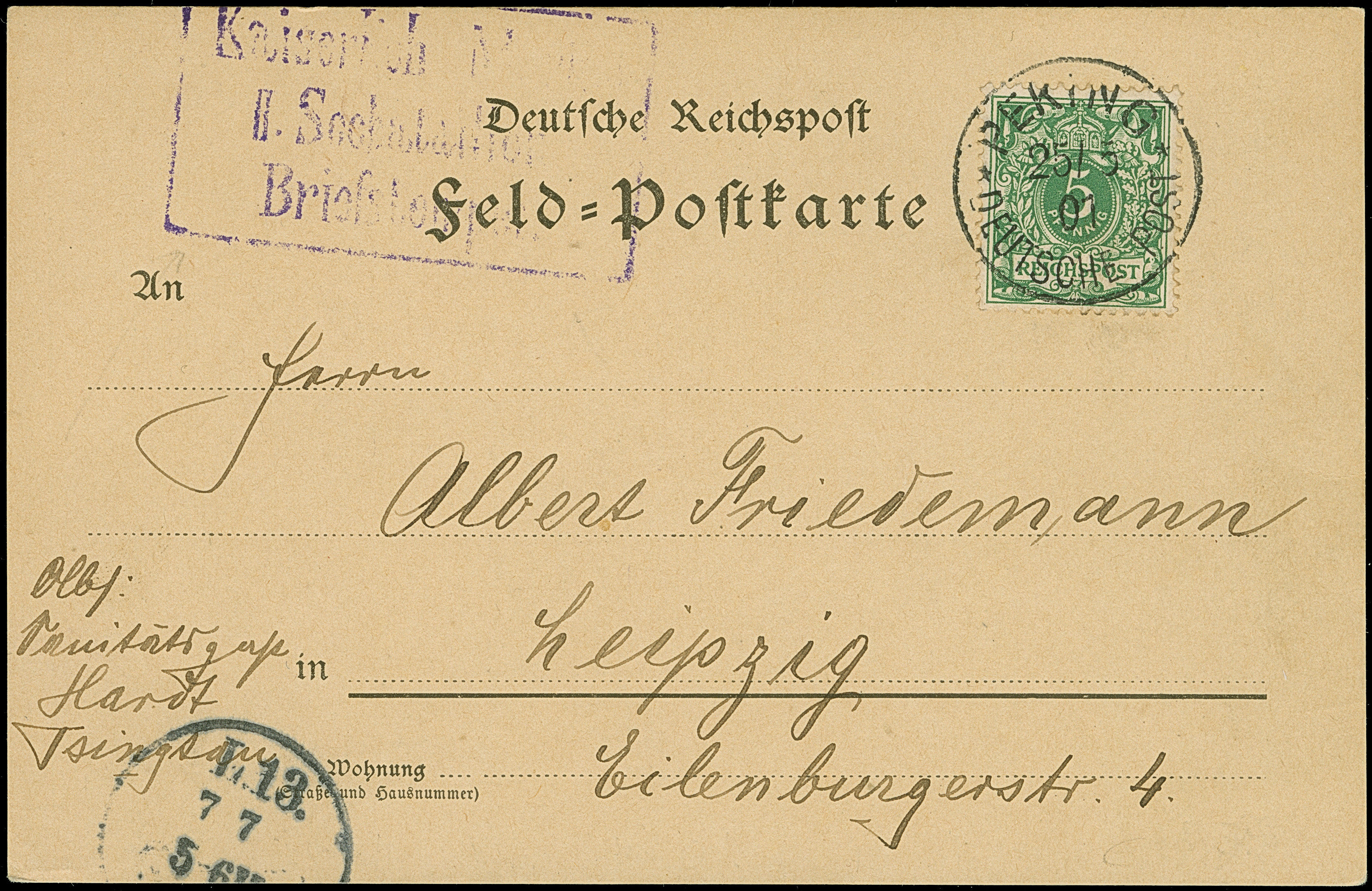 PETSCHILI: Krone/Adler 5 Pfg. opalgrün, farbfrisch und sehr gut gezähnt, sauber mit Stempel “PEKING 25/5 01” auf Karte mit nebengesetztem Briefstück “Kaiserlich Marine II. Seebatalloins", adressiert an Albert Friedemann nach Leipzig, tadellos, selten, sign. Kilian